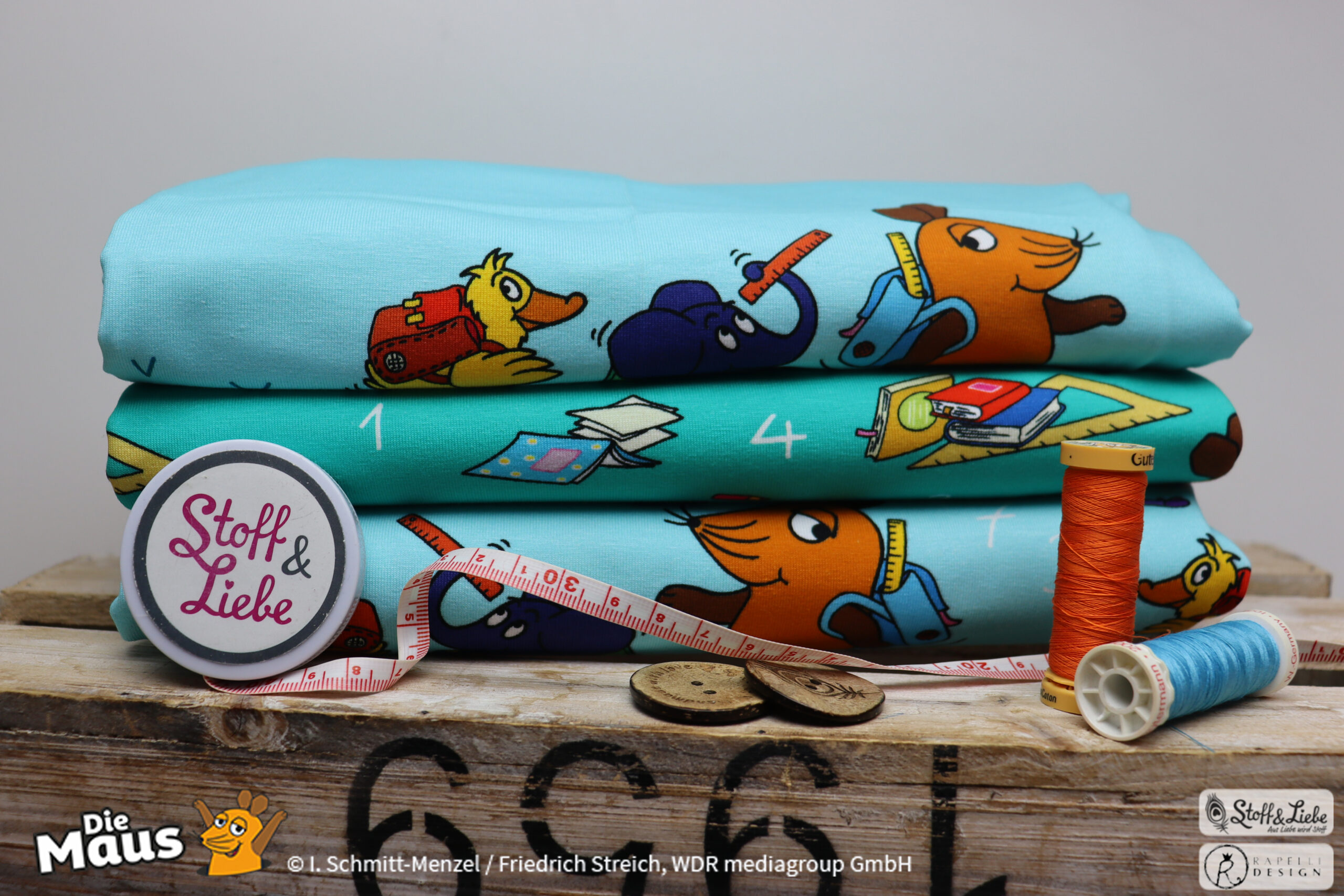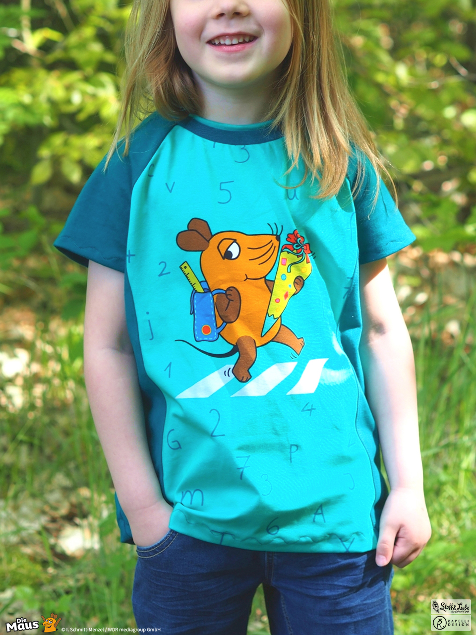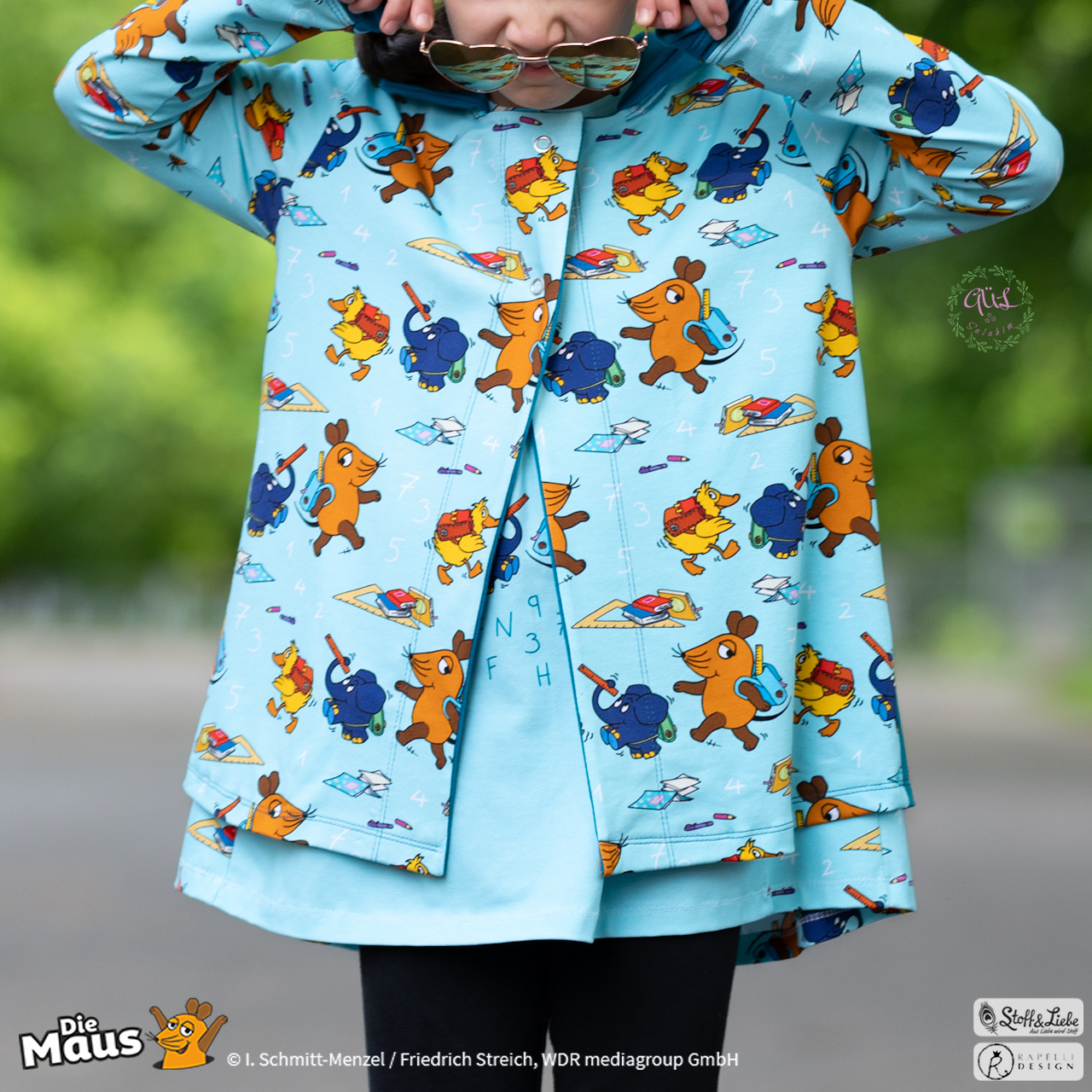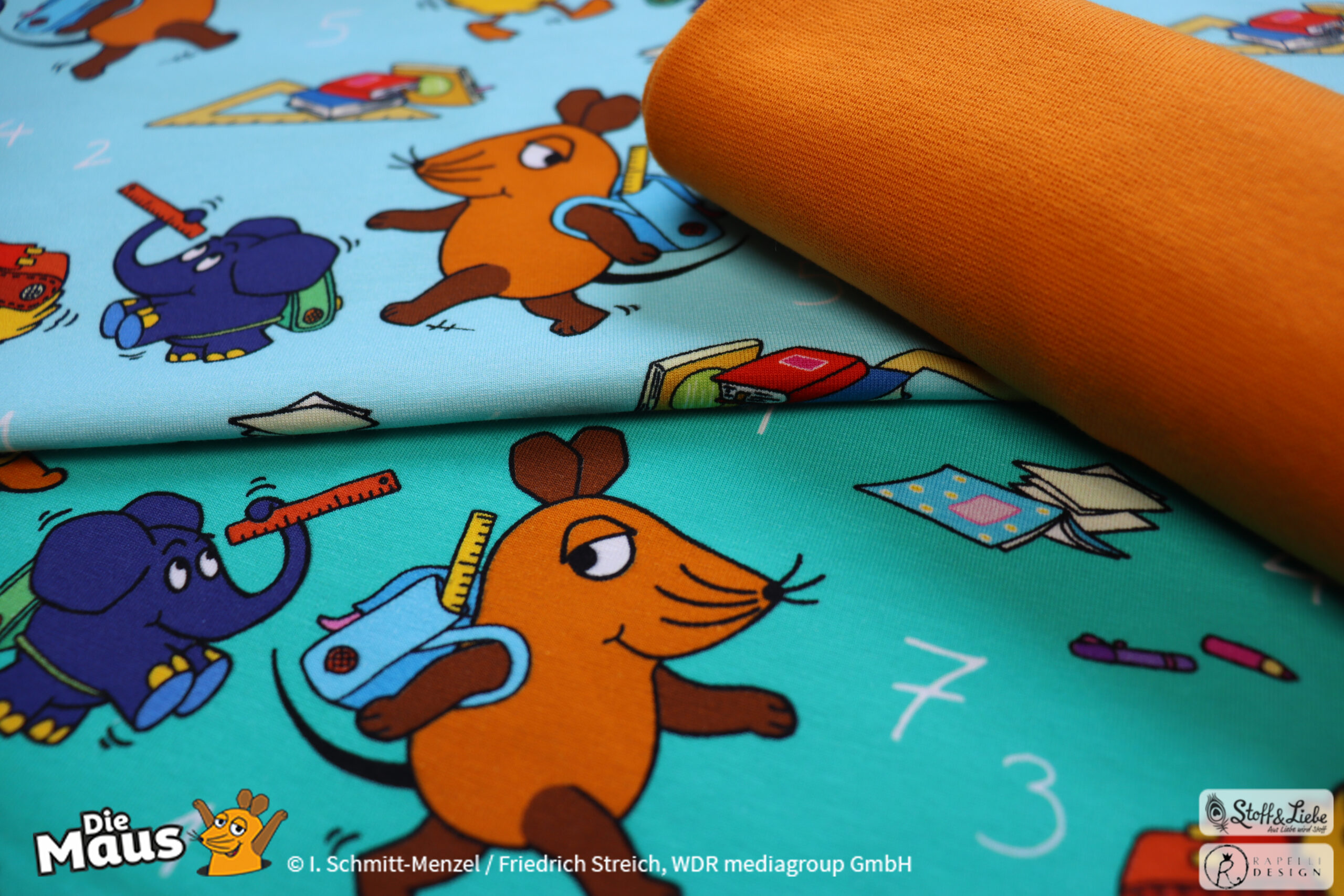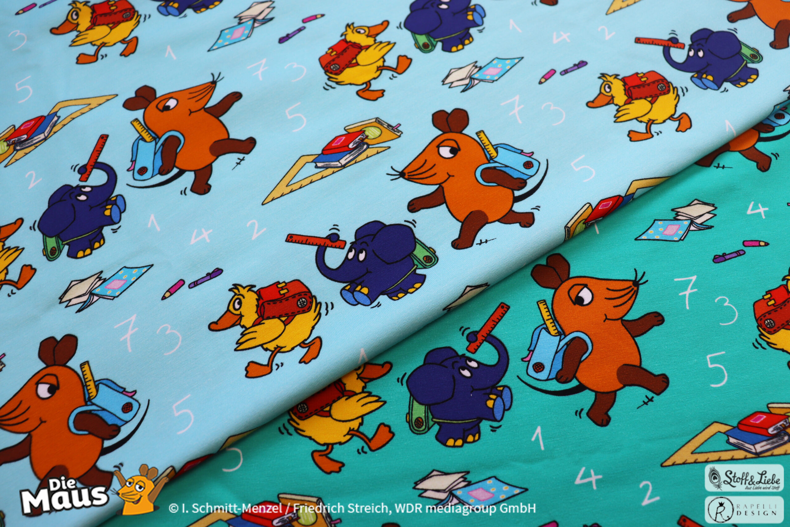 Unsere „DieMaus – Hurra! Endlich Schule“ wurde umgesetzt von Rapelli Design. Zu diesem Design gehört ein Panel sowie ein Allover in zwei Farvarianten. Die Stoffe bekommt Ihr auf Jersey in unserer bekannten Spitzenqualität.