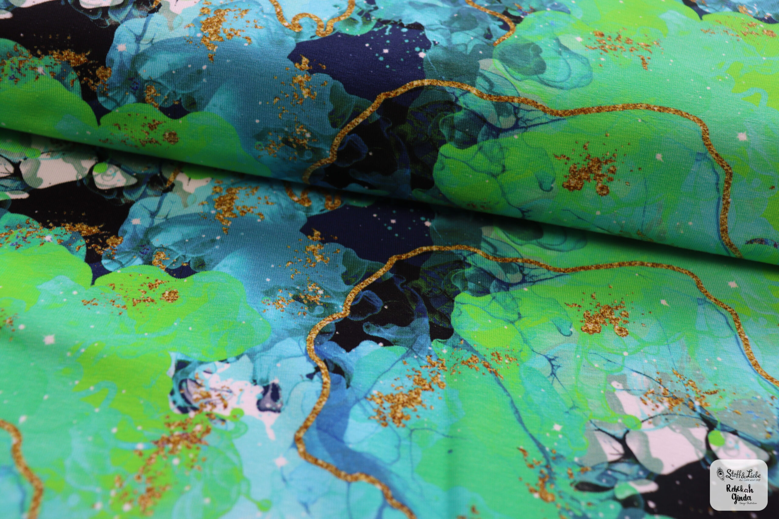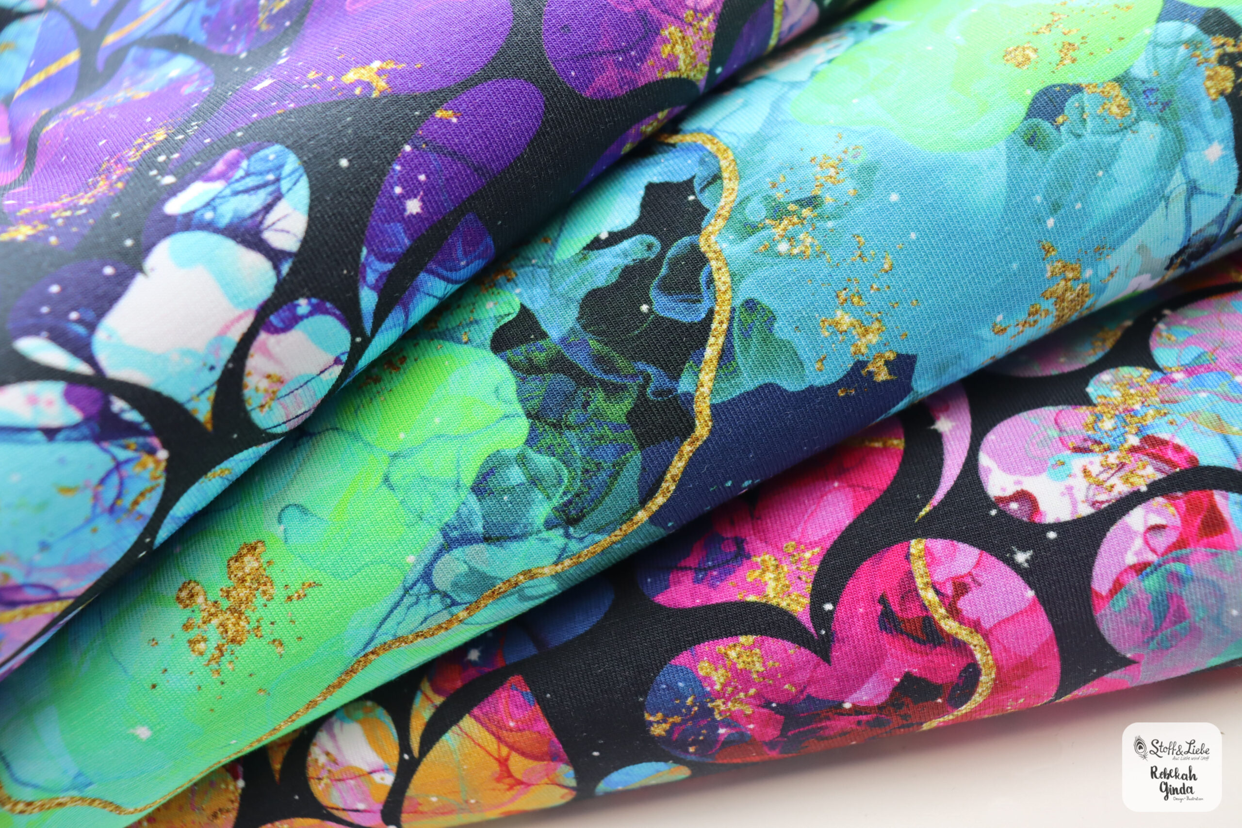 Unsere „Tintenwolken II“ Kollektion besteht aus drei wahnsinnig tollen Farbvarianten auf Jersey: Pink, Lila und Grün. Unverkennbar aus der Feder von Rebekah Ginda.