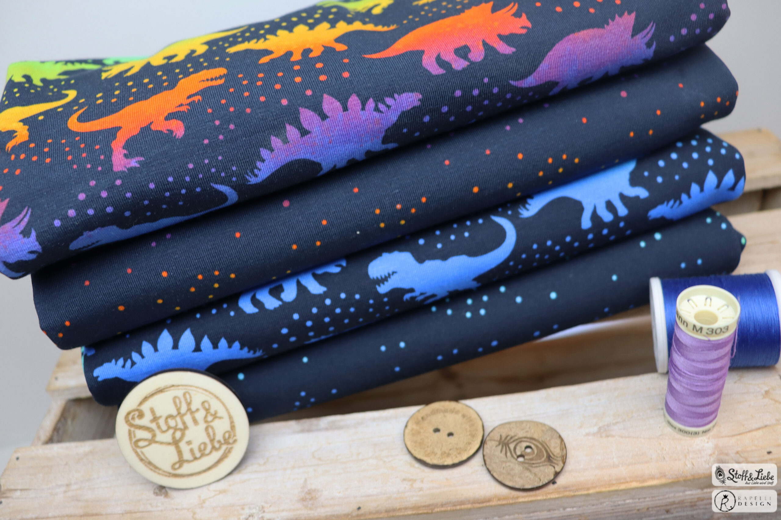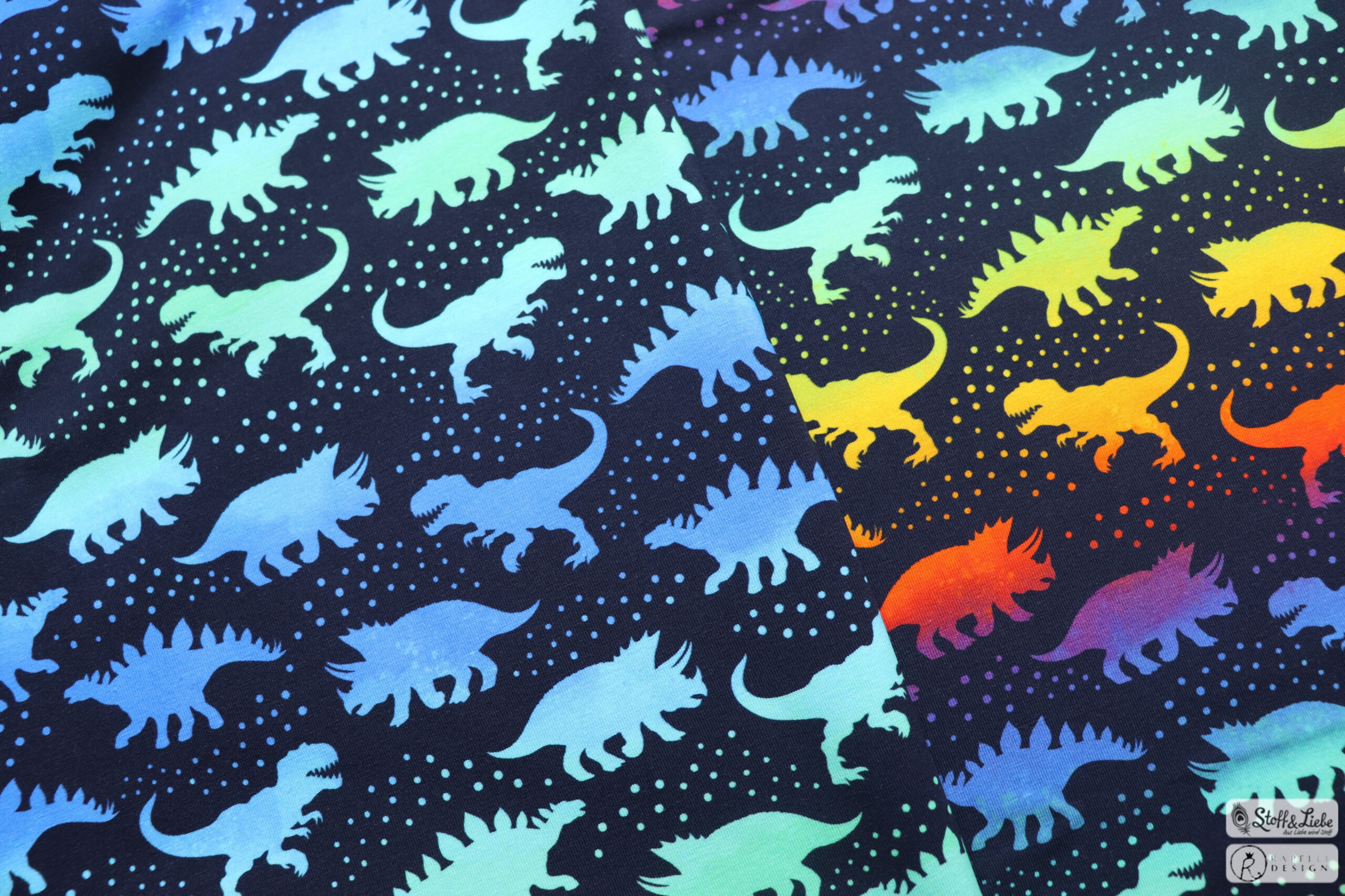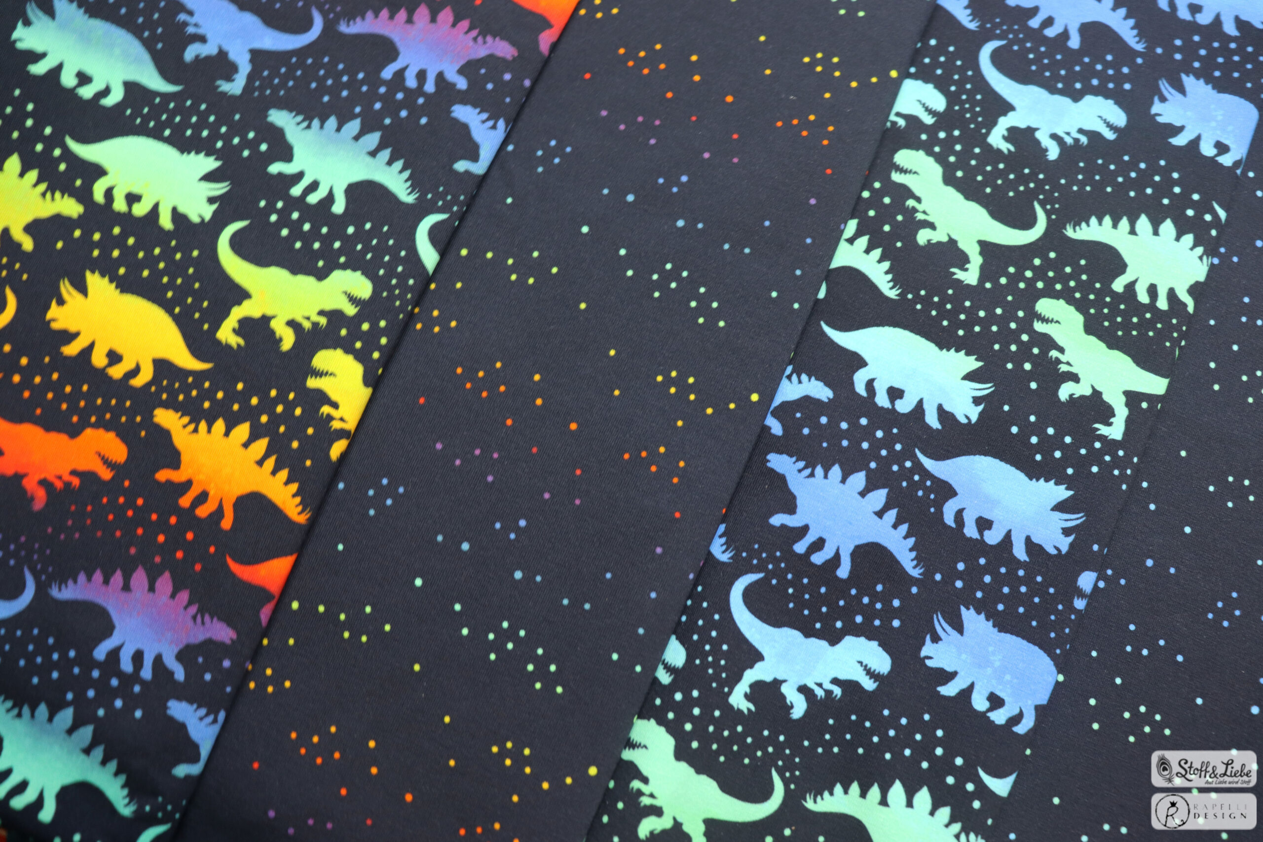 Unser Design „Dreamland Dinos“ stammt, wie schon die Dreamland Horses, aus der Feder von Rapelli Design und bringt Euch ingesamt vier Stoffe auf Jersey in zwei wundervollen Farbstellungen mit: Blue und Rainbow. Die Materialzusammensetzung liegt bei 95 % Baumwolle und 5% Elasthan.