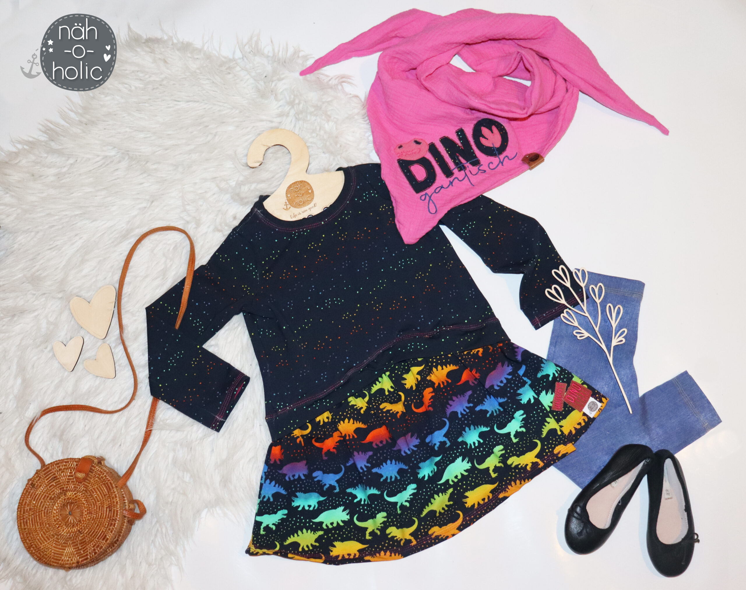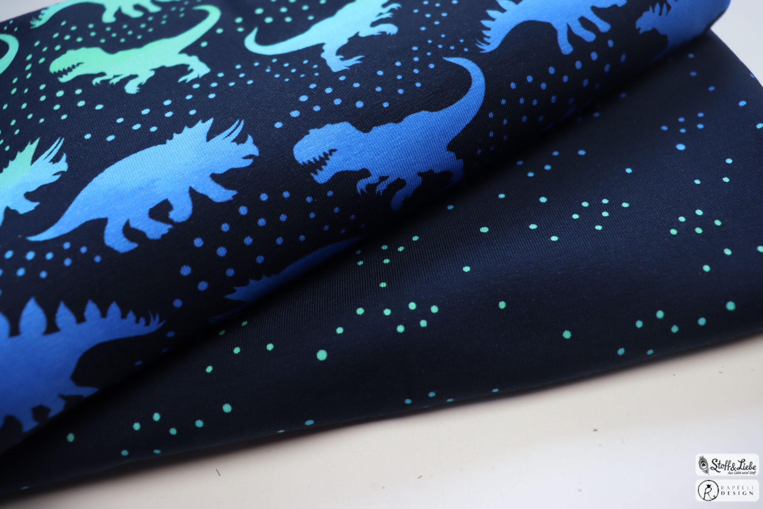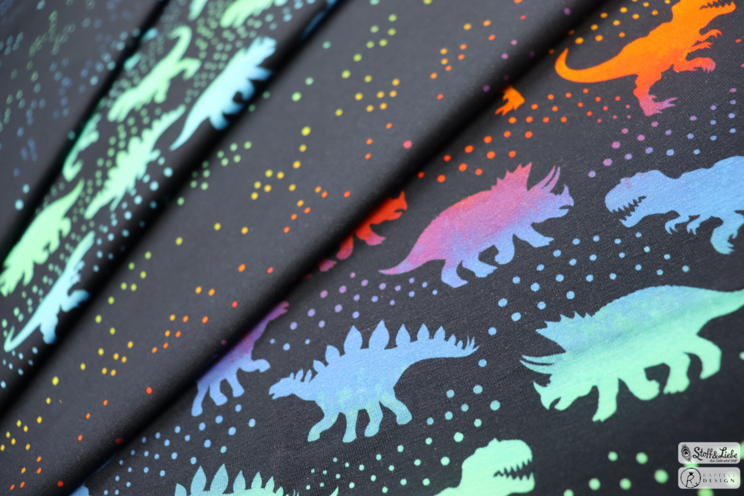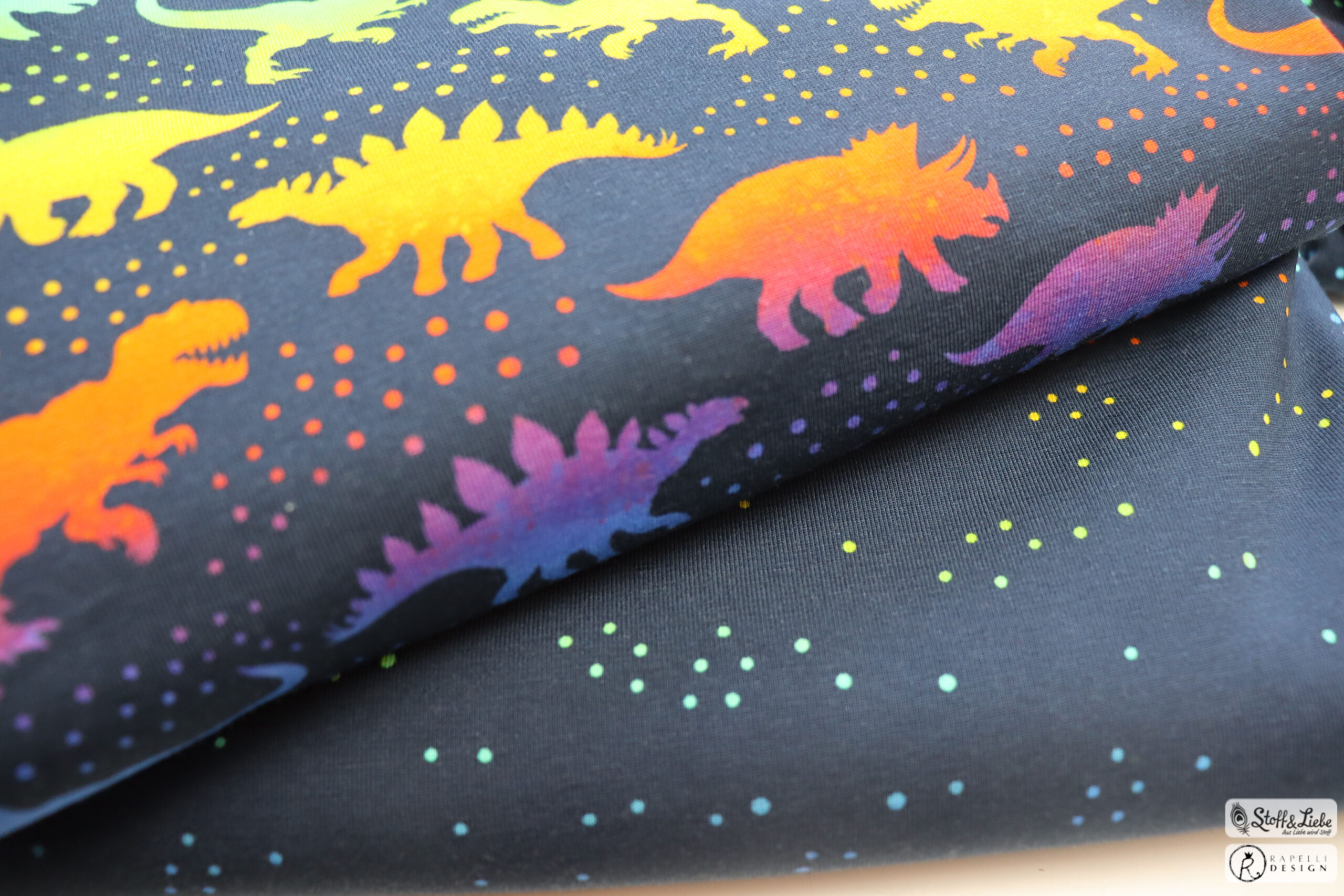 Unser Design „Dreamland Dinos“ stammt, wie schon die Dreamland Horses, aus der Feder von Rapelli Design und bringt Euch ingesamt vier Stoffe auf Jersey in zwei wundervollen Farbstellungen mit: Blue und Rainbow. Die Materialzusammensetzung liegt bei 95 % Baumwolle und 5% Elasthan.