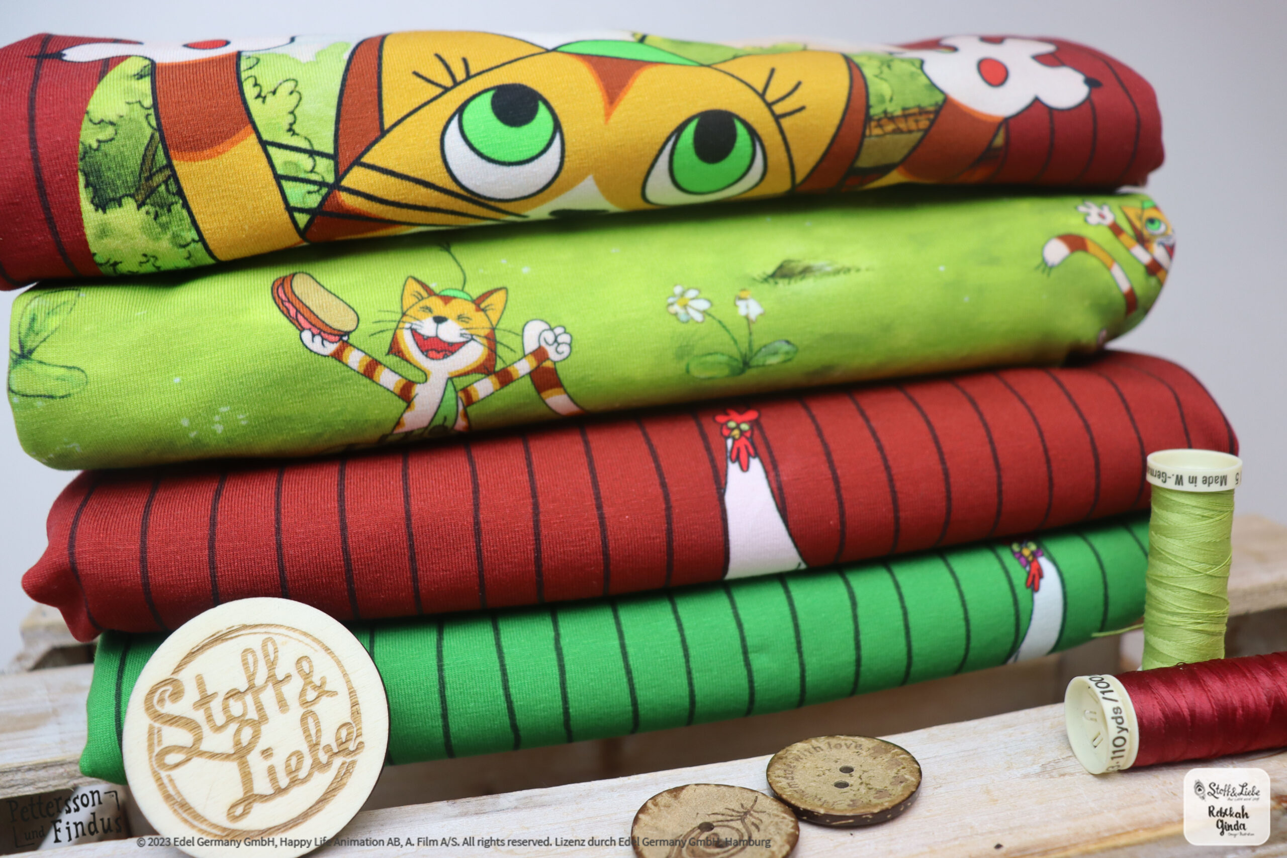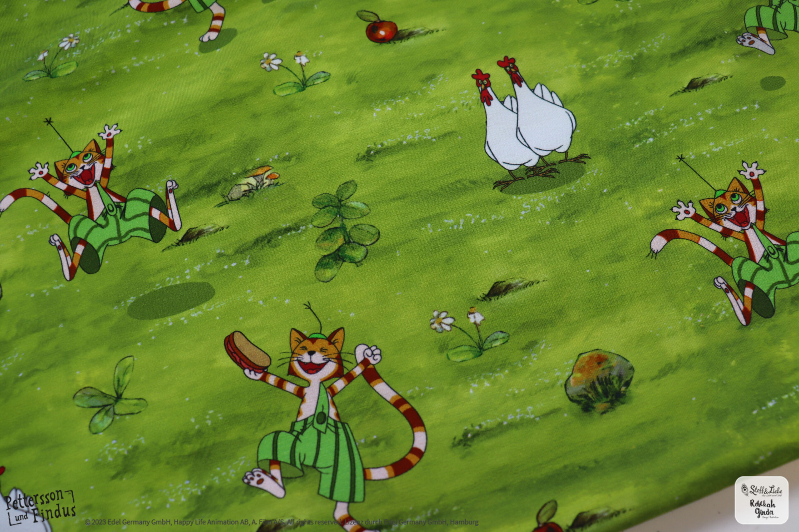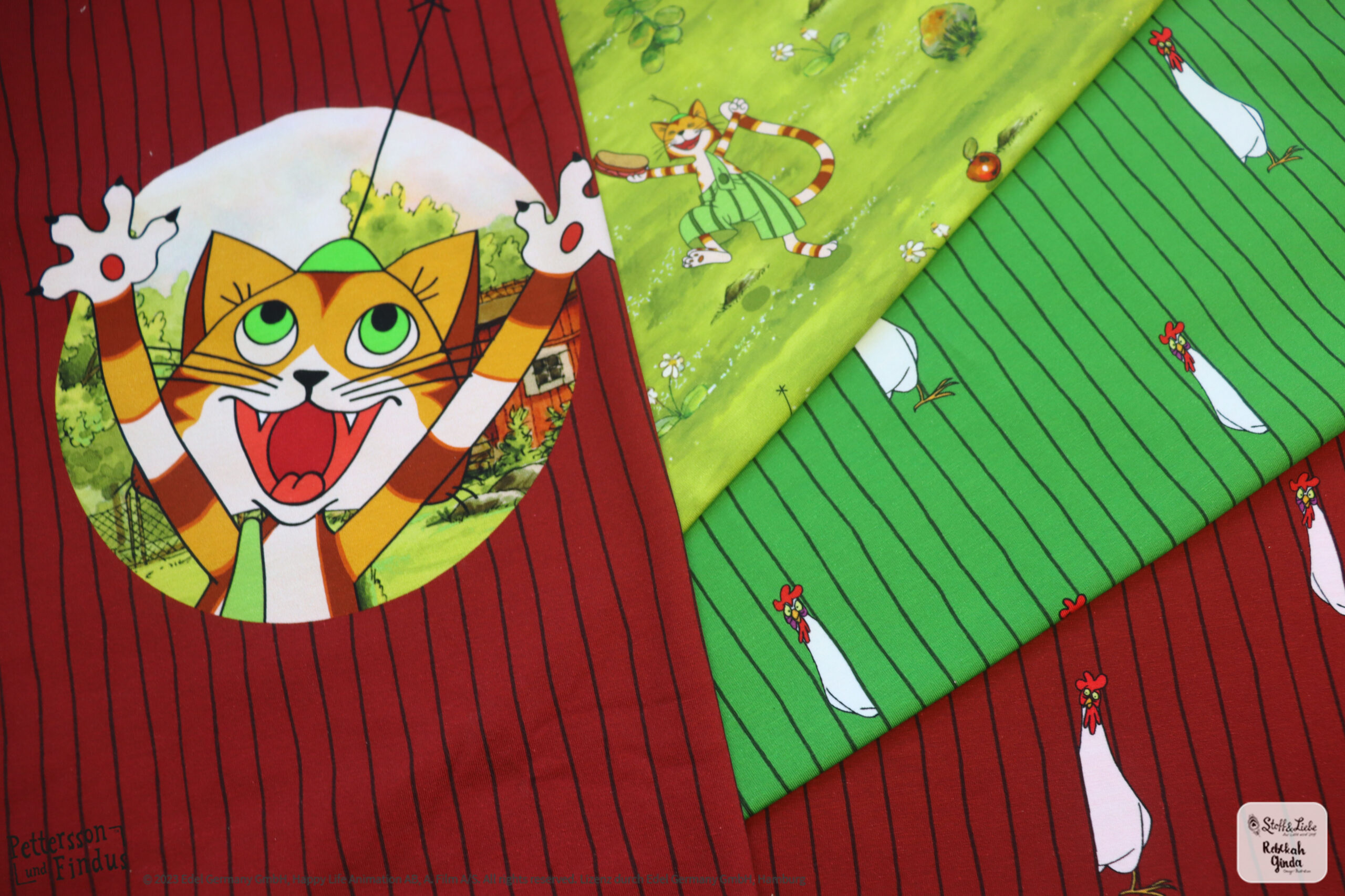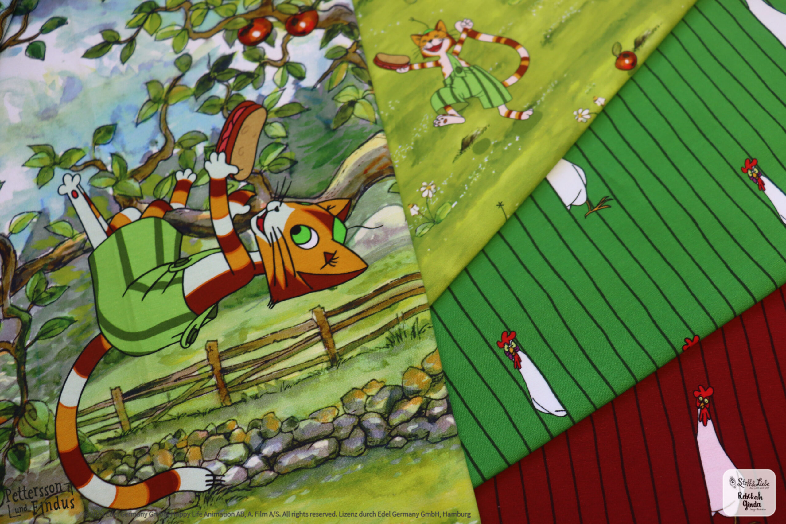 Bei den äußeren Motiven ist der Hintergrund wieder in Holzoptik gehalten. Dadurch entsteht ein ganz besonderer Look, der zum kreativ werden und kombinieren mit verschiedenen Stoffen einlädt. Das mittlere Motiv zeigt eine typische Findus Szene, wie sie sich auch in einem der Bücher oder Filme finden lässt.