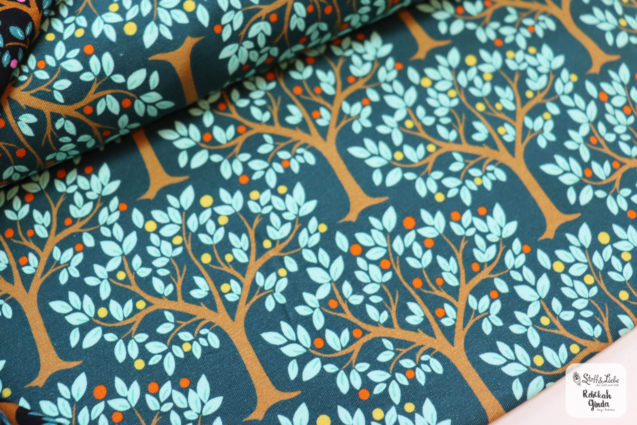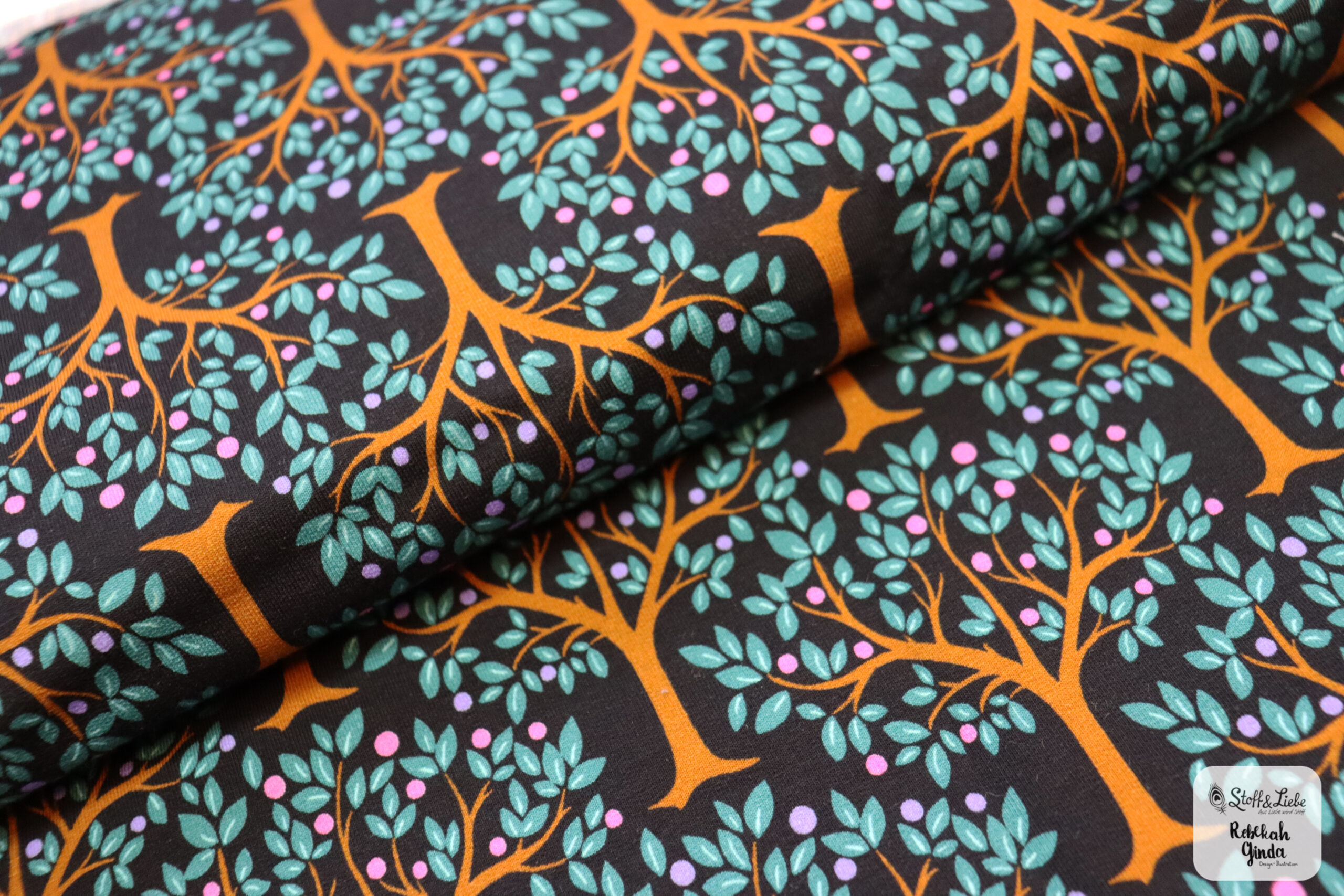 Diese großartige Kollektion besteht aus einem Hauptstoff und einem passenden Kombistoff in zwei Farbvarianten. Die Farbvariante Petrol wird auf Jersey erhältlich sein und die Variante in Schwarz auf French Terry. Umgesetzt wurde dieses Design von Rebekah Ginda.