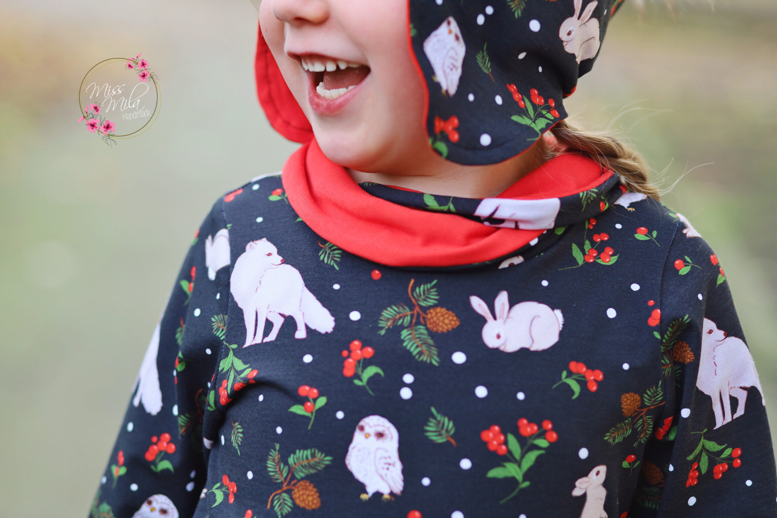 Übrigens damit Ihr Euch so richtig in diese Stoffe einkuscheln könnt, haben wir dieses Designs diesmal in Schwarz auf Kuschelsweat und in Blau auf French Terry für Euch.