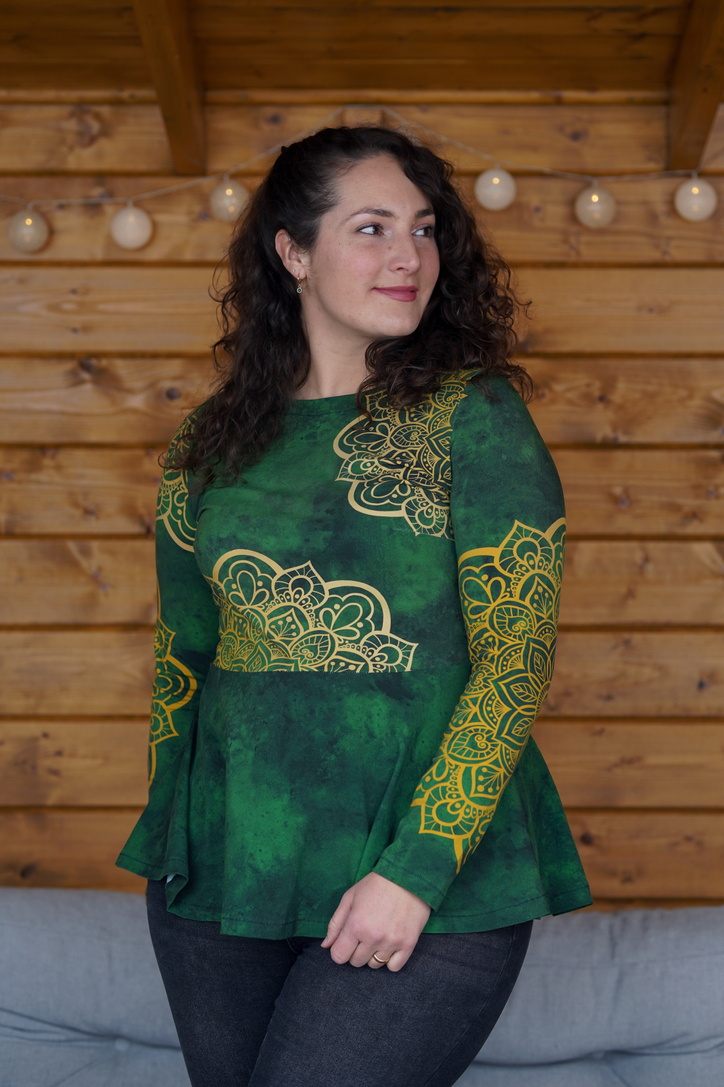 Auf den nachfolgenden Grafiken könnt Ihr einmal die Anordnung der Mandalas sehen. Die Höhe der Mandals beträgt ca. 36 cm (klein) und ca. 46. cm (groß). Wir haben uns bewusst für diese Größe entschieden, damit das Motiv vielfältig eingesetzt werden und wirken kann. Durch die Größe habt Ihr unzählige Möglichkeiten für den Zuschnitt Eurer Nähwerke. Je nachdem wie Ihr Eure Schnittteile anordnet, wirken die Mandalas immer wieder anders. Schaut Euch gerne weiter unten die verschiedenen Designbeispiele an. Die Stoffe wurden hier auf verschiedene Arten vernäht und geben einen wunderbaren Einblick, was mit diesen Stoffen möglich ist.