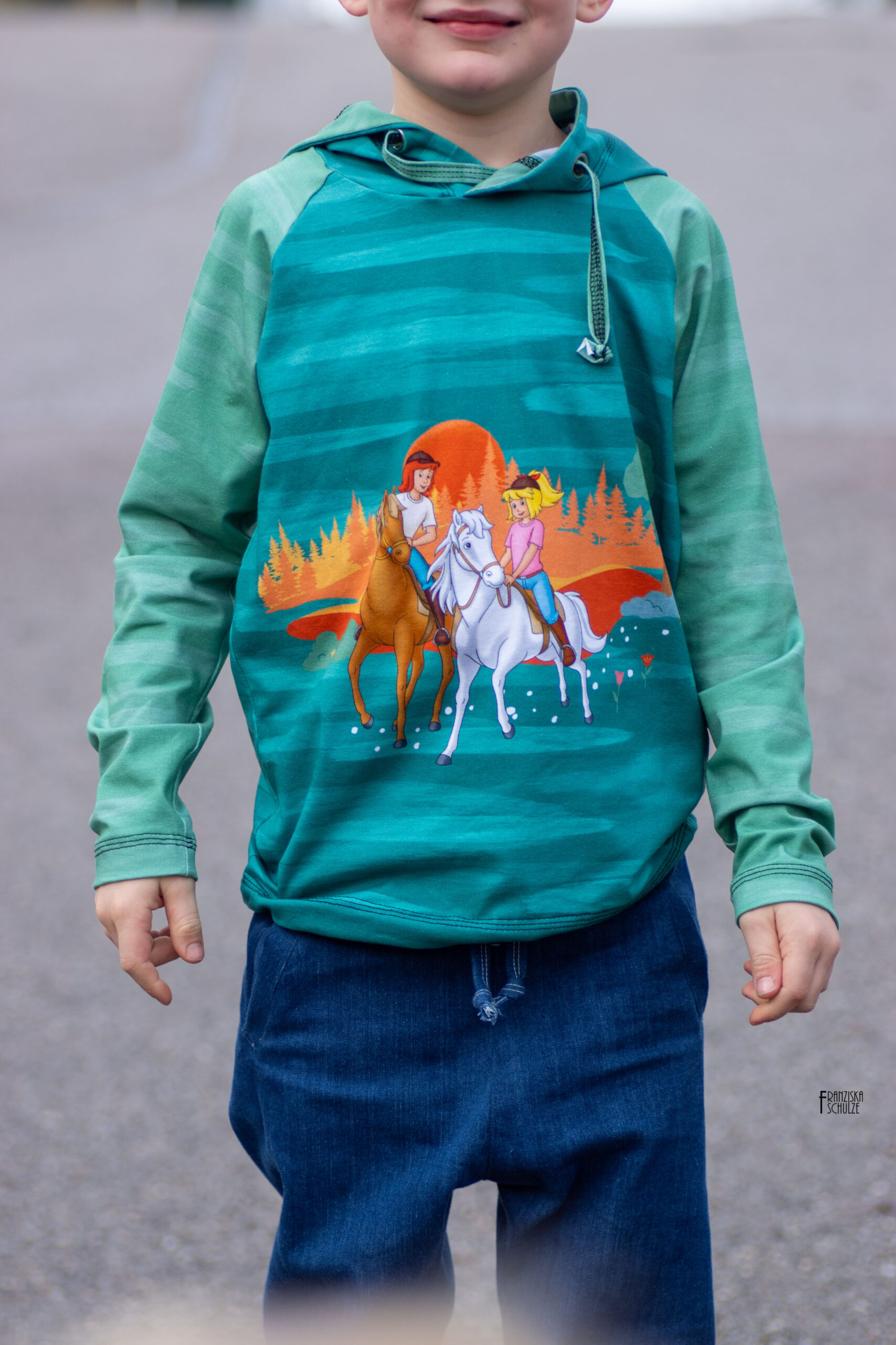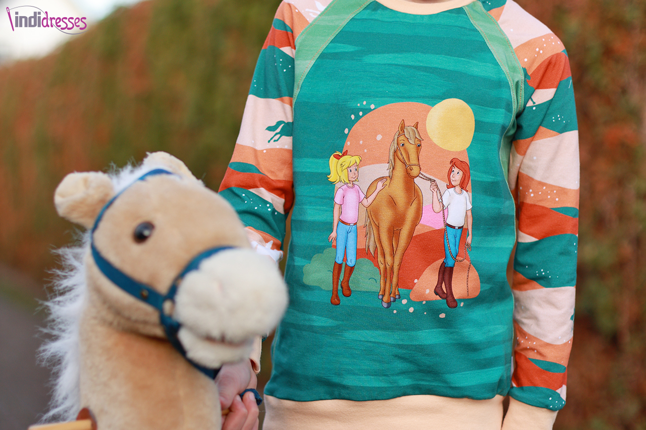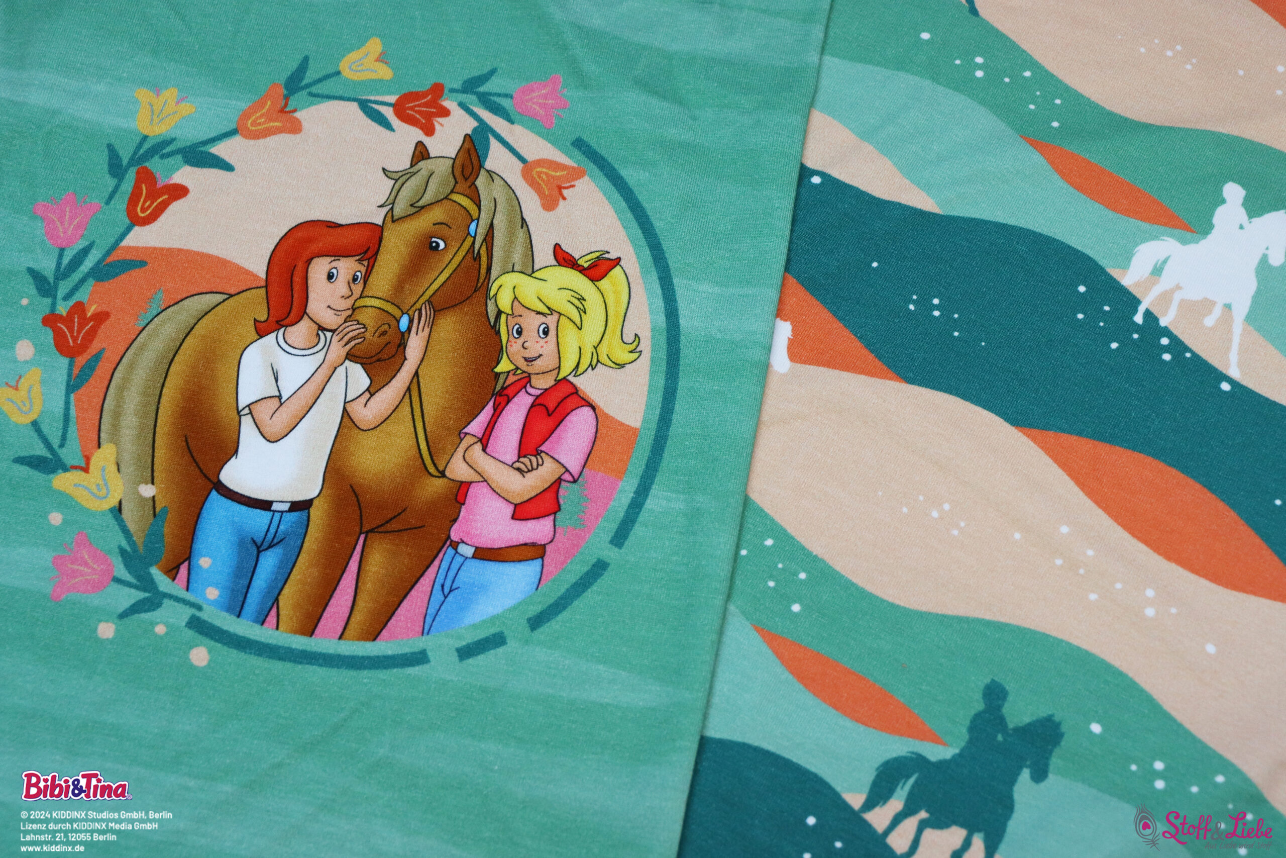 Auf Euch warten die Kollektion „Pferdemädchen“ und „Wildfang“, jeweils mit Panel, Allover und perfekt passenden Kombistoffen. Hier könnt Ihr Euren Bibi & Tina Fans die schönsten Teile nähen und Wünsche rund um Ihre Lieblinge erfüllen. Jetzt ist es aber an der Zeit Euch alle Designs einmal vorzustellen. Wir sind gespannt, wie sie Euch gefallen!