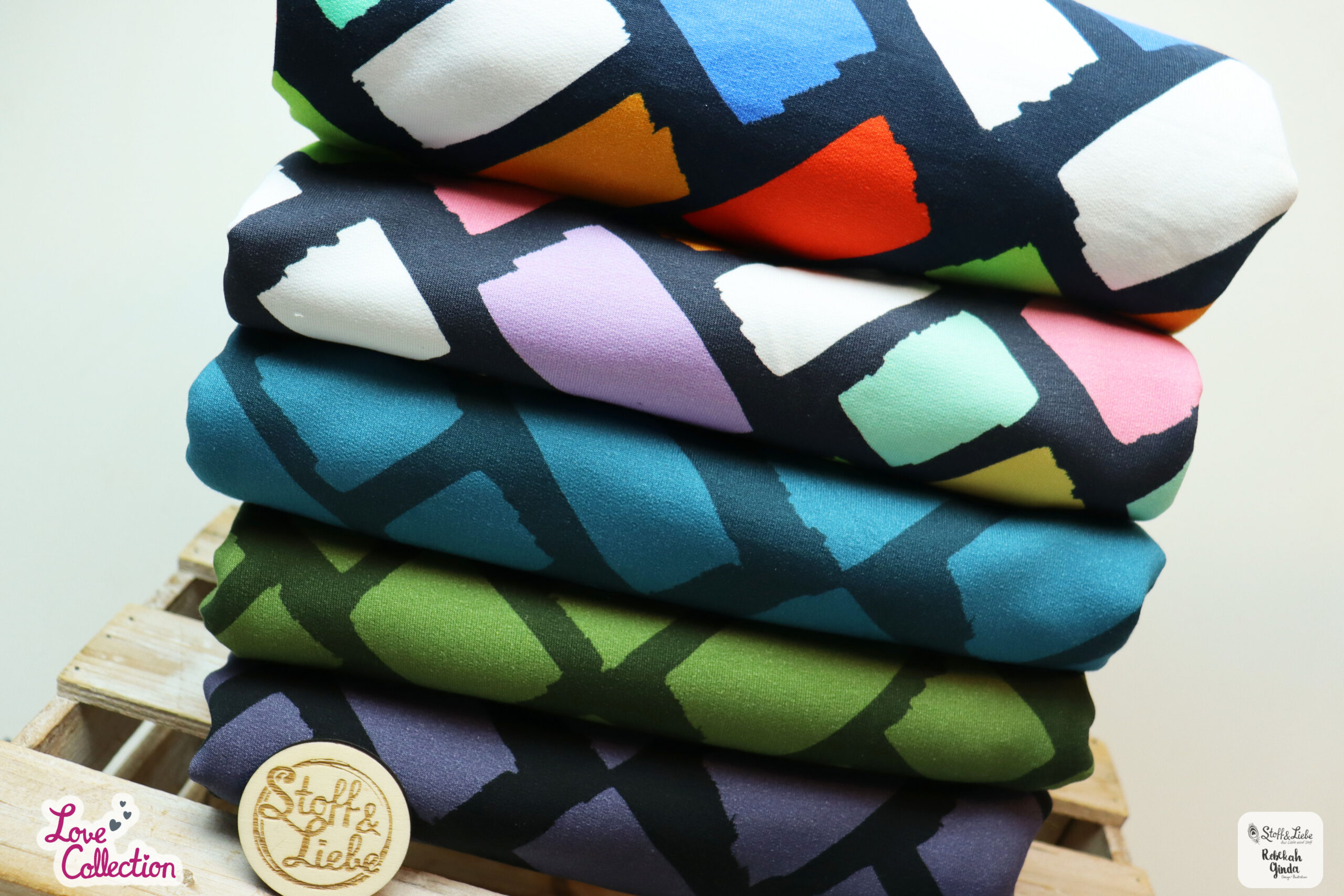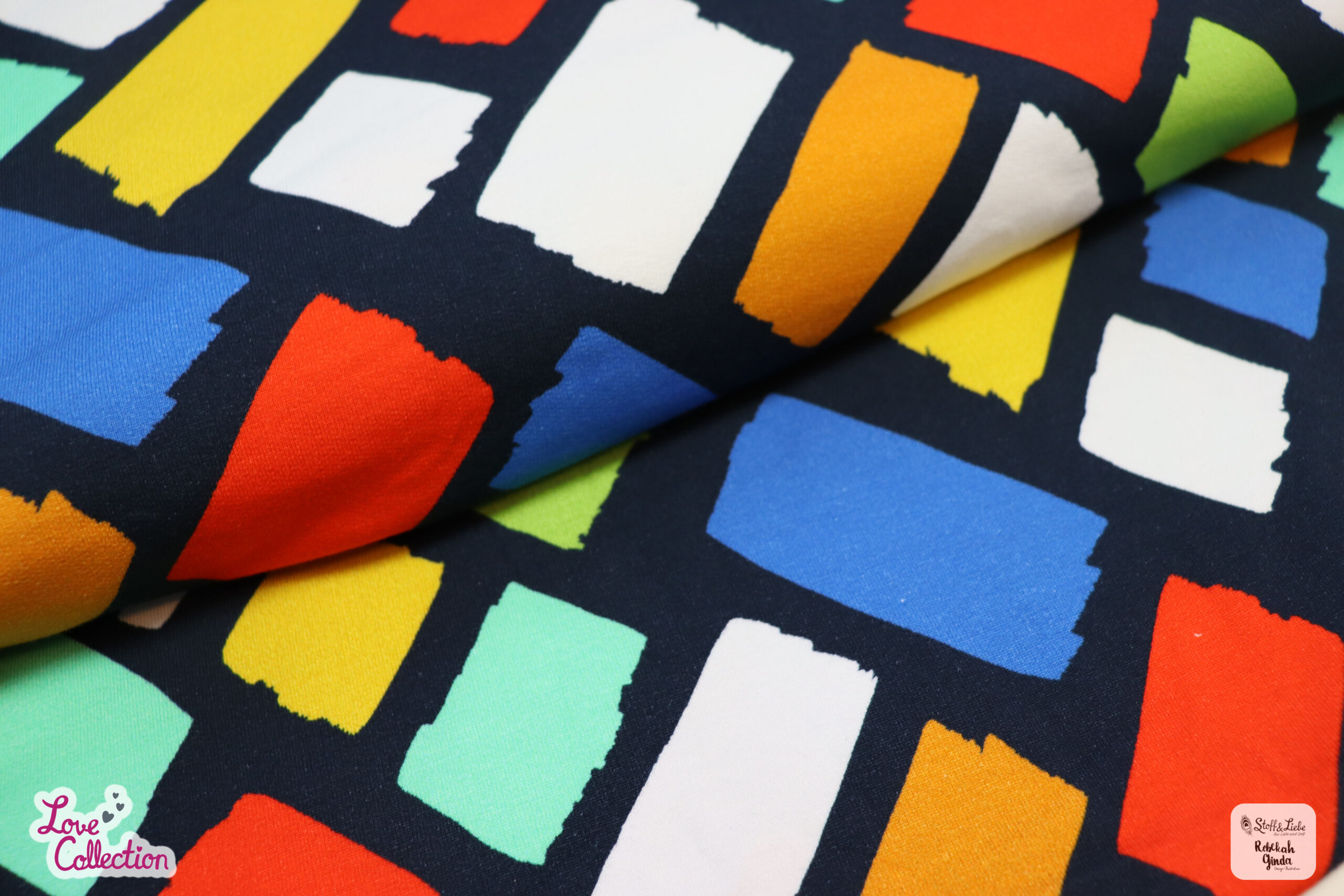 Die Color Blox erhaltet Ihr auf French Terry mit einer Grammatur von und einer Materialzusammensetzung von 95 % Baumwolle und 5 % Elasthan. Das Design stammt aus der Feder von Rebekah Ginda.