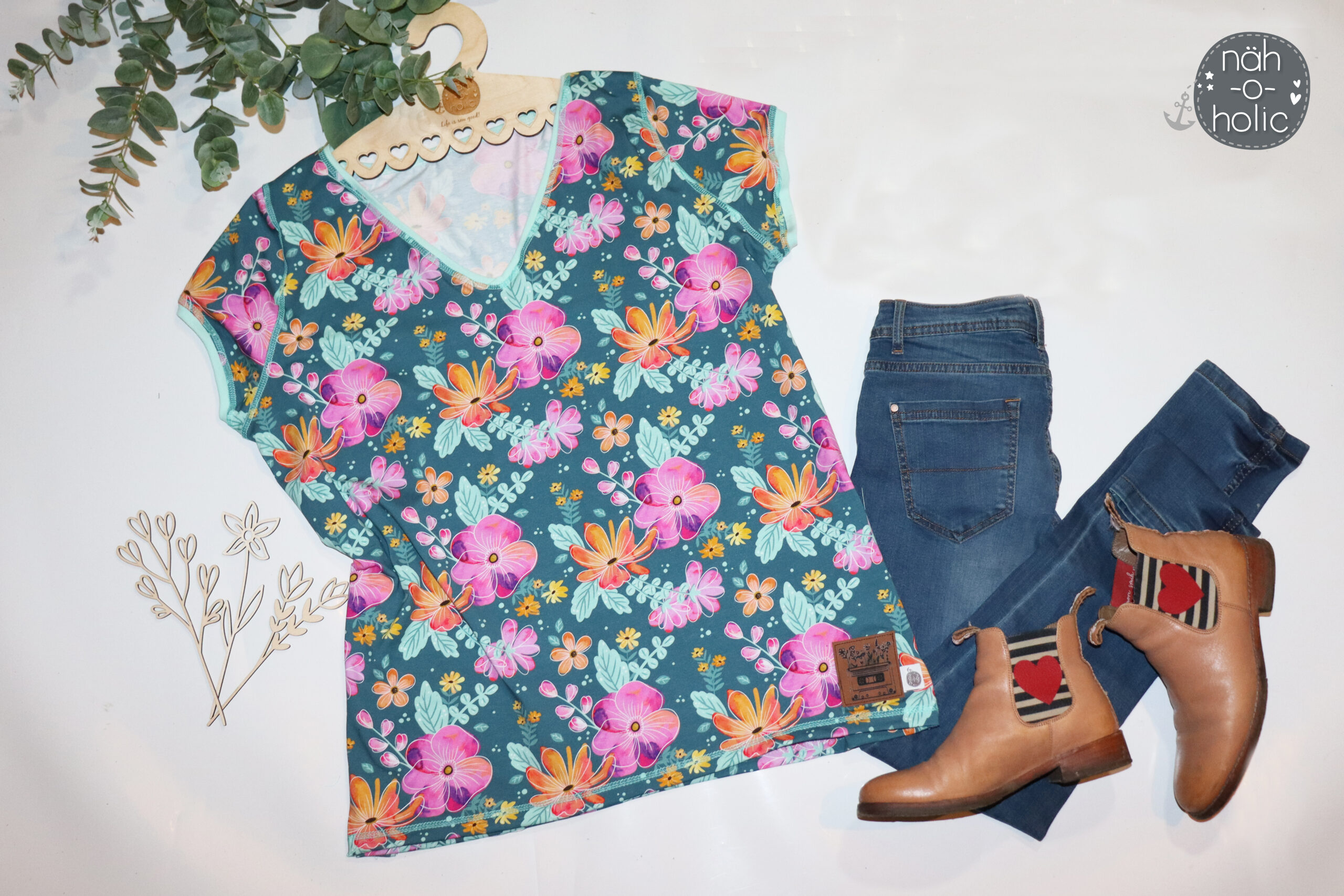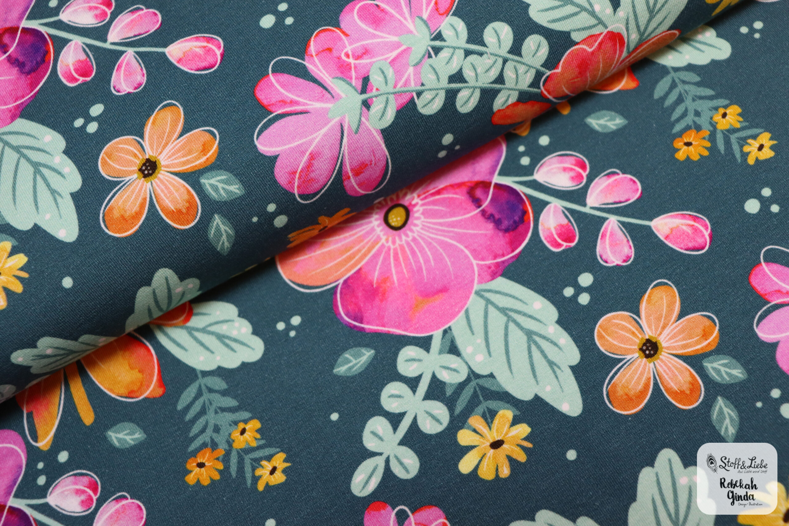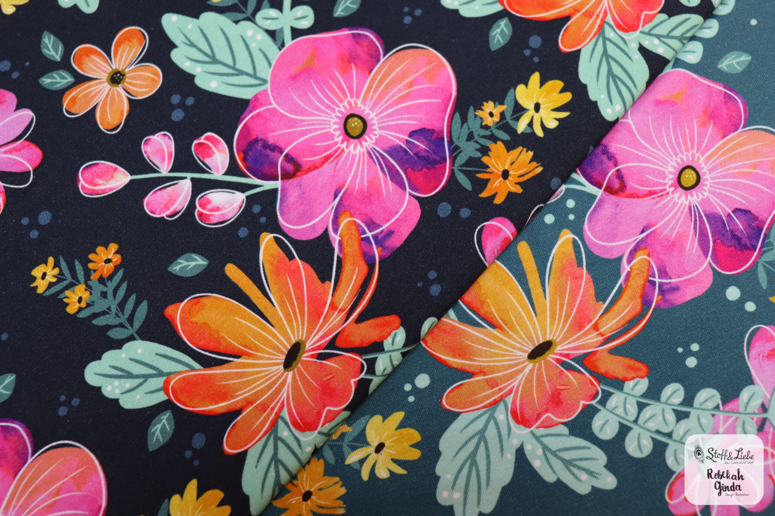 Blumige Blumen kommt auf Jersey und direkt in zwei Farbvarianten: Blau und Petrol.