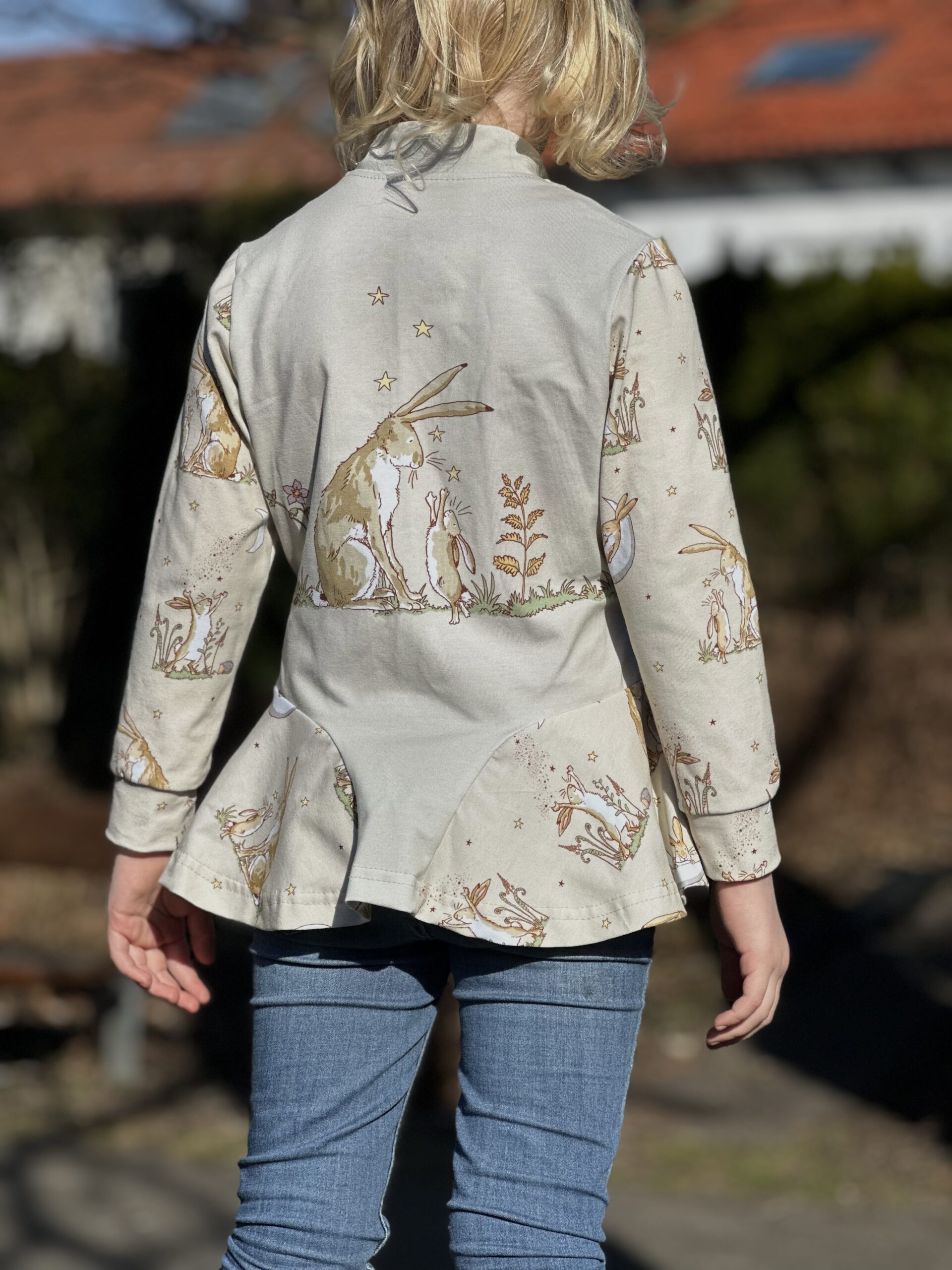 Durch den unifarbenen Untergrund kommen die Details und Farben der Motive fantastisch zur Geltung. Außerdem lässt sich der Allover durch die enthaltenen Farben vielfältig kombinieren. Die Motive haben eine Höhe zwischen ca. 5 cm (Hase liegend im Mond) und ca. 8 cm (beide Hasen). Dadurch ist der Allover in vielen Größenbereichen einsetzbar ohne überladen zu wirken.
