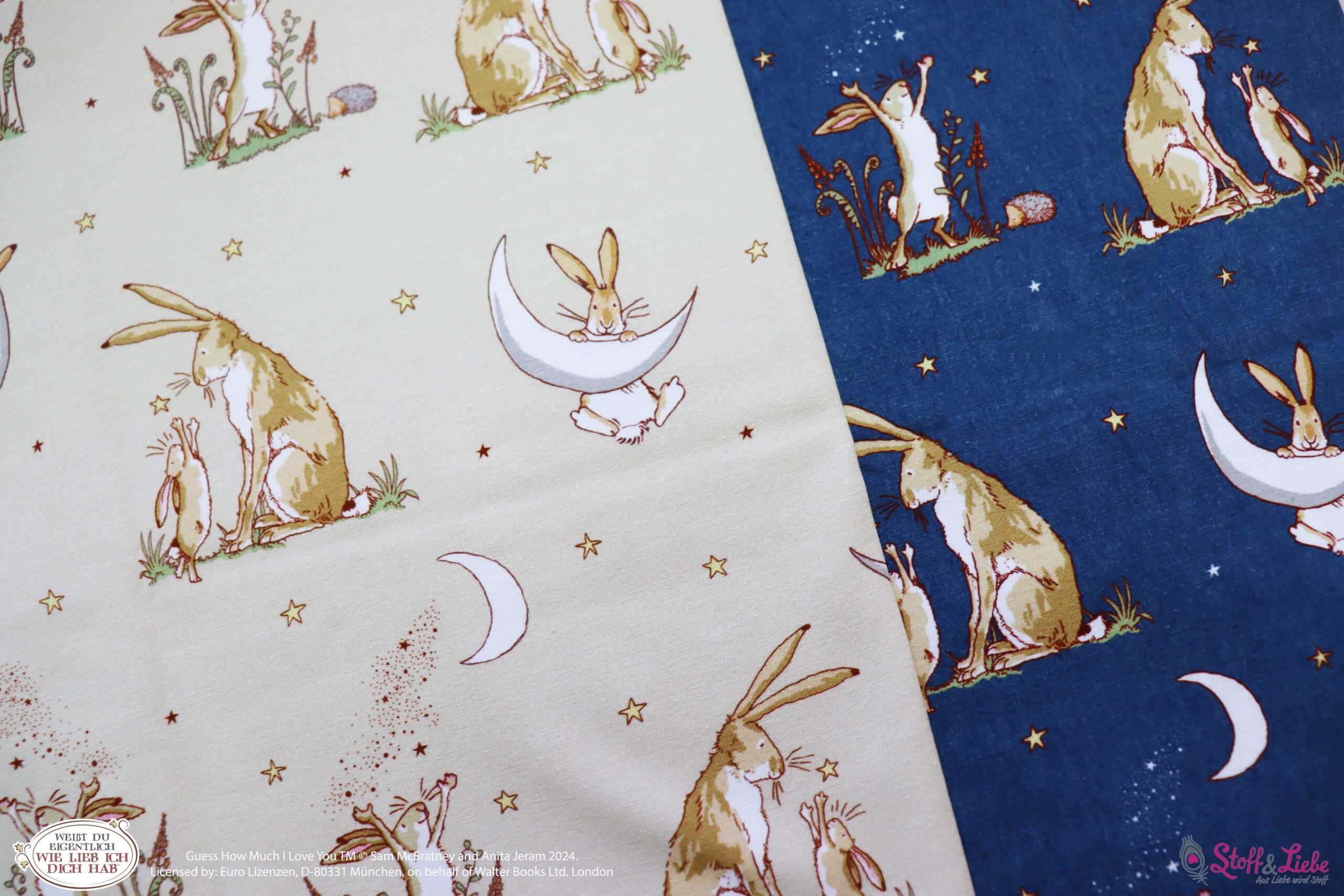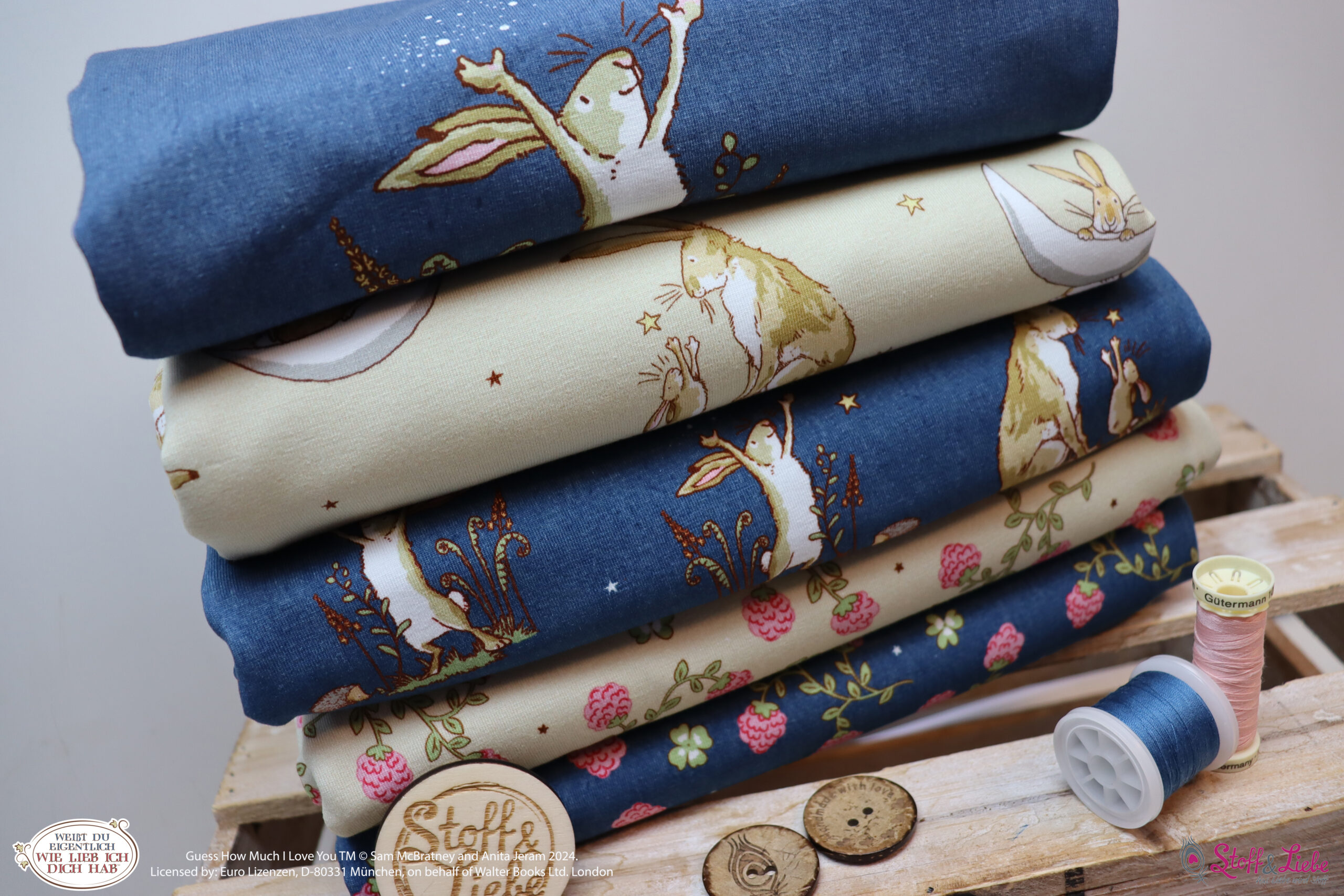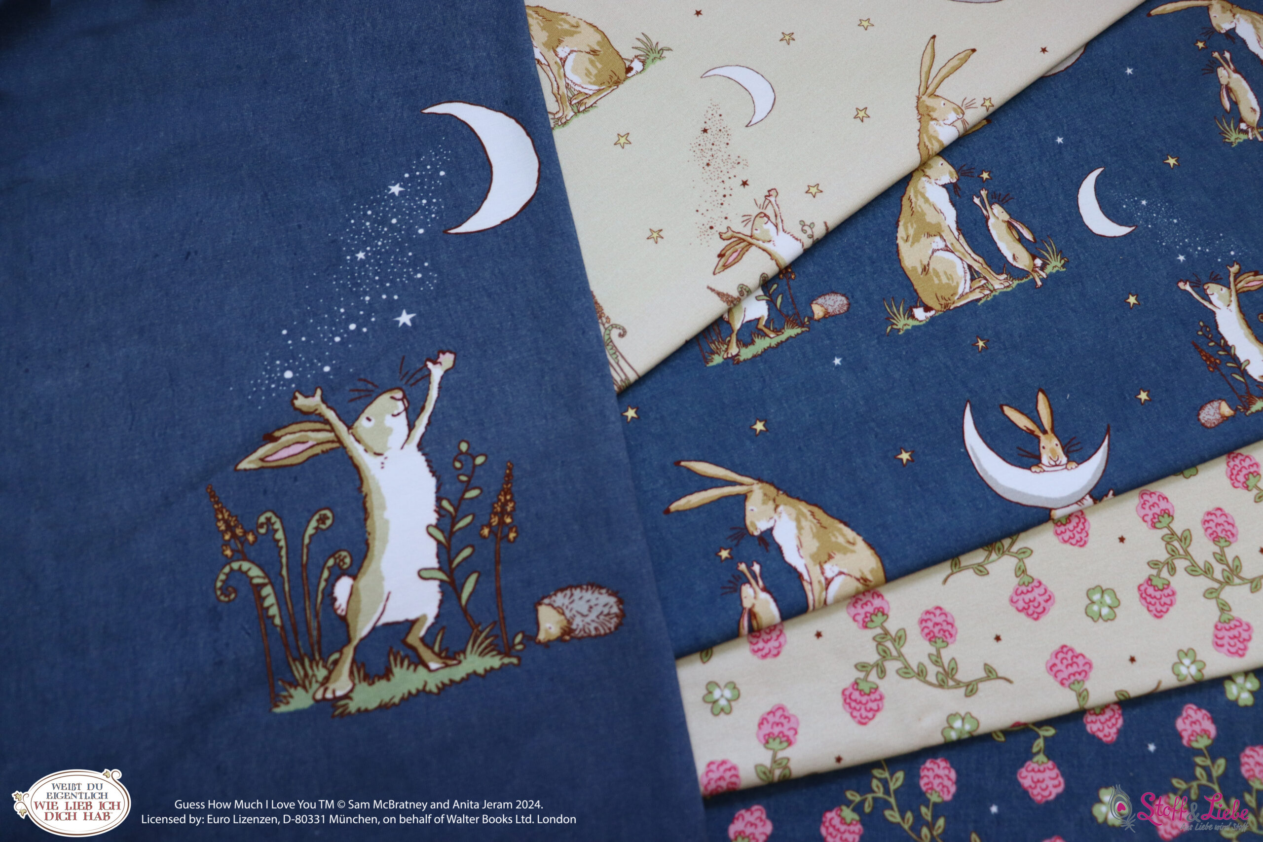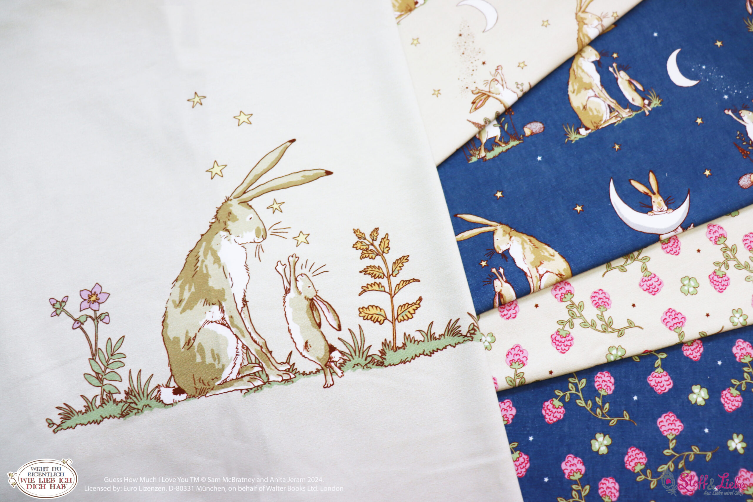 Bis zum Mond und zurück! Die wohl schönste Geschichte, die es gibt. Findet Ihr nicht auch? Es wird dringend Zeit für neue Stoffe mit unseren Liebhabe-Hasen. Gewohnt ausdrucksstark und dennoch zurückhaltend und romantisch kommt die neue Serie daher. Stoffe zum Verlieben!