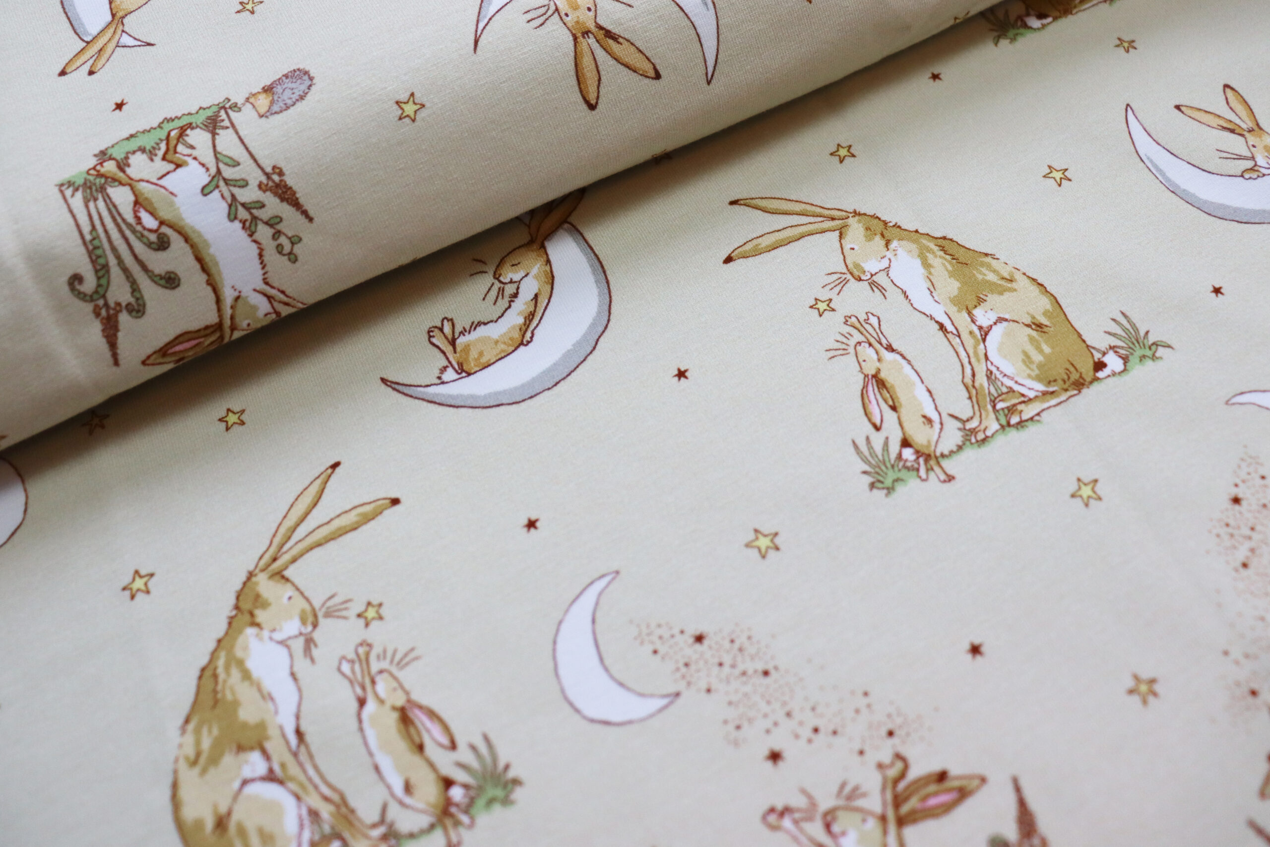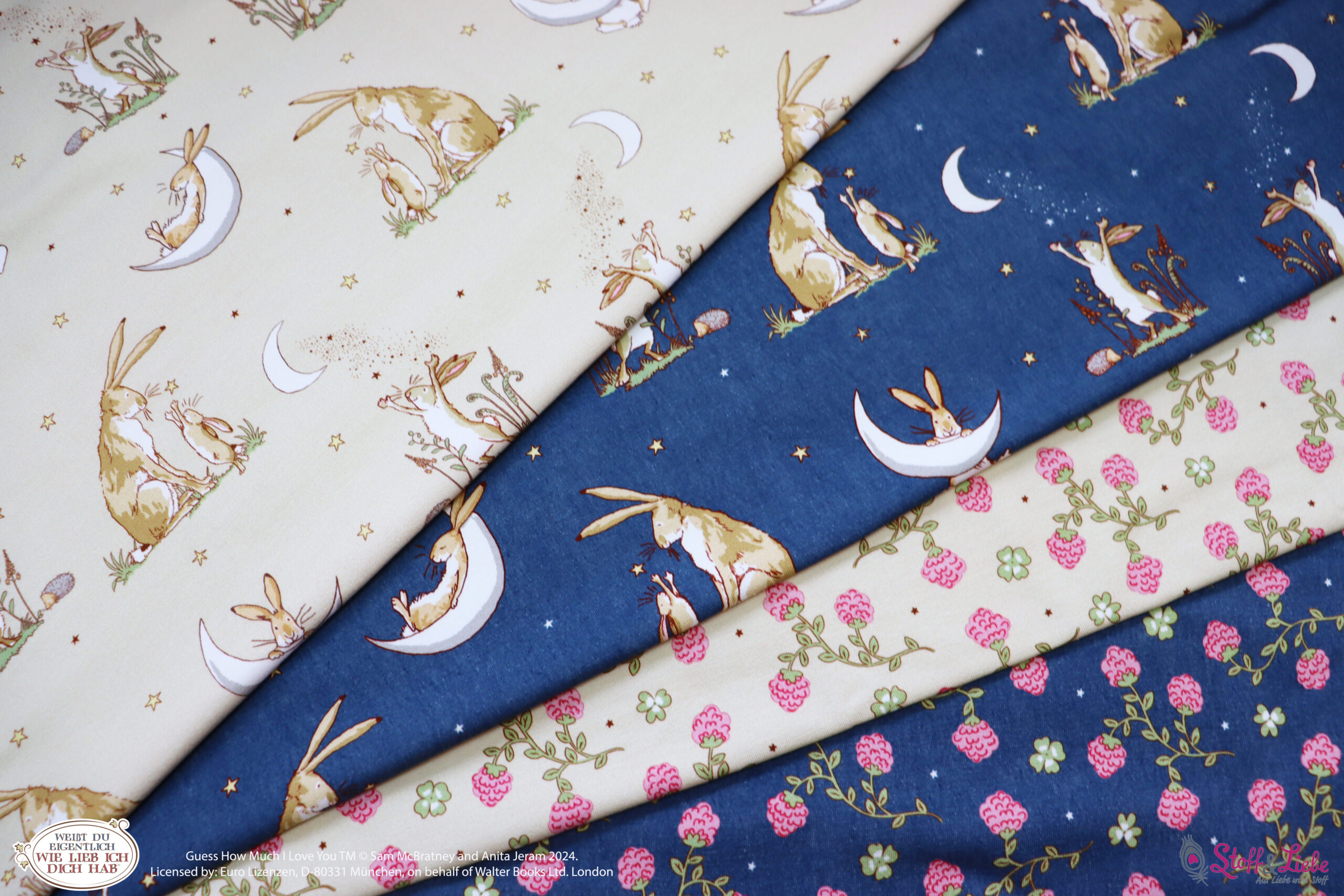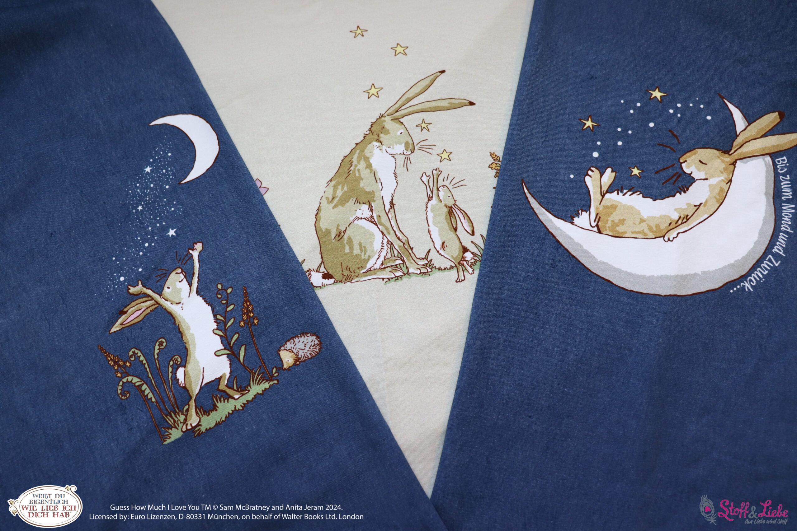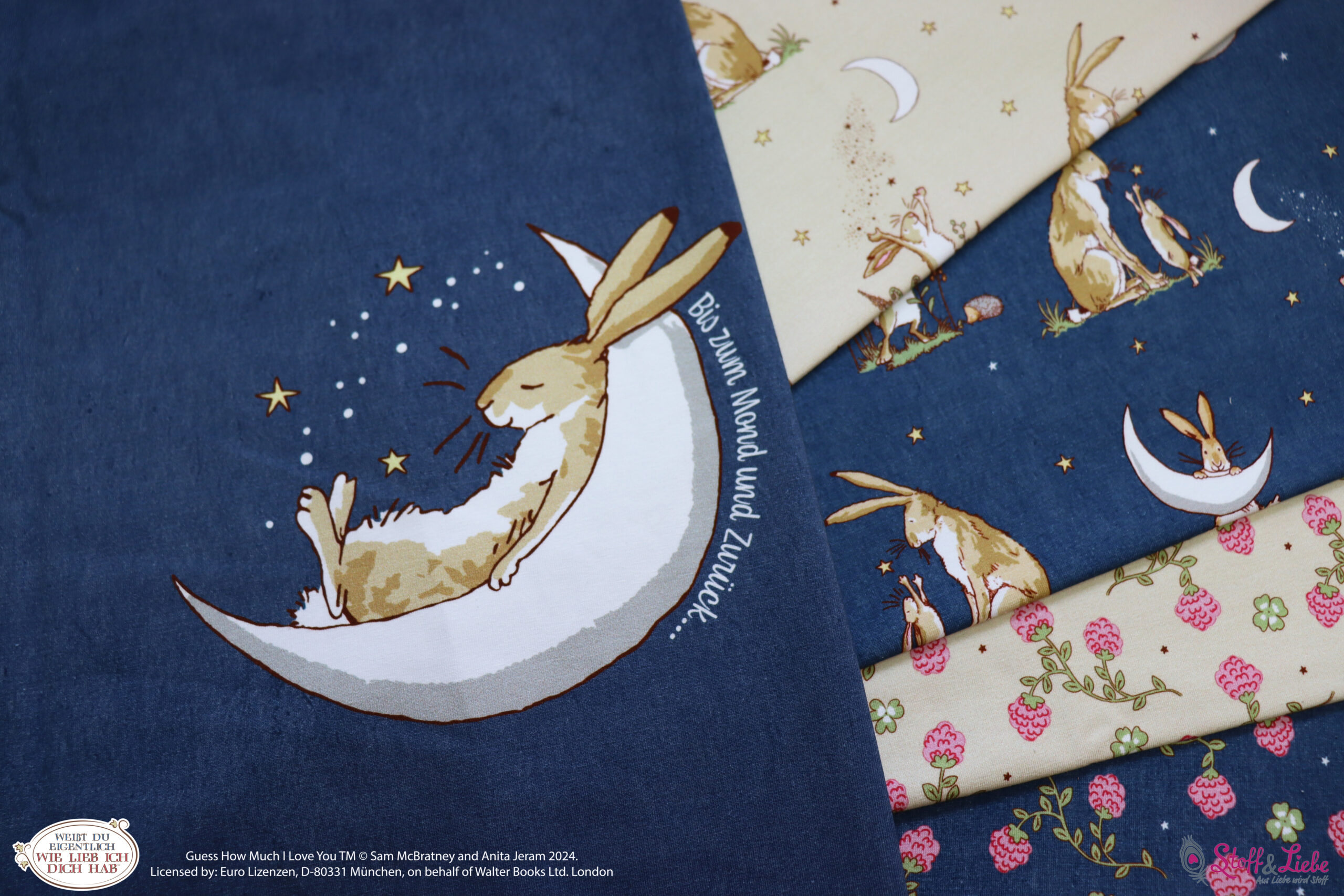 Bis zum Mond und zurück! Die wohl schönste Geschichte, die es gibt. Findet Ihr nicht auch? Es wird dringend Zeit für neue Stoffe mit unseren Liebhabe-Hasen. Gewohnt ausdrucksstark und dennoch zurückhaltend und romantisch kommt die neue Serie daher. Stoffe zum Verlieben!