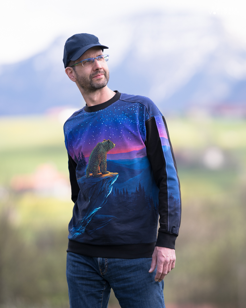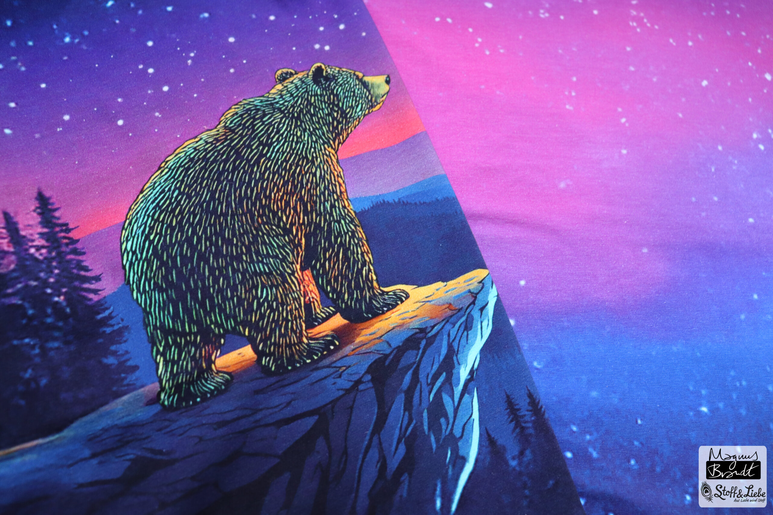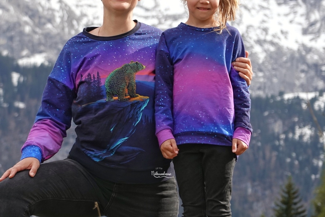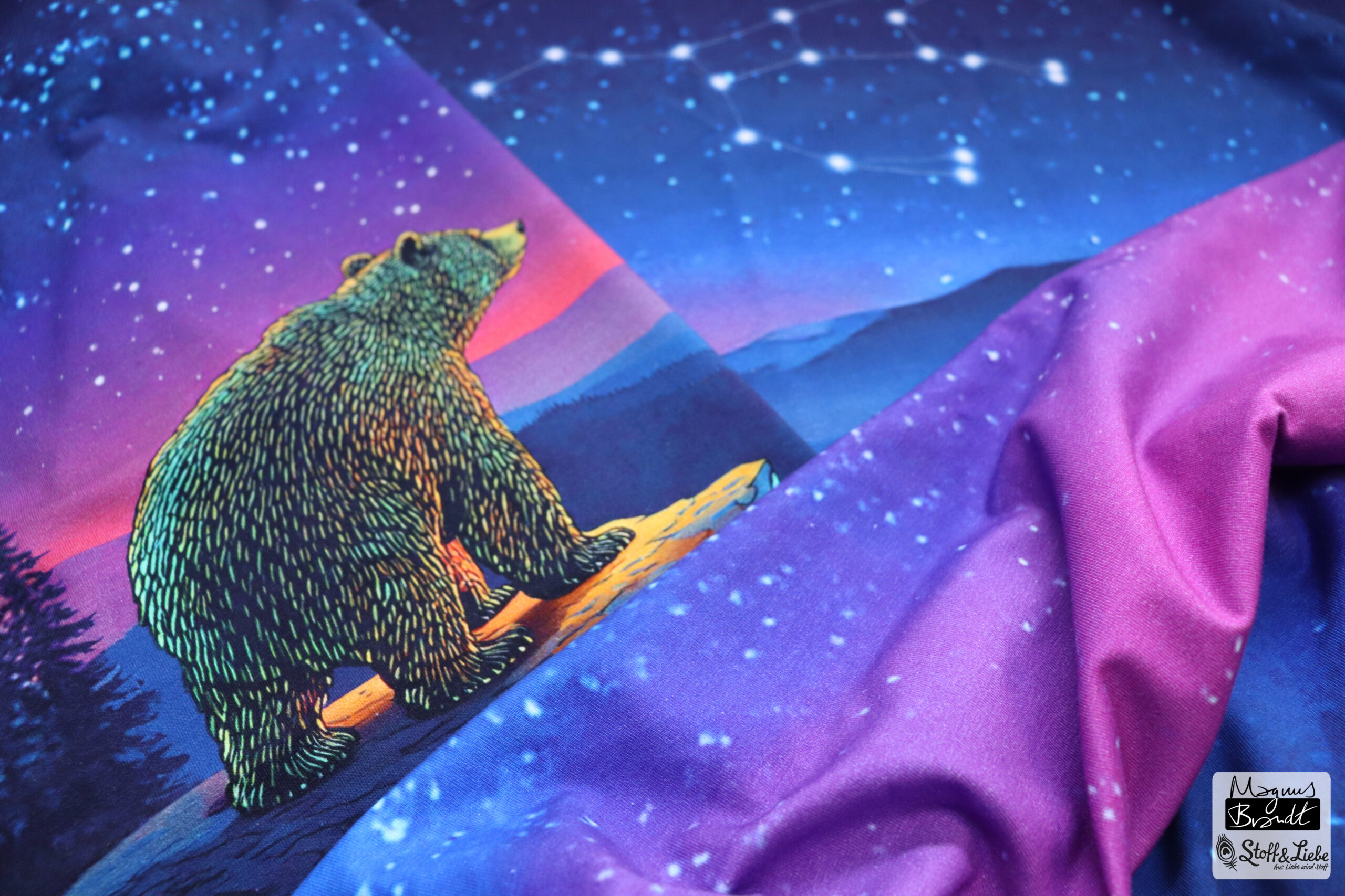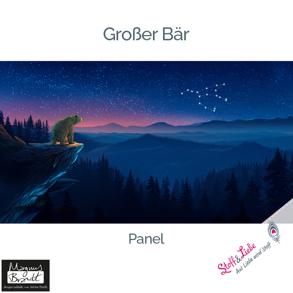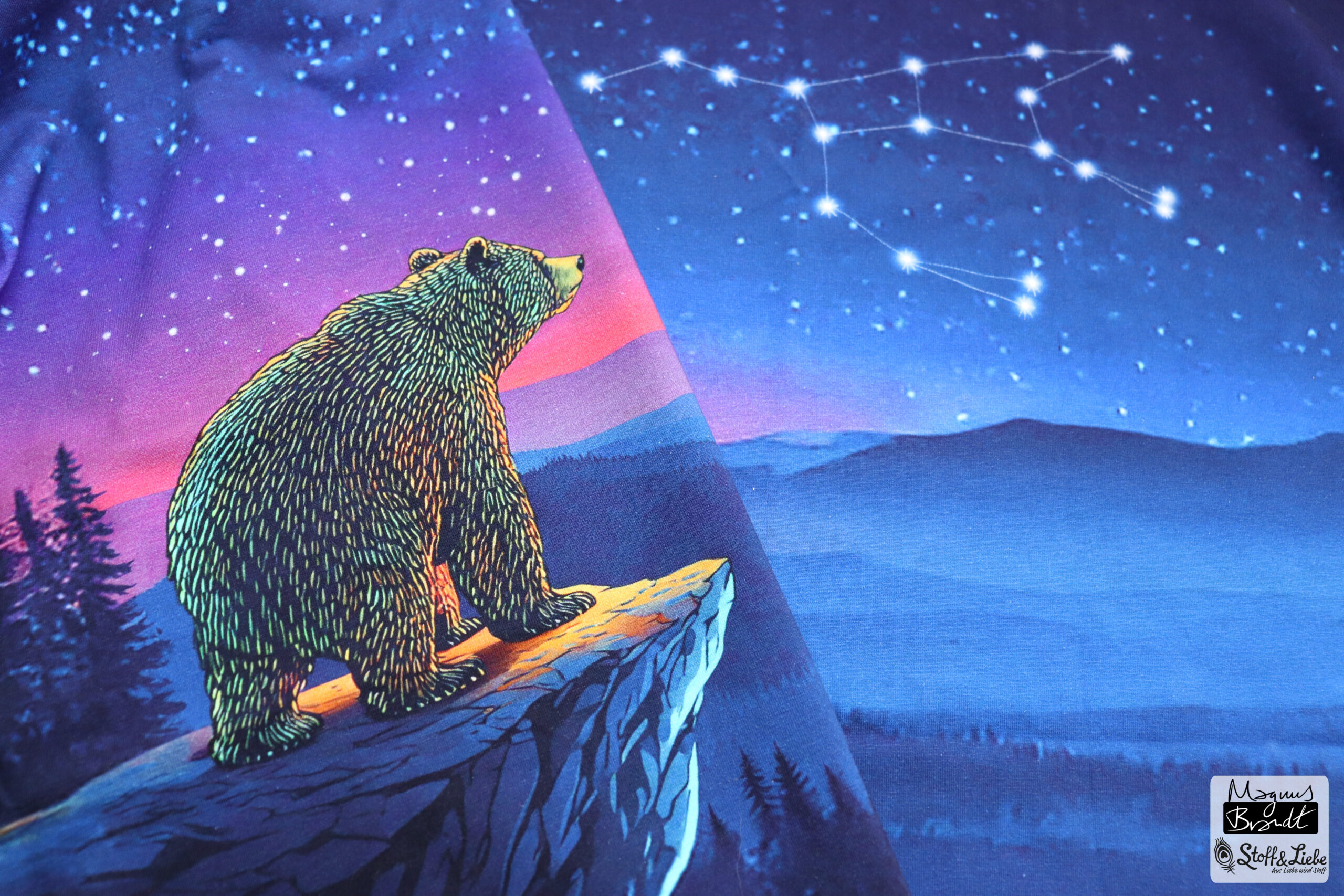 Das Panel hat eine Höhe von ca. 75 cm und ist als vollflächiges Motiv angelegt. Detailreich gestaltet, gibt es hier immer etwas zu entdecken. Das Panel kann, je nachdem wie es eingeteilt und zuschnitten wird, immer anders wirken. Durch den harmonischen Farbverlauf habt Ihr jede Menge Möglichkeiten dieses Panel zu vernähen. Wie zauberhaft ist es bitte, wie der Bär in das gleichnamige Sternbild schaut?
