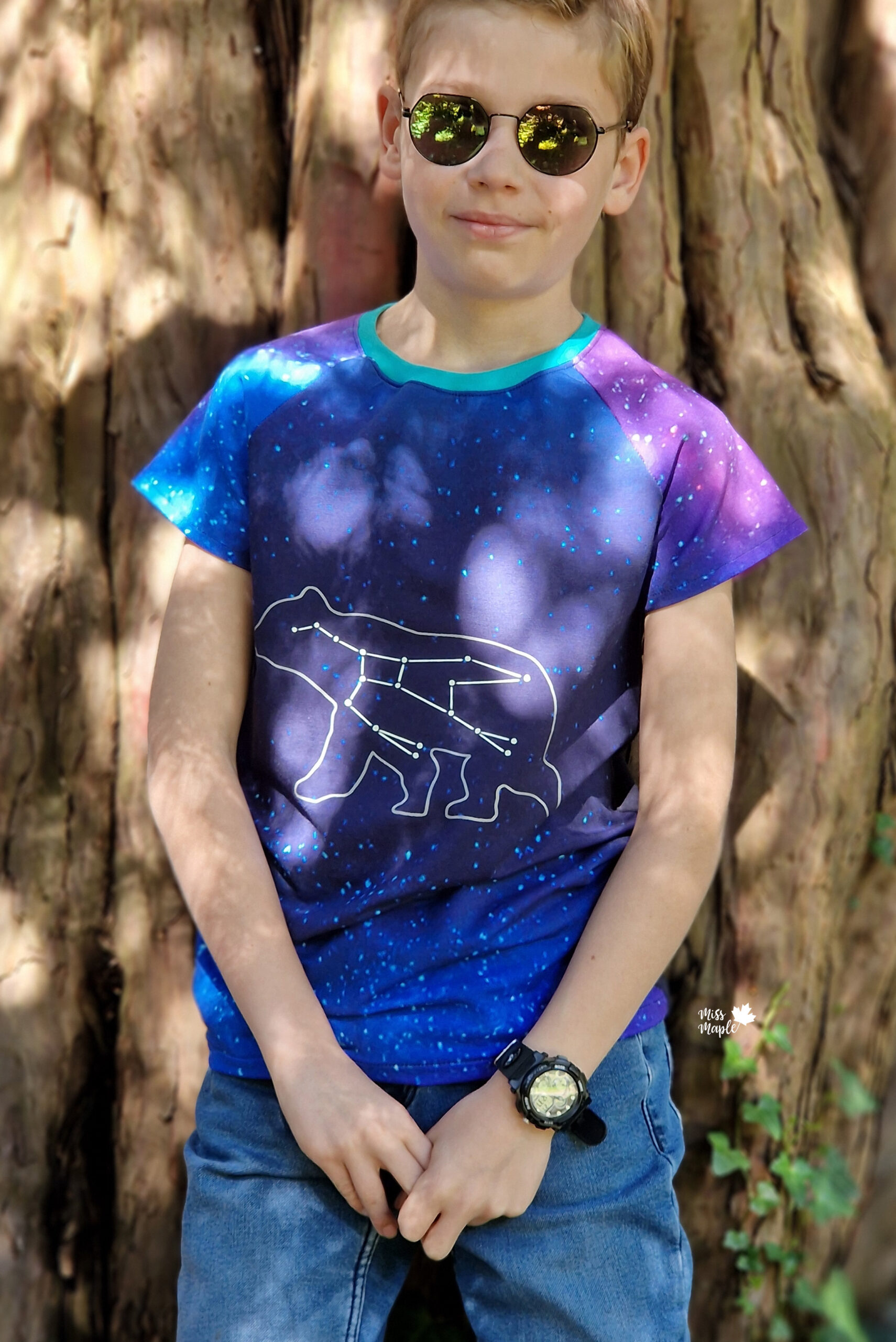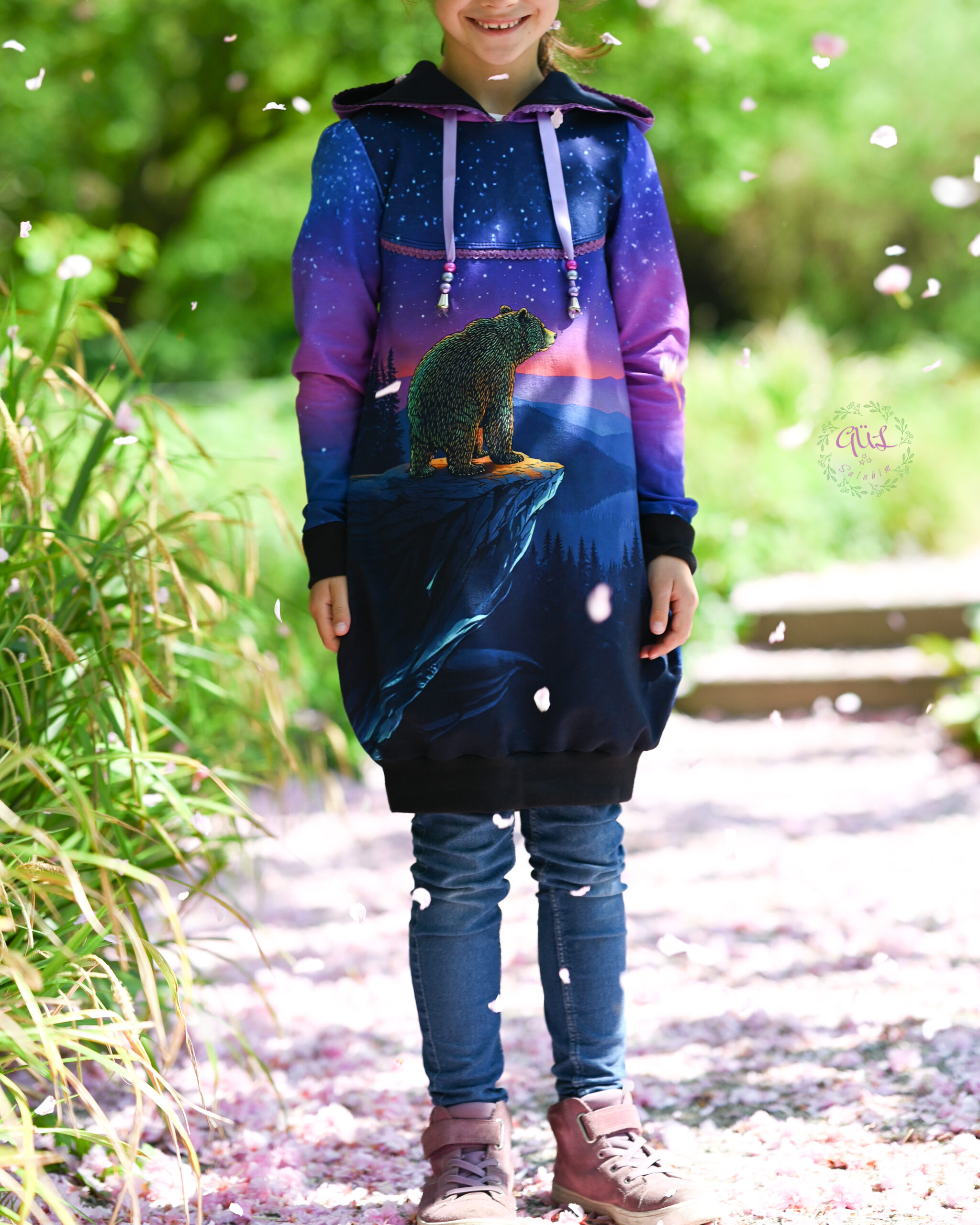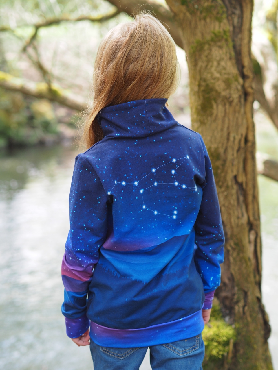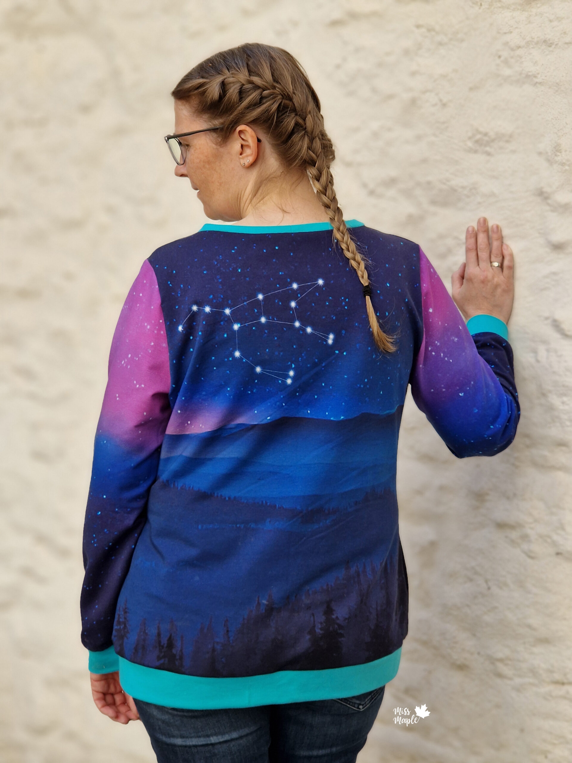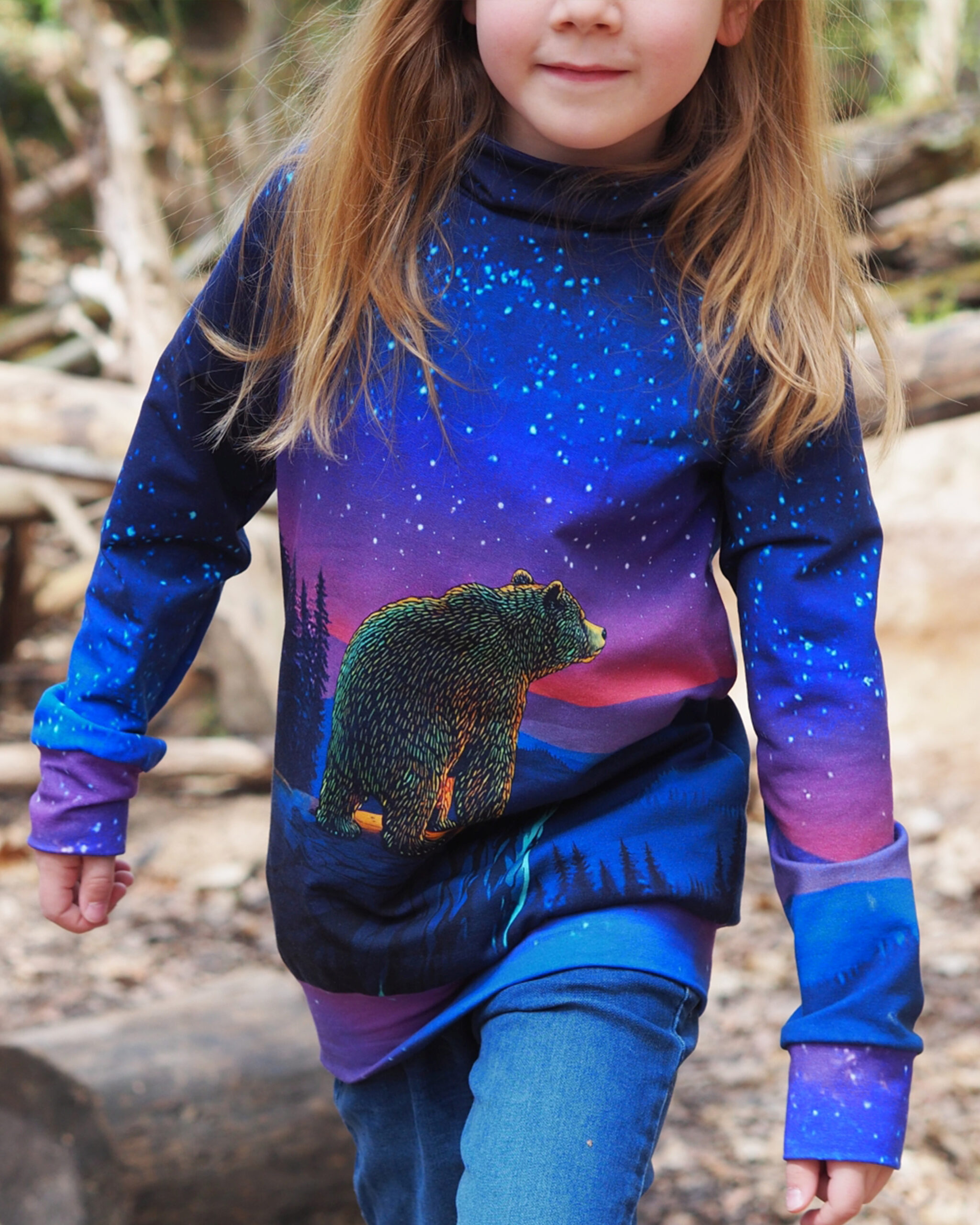 Das Panel hat eine Höhe von ca. 75 cm und ist als vollflächiges Motiv angelegt. Detailreich gestaltet, gibt es hier immer etwas zu entdecken. Das Panel kann, je nachdem wie es eingeteilt und zuschnitten wird, immer anders wirken. Durch den harmonischen Farbverlauf habt Ihr jede Menge Möglichkeiten dieses Panel zu vernähen. Wie zauberhaft ist es bitte, wie der Bär in das gleichnamige Sternbild schaut?