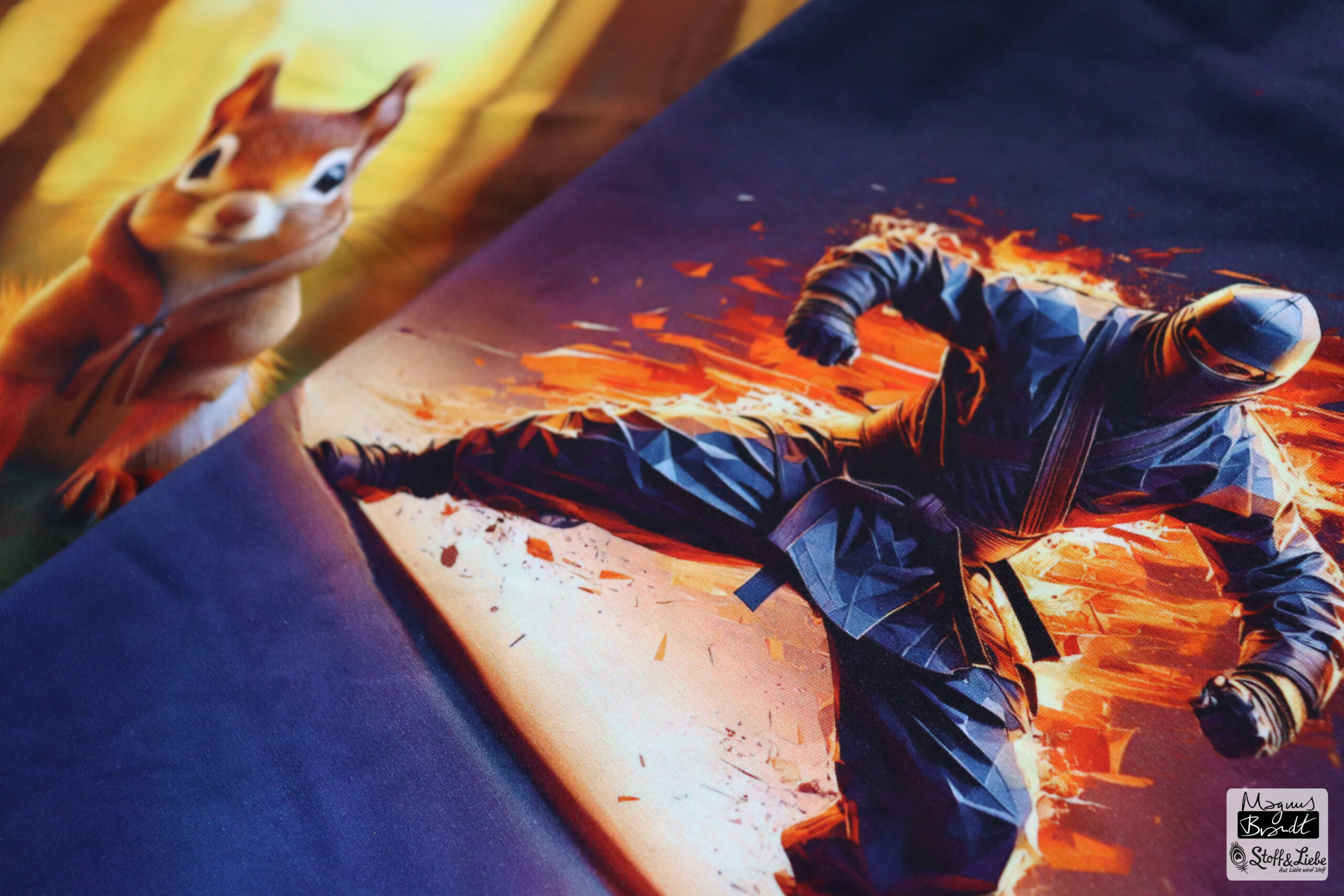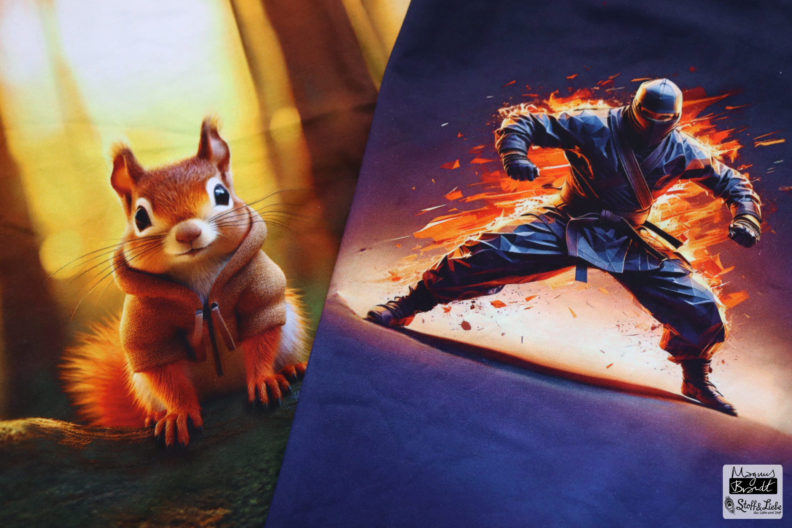 Und dann wären da noch das Eichhörnchen und der Ninja. Diese beiden Panels haben ebenfalls eine Höhe von ca. 75 cm und sind auf Jersey erhältlich. Der 3D Effekt gibt dem Stoff Tiefe und einen ganz besonderen Look. Beim Blick auf das Eichhörnchen hat man fast das Gefühl im Wald zu sein. Findet Ihr nicht auch?
