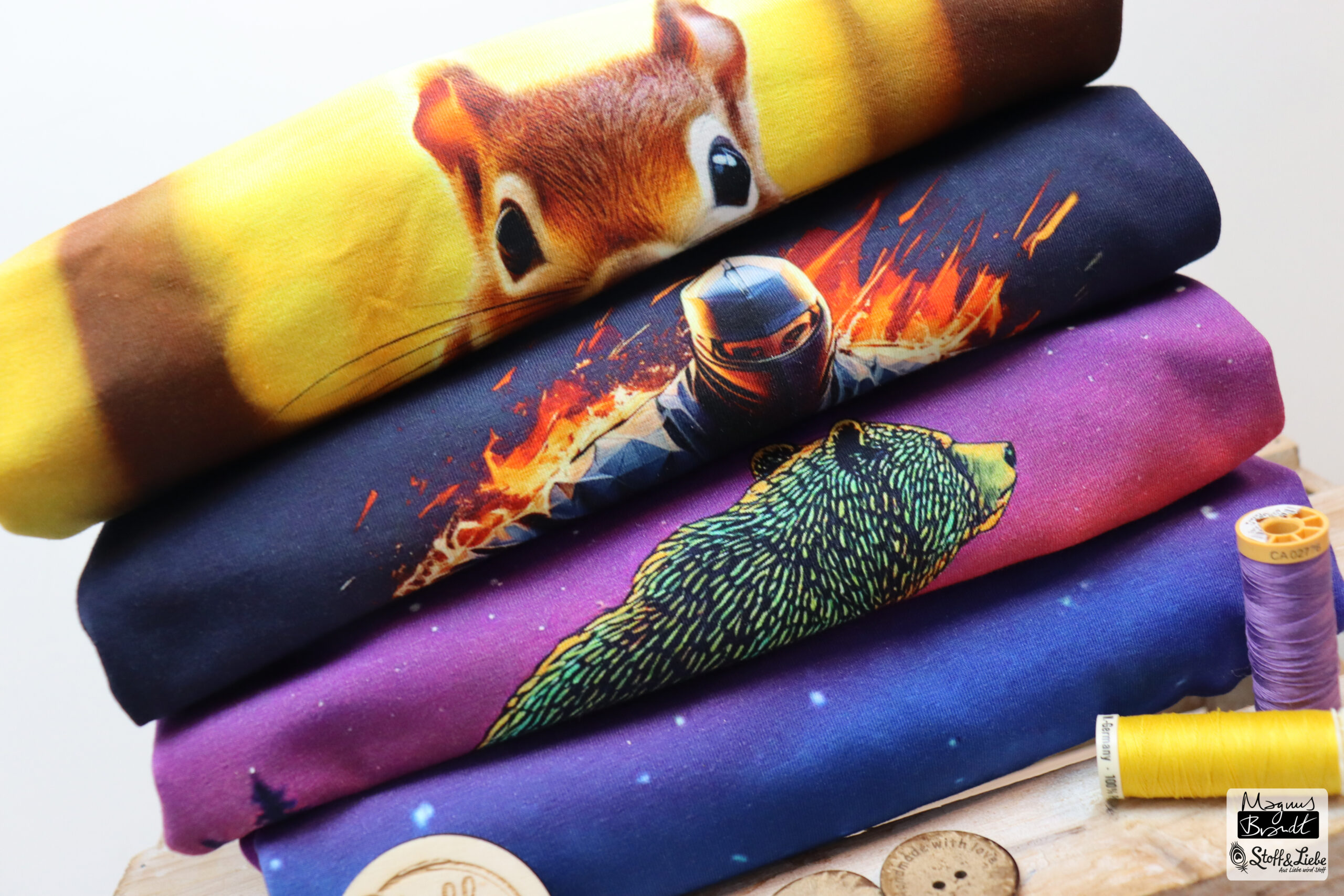 Mit diesen Stoffen möchten wir den Wunsch nach Designs für all jene schaffen, die dem Alter der Lizenzen entwachsen sind. Stoffe die mitwachsen und neue Impulse schaffen. Die Designlinie von Magnus Brandt bringt Dir eine ganz neue Stilrichtung mit, die sich auch im KI-Design ausprobiert.