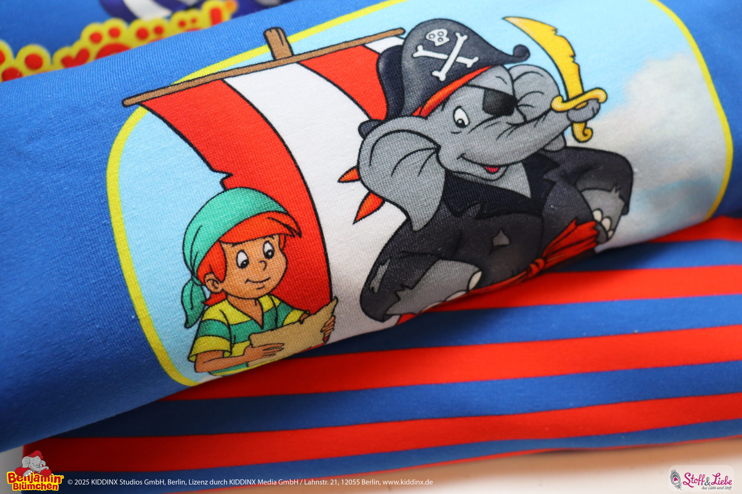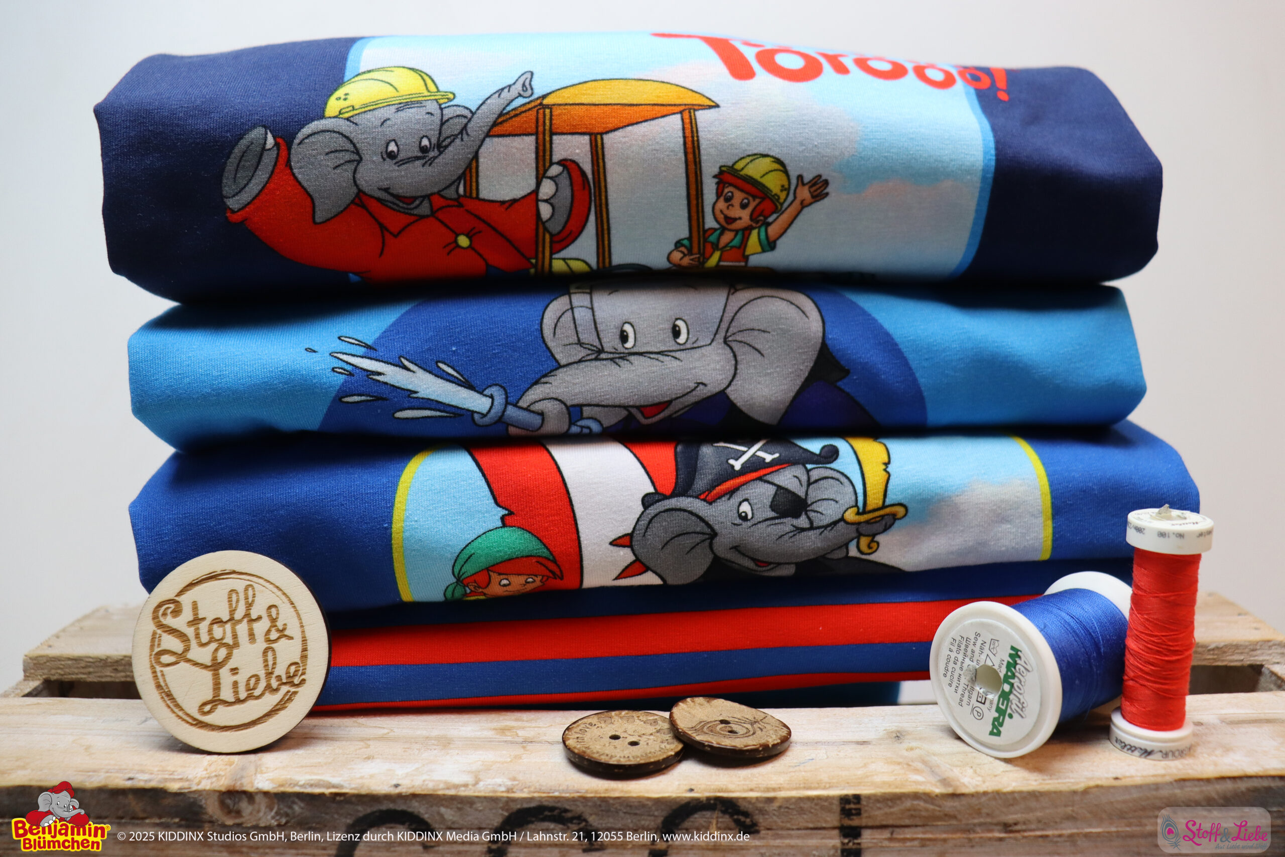 Unsere erste Benjamin Blümchen Kollektion besteht aus drei Panels und einem Kombistoff. Alle Stoffe erhaltet Ihr auf Jersey in unserer gewohnten Spitzenqualität. Jedes Panel greift ein Thema auf und hält jeweils Motiv und Allover in einem für Euch bereit. Die Panels haben eine Höhe von ca. 70 cm. Damit könnt Ihr mit nur einem Panel ein richtig tolles Stück nähen oder kombiniert mit weiteren Stoffen sogar mehrere Teile. Großartig, oder?