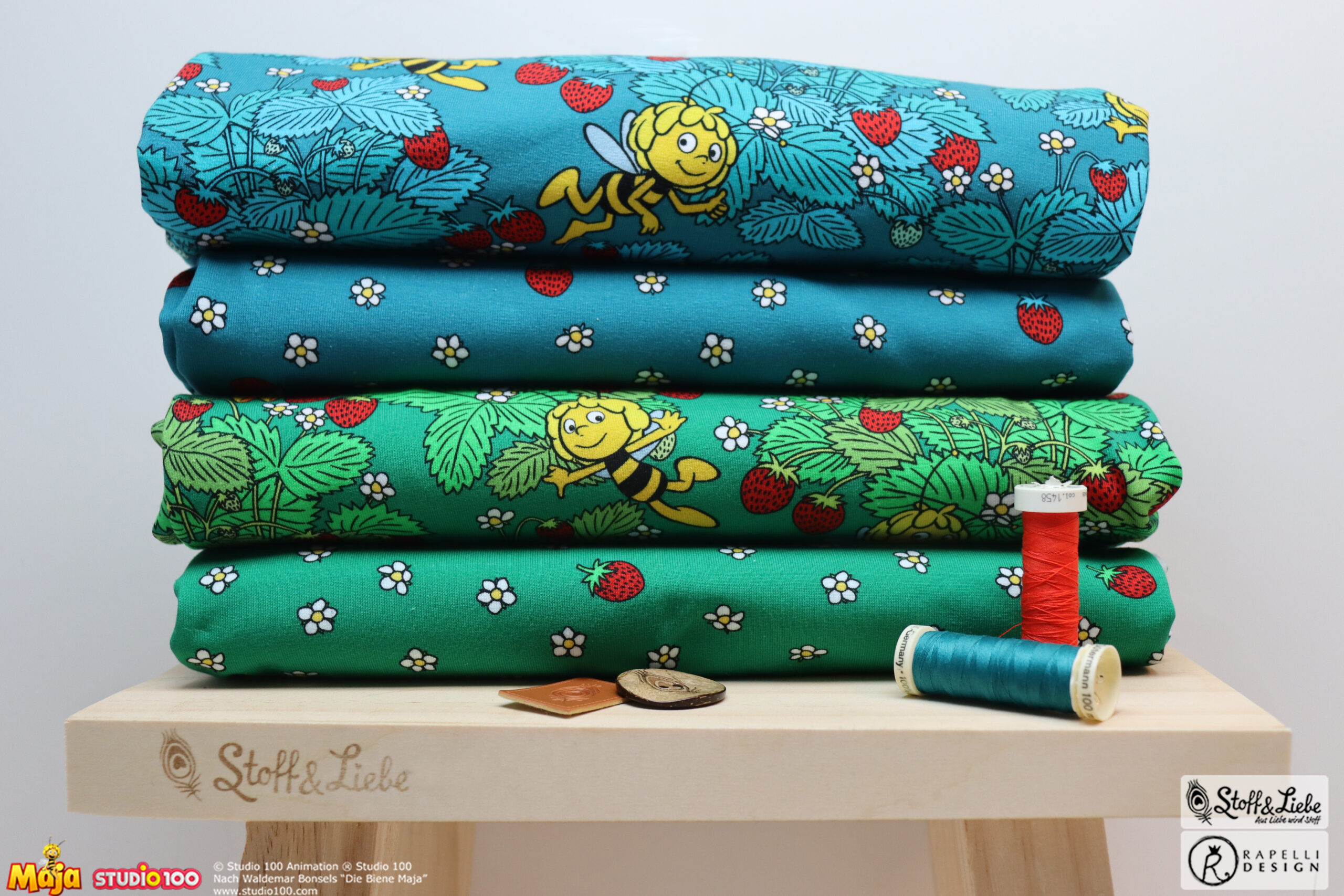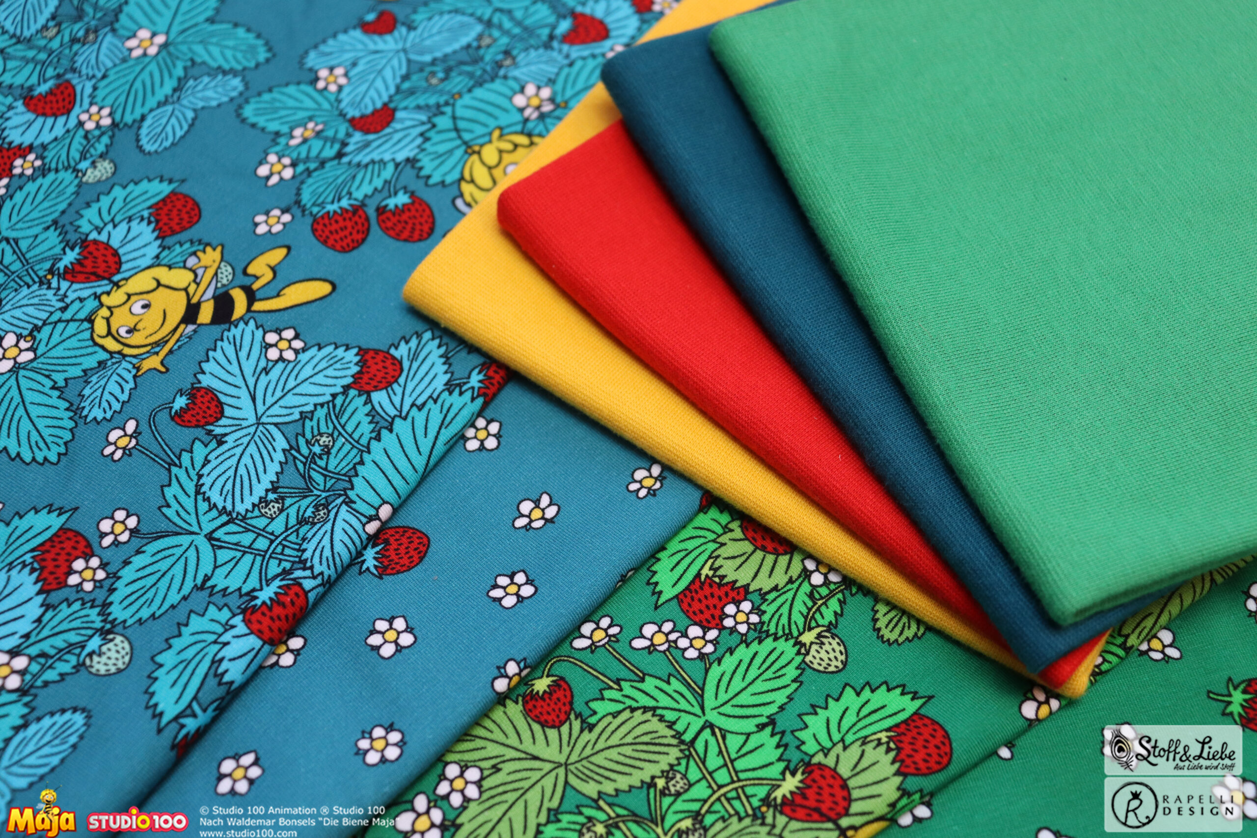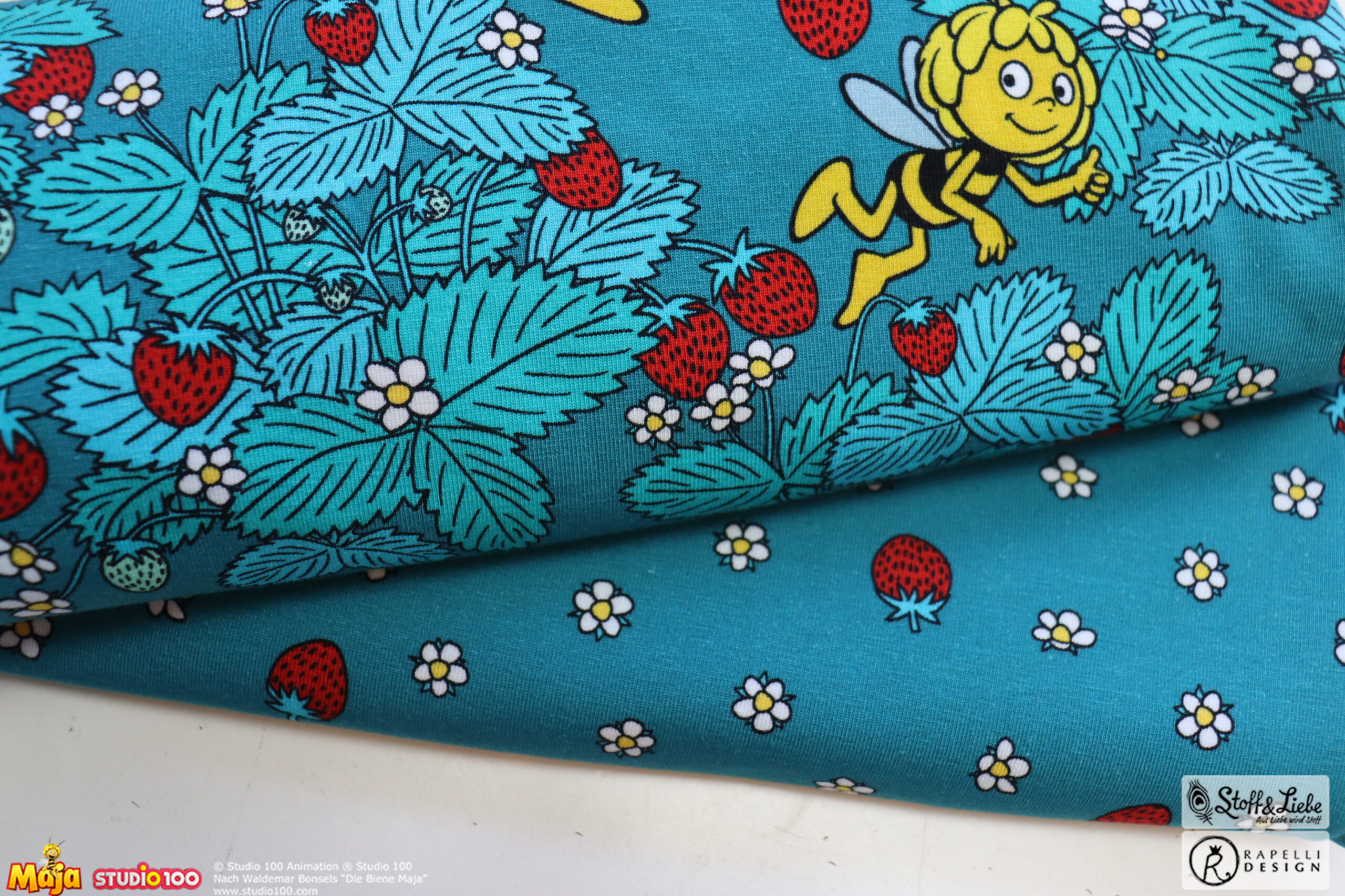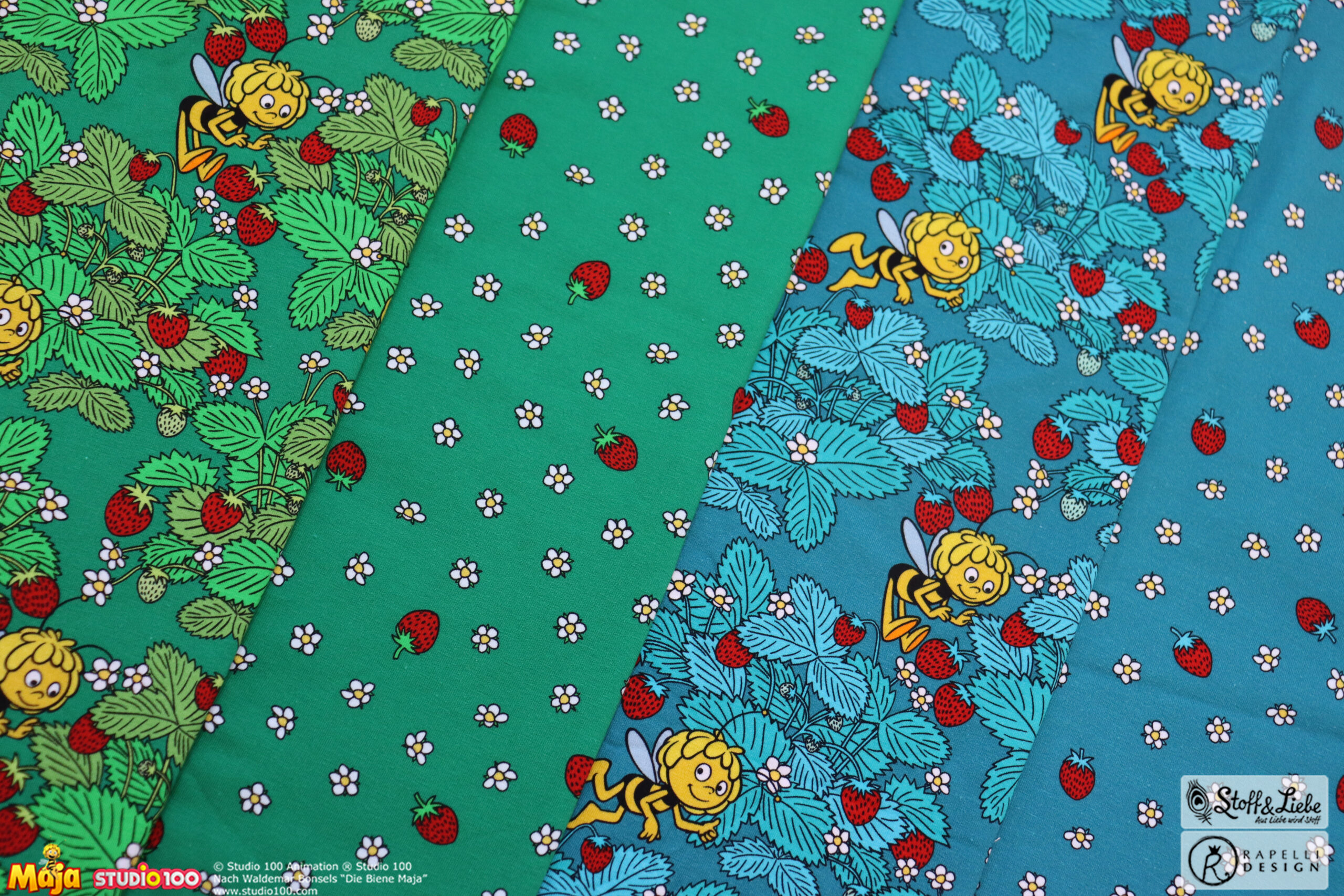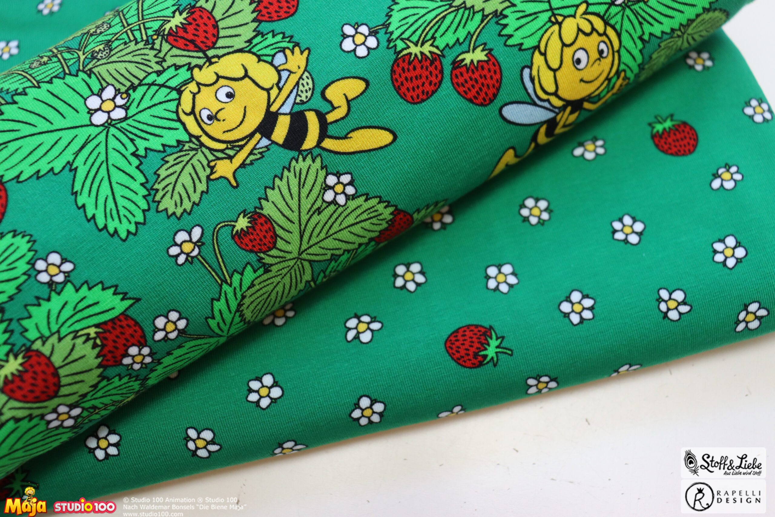 Erdbeeren? Hat jemand Erdbeeren gesagt? Jaaaaa und zwar in Form von Biene Majas Erdbeerfeld. Schnappt sie Euch, bevor die Erdbeerzeit vorbei ist. Obwohl Erdbeeren auf Stoff gehen doch immer, oder?