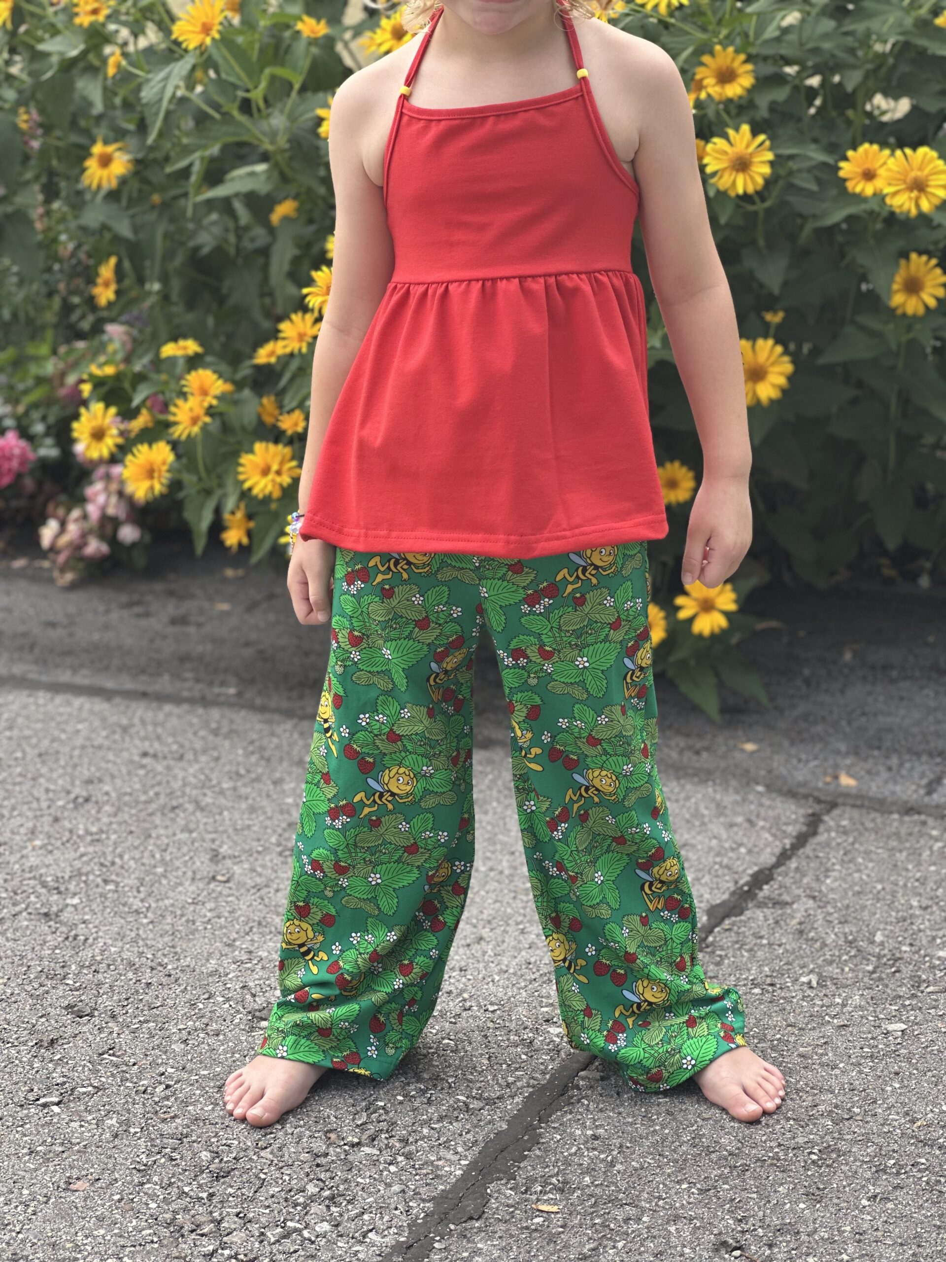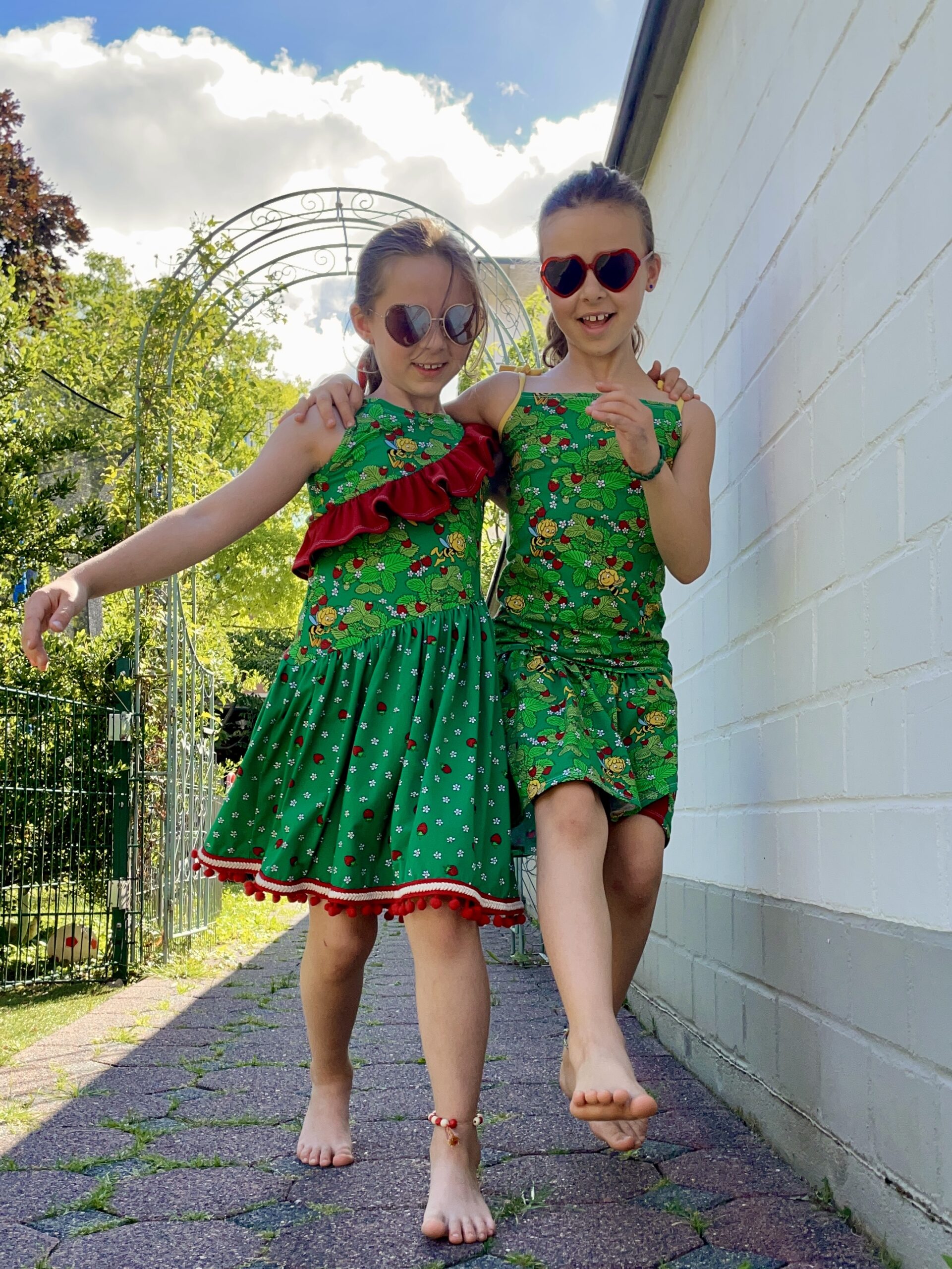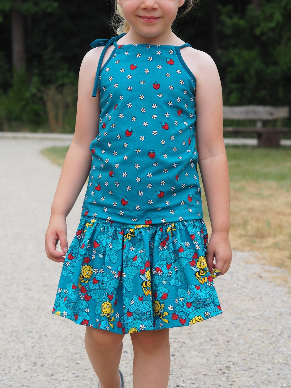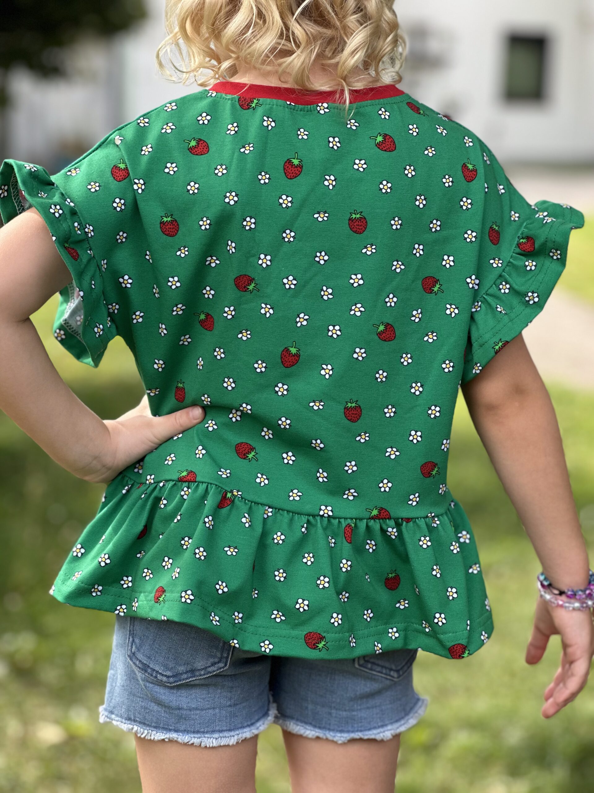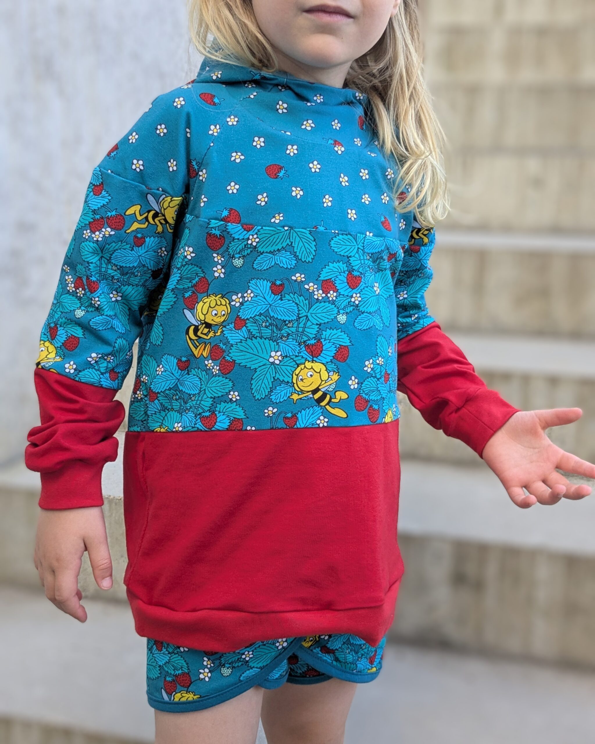 Die Stoffe lassen sich nicht nur zusammen prima vernähen, sondern auch solo. Wer kann einem Erdbeershirt oder Kleid schon widerstehen? 😉
