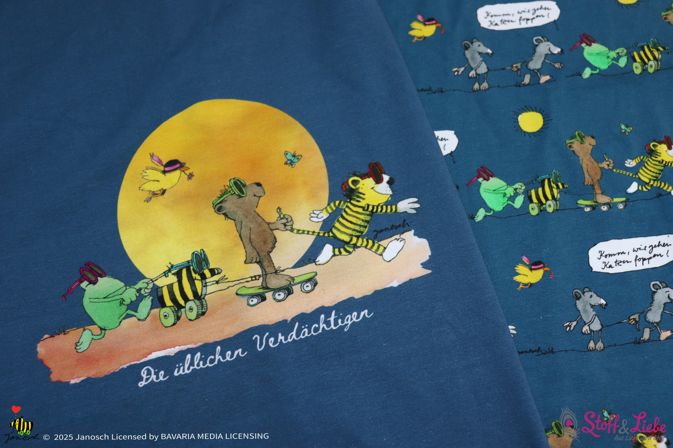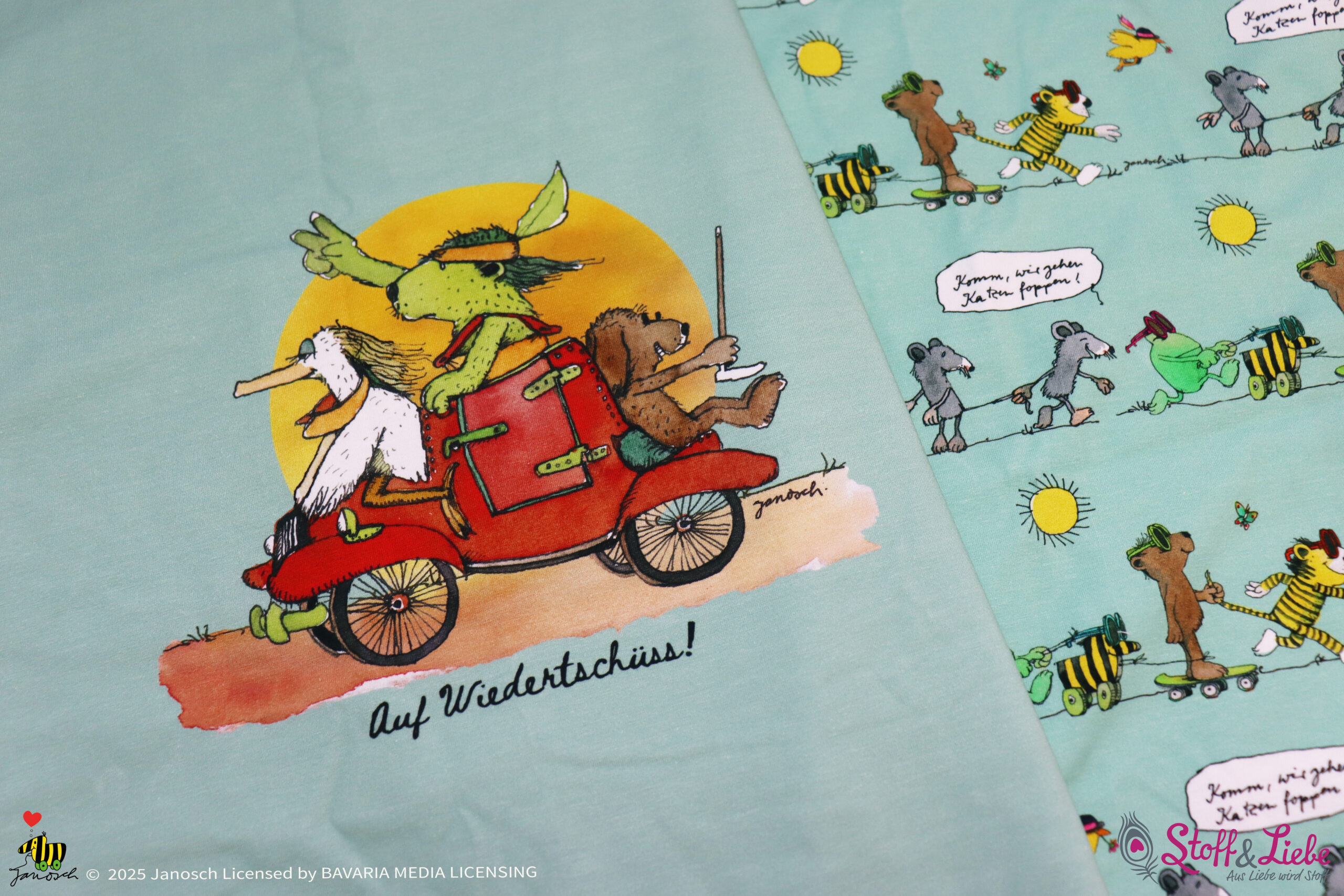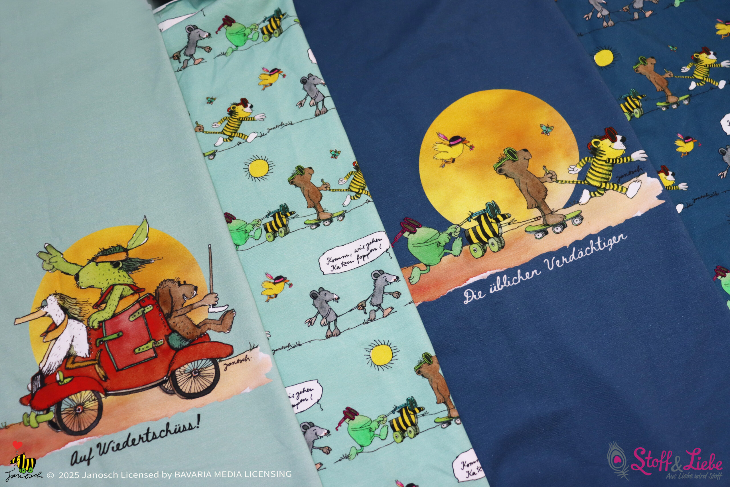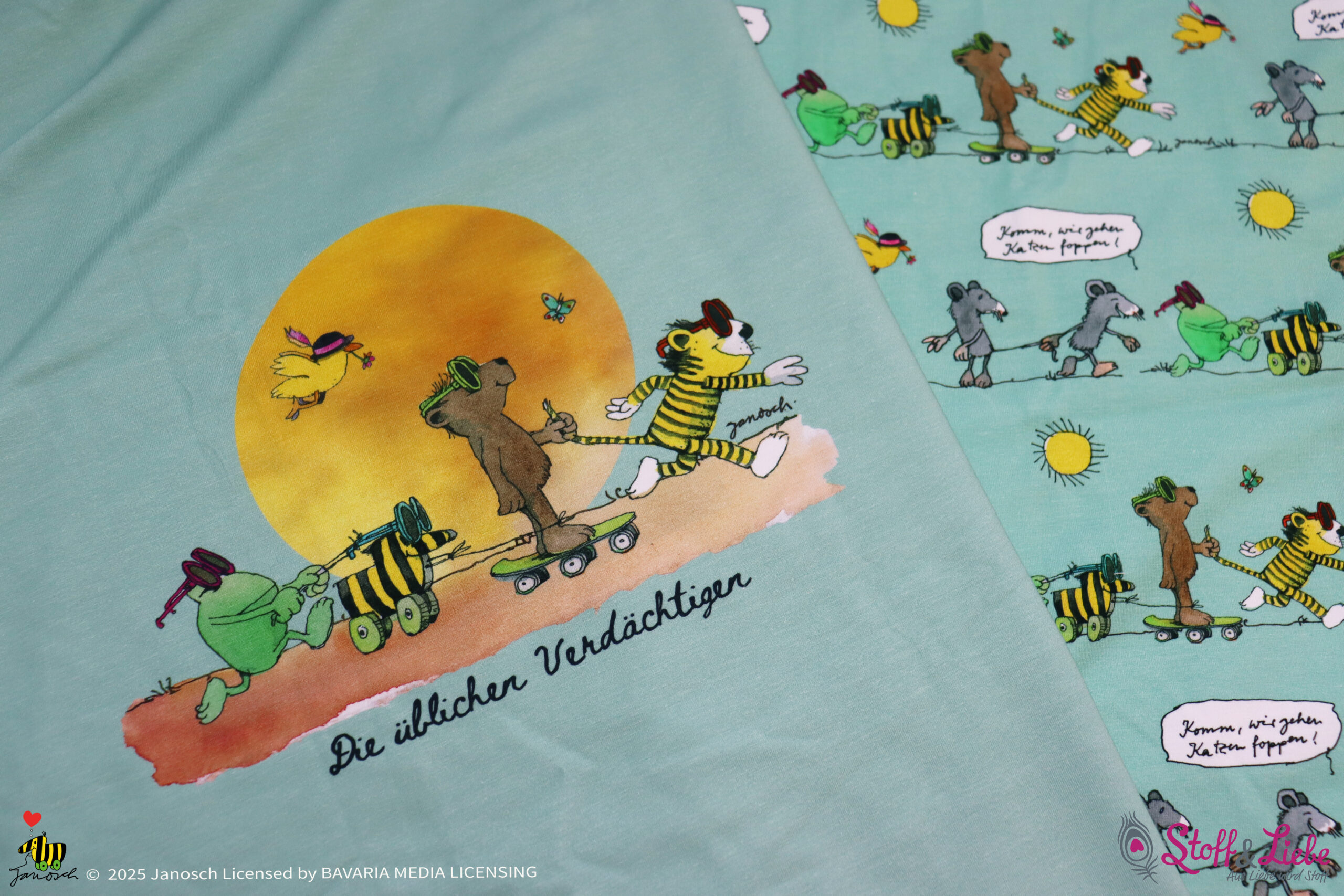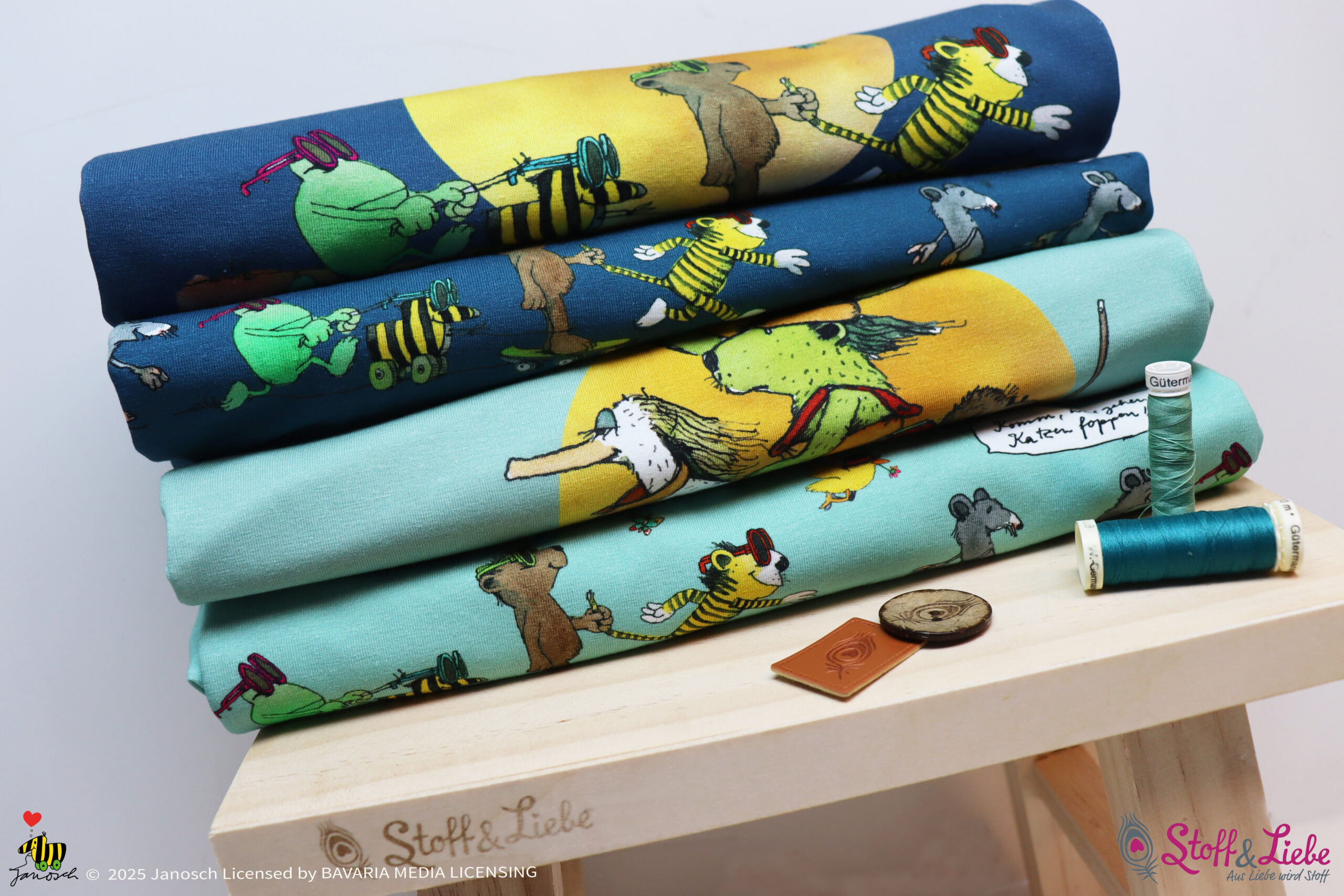 Farblich passend zum Panel gibt es den Allover in Petrolblau und Mint für Euch. Viele Motive gibt es hier zu entdecken. Habt Ihr schon jede Kleinigkeit entdeckt? Die Motive haben eine Höhe von ca. 3 cm (Tigerente mit Brille) und 6 cm (Bär auf Skateboard).