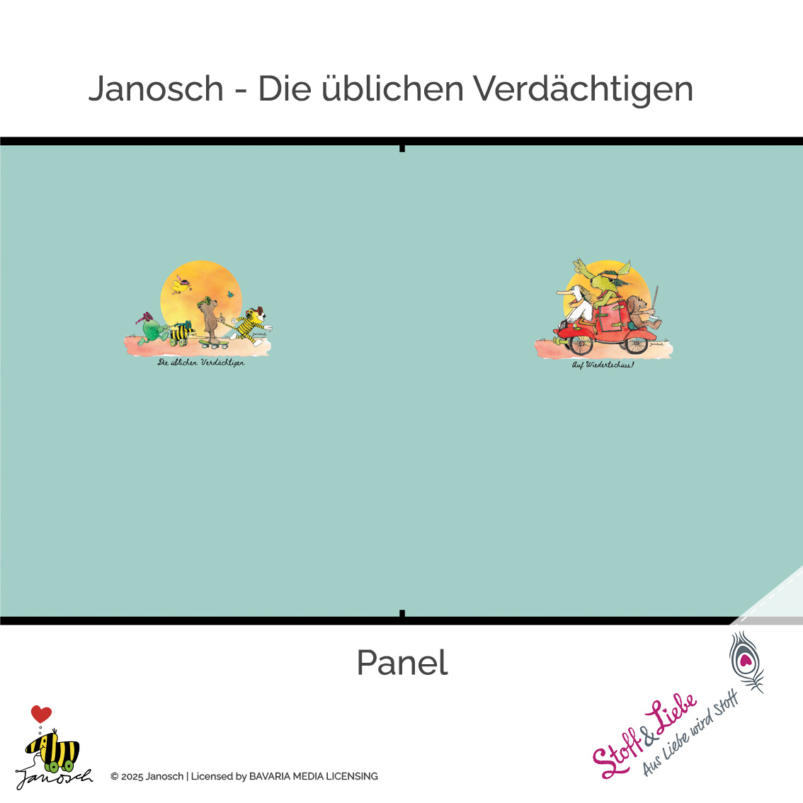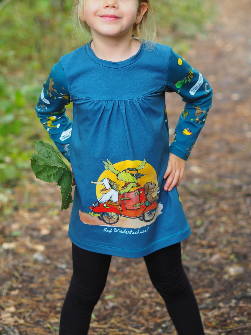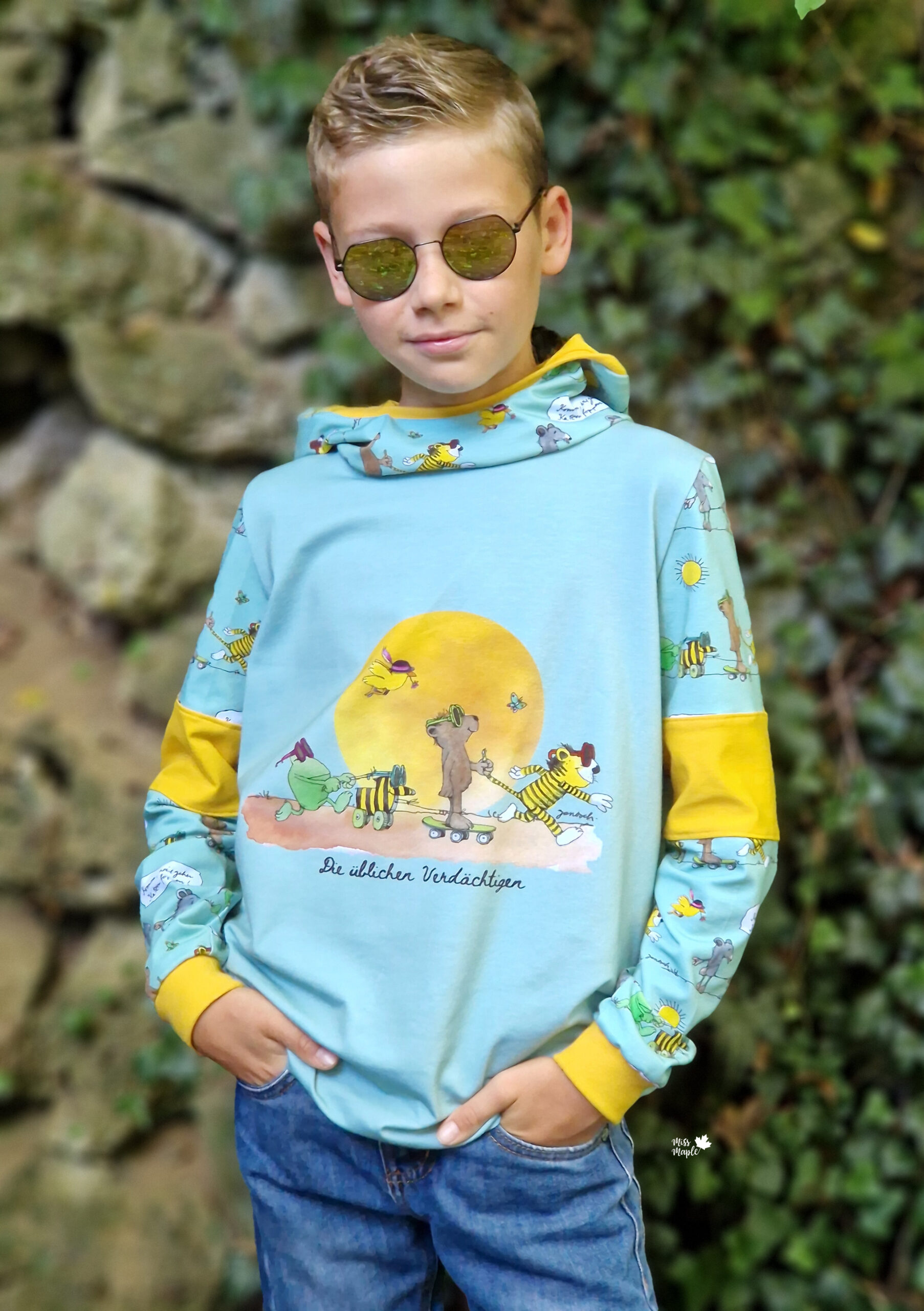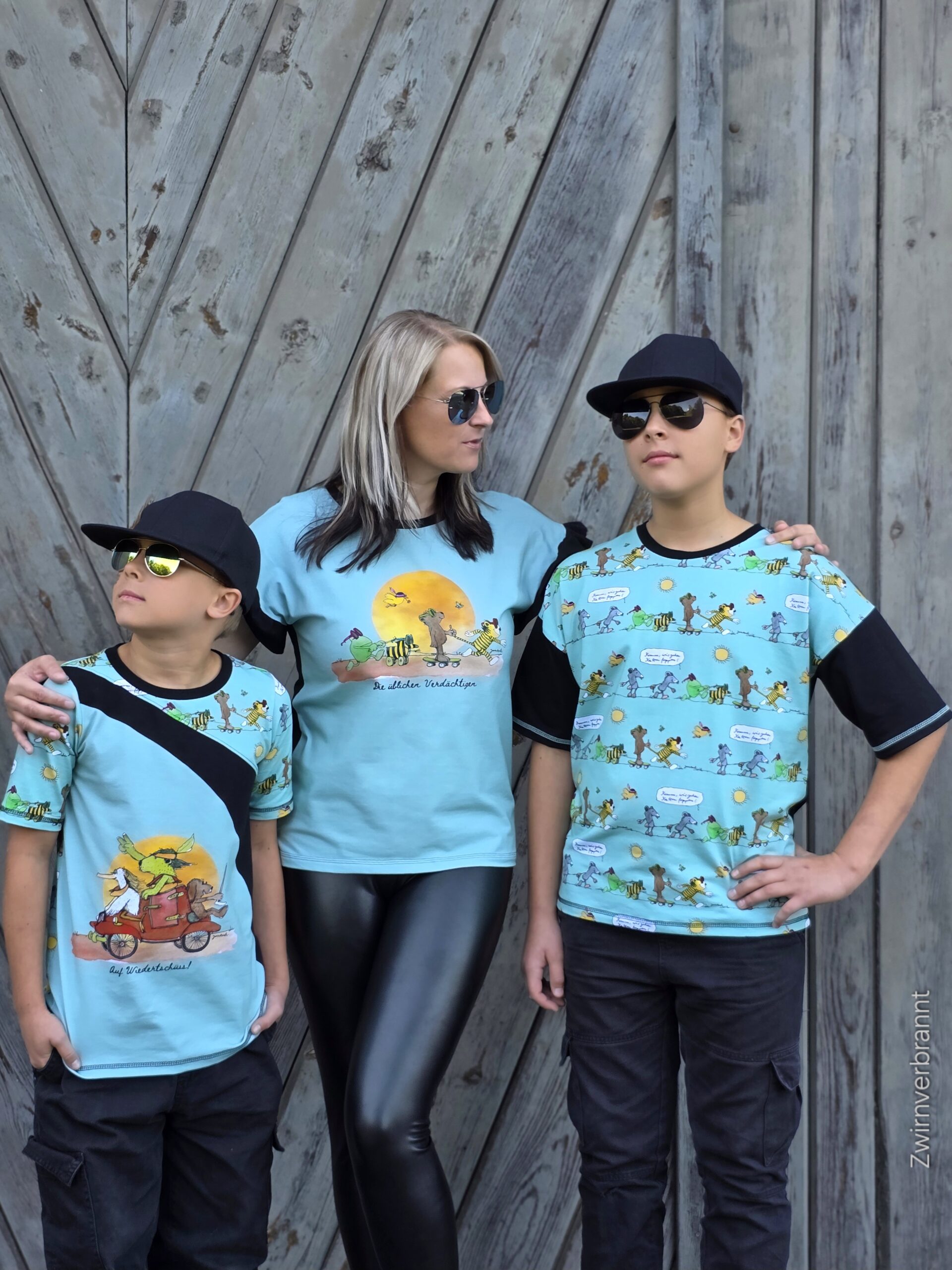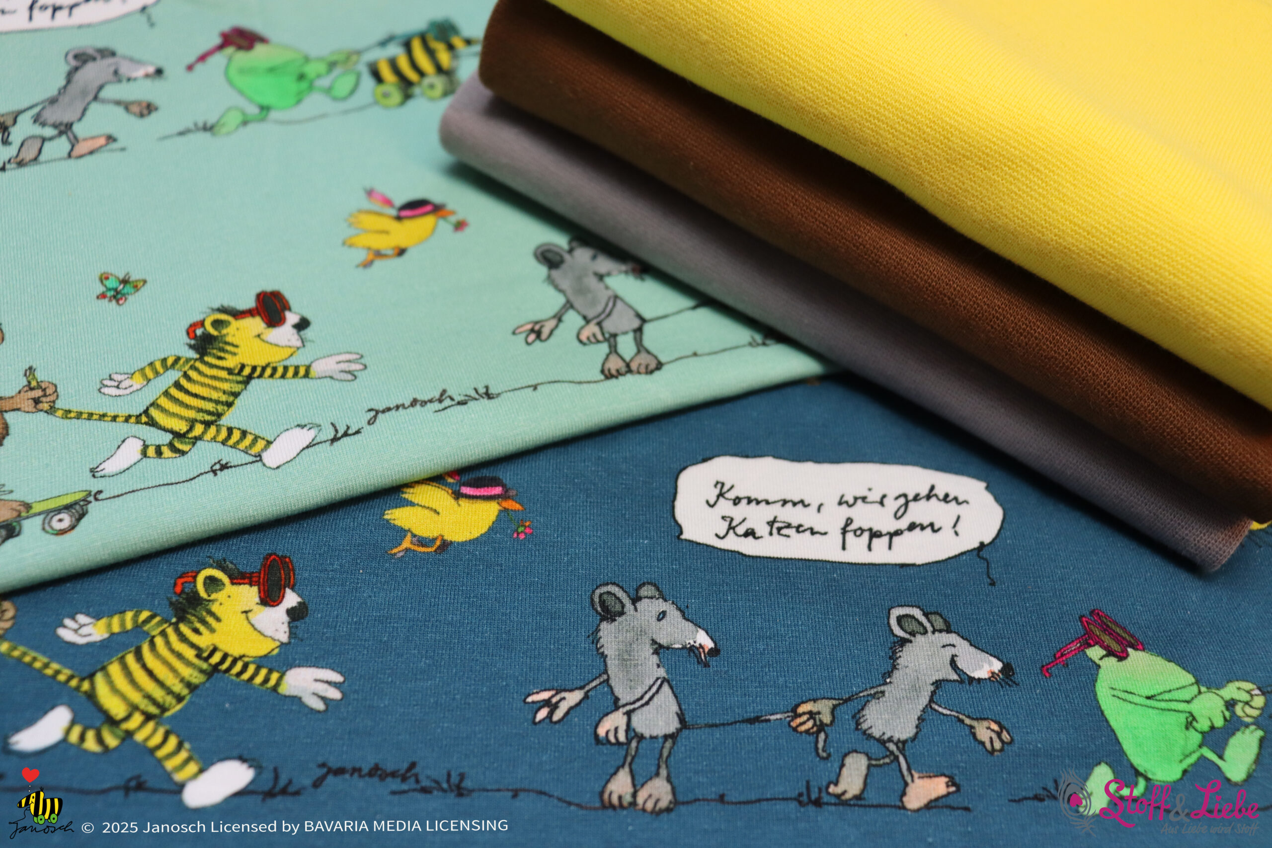 Farblich passend zum Panel gibt es den Allover in Petrolblau und Mint für Euch. Viele Motive gibt es hier zu entdecken. Habt Ihr schon jede Kleinigkeit entdeckt? Die Motive haben eine Höhe von ca. 3 cm (Tigerente mit Brille) und 6 cm (Bär auf Skateboard).