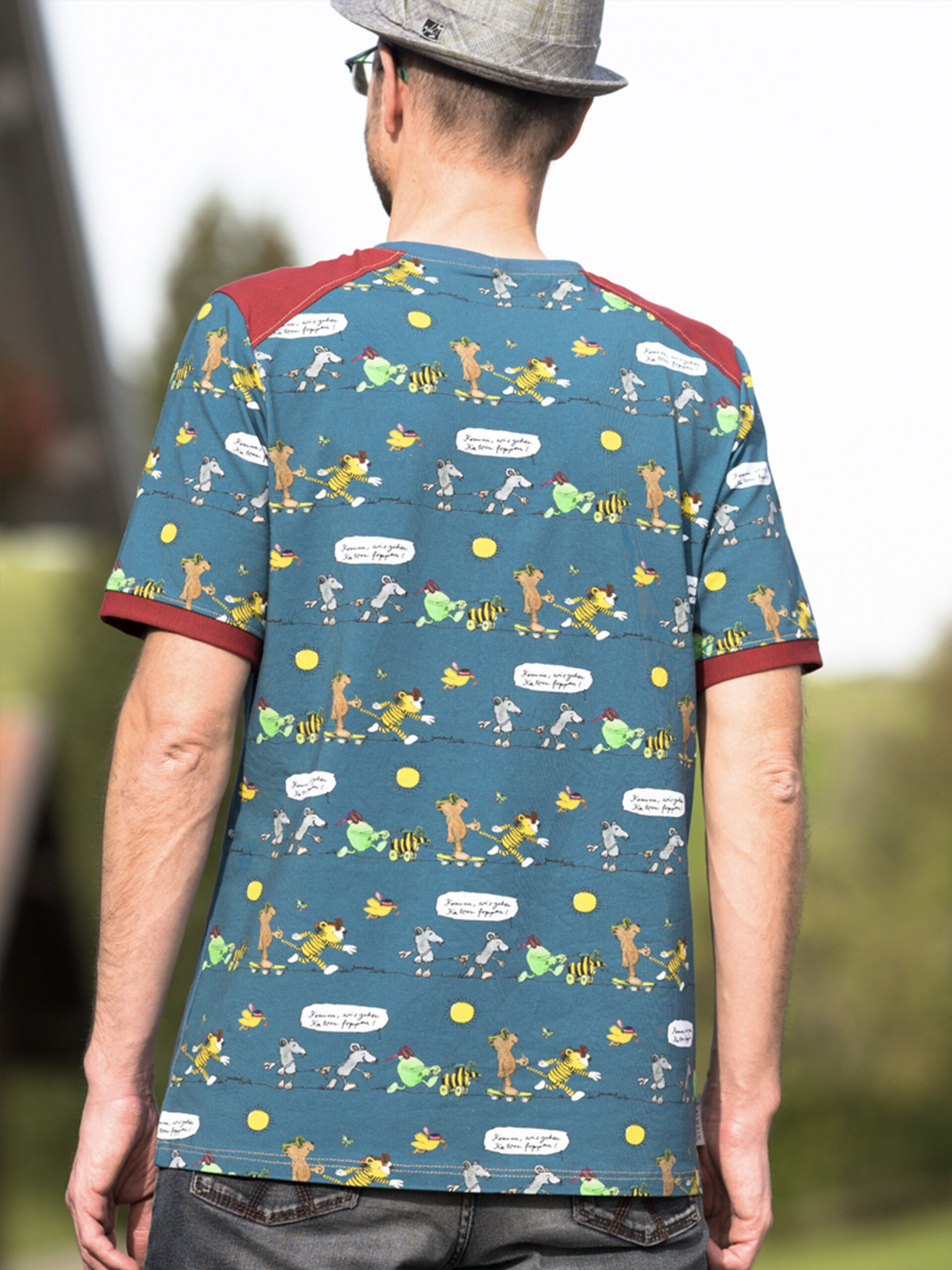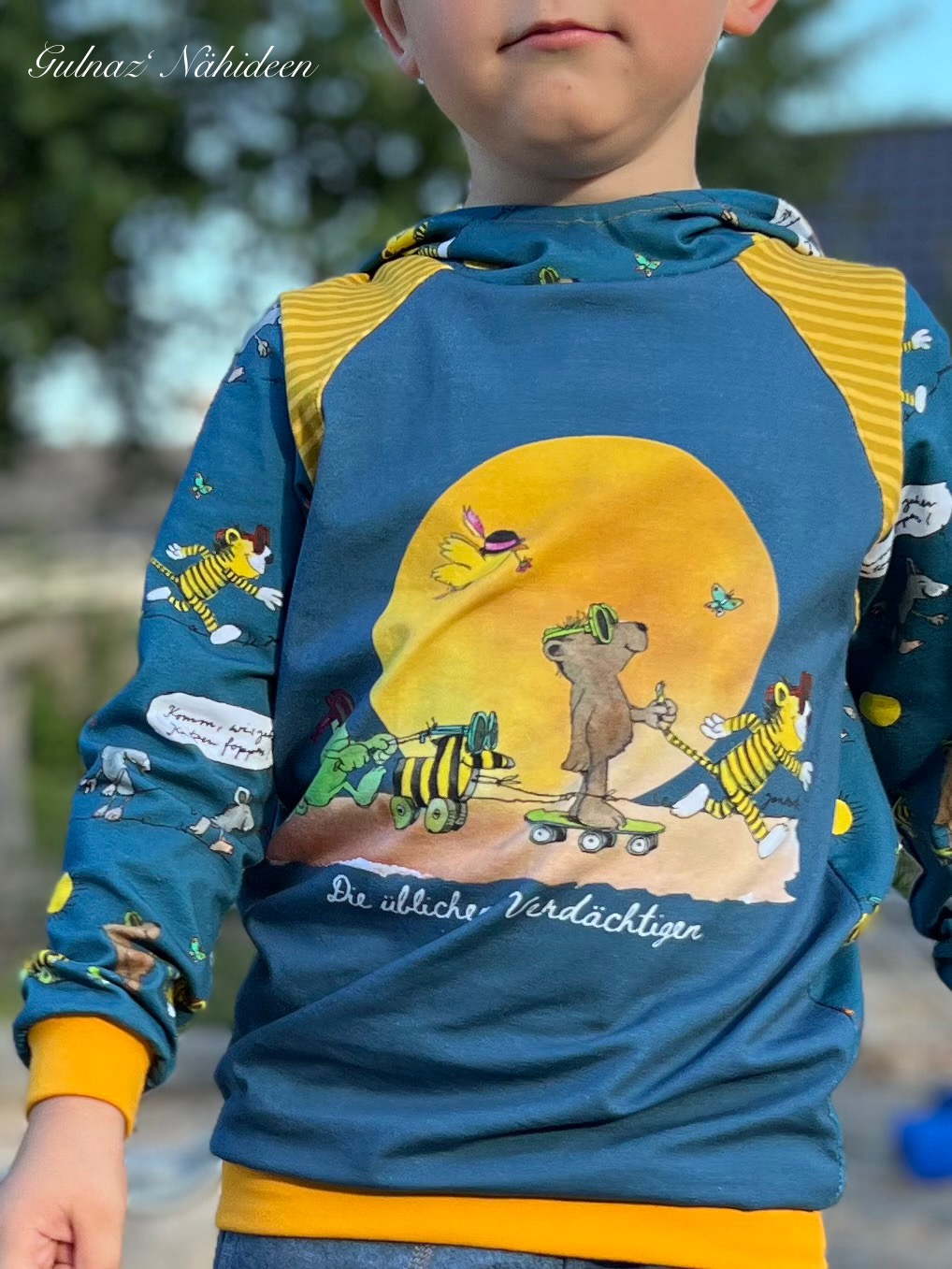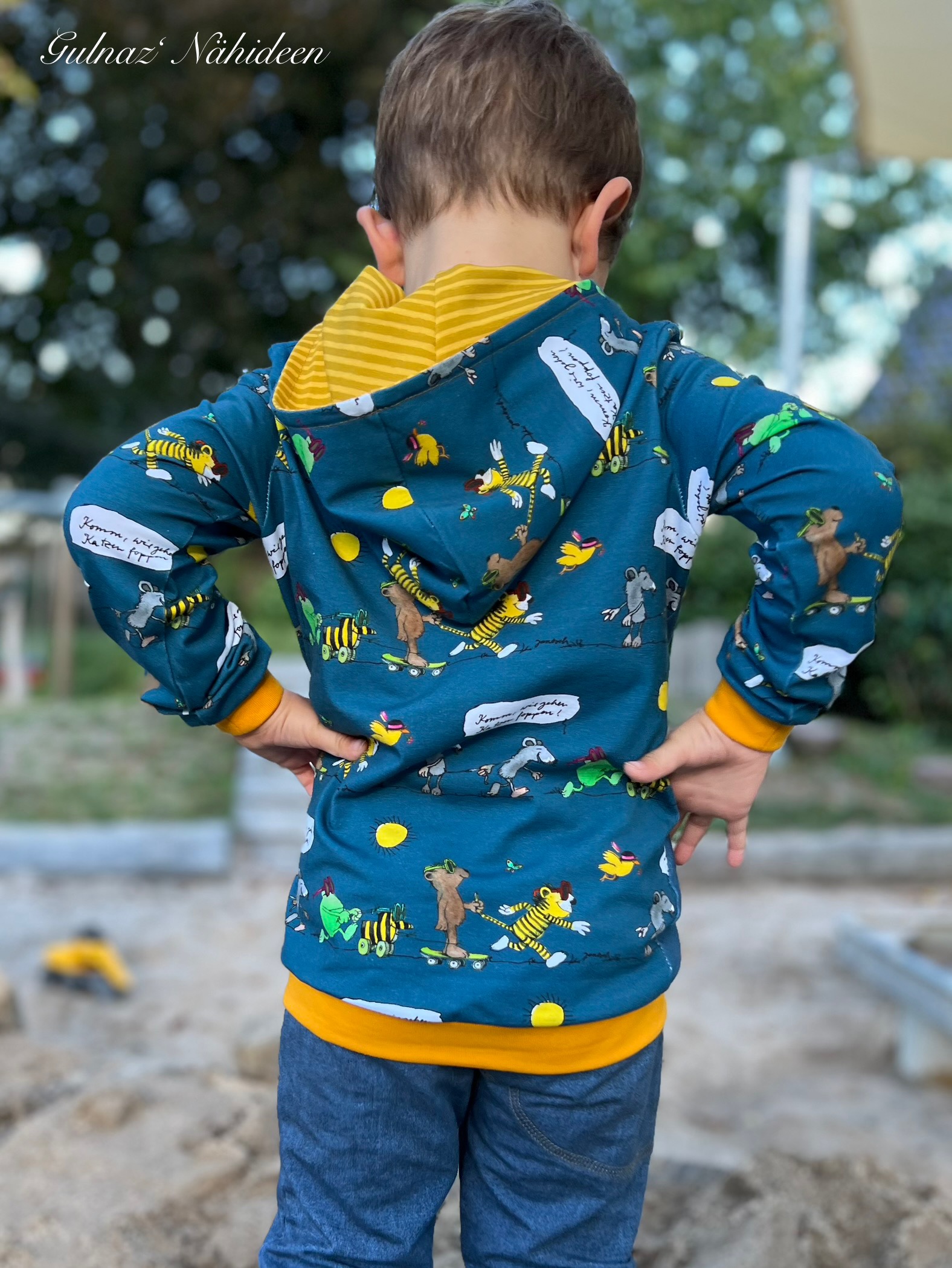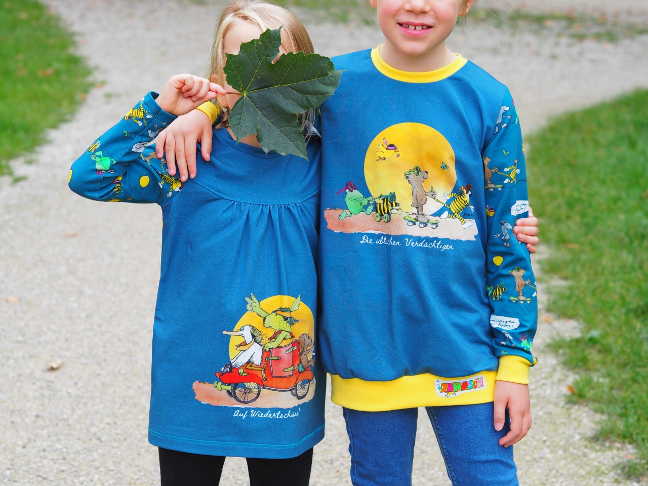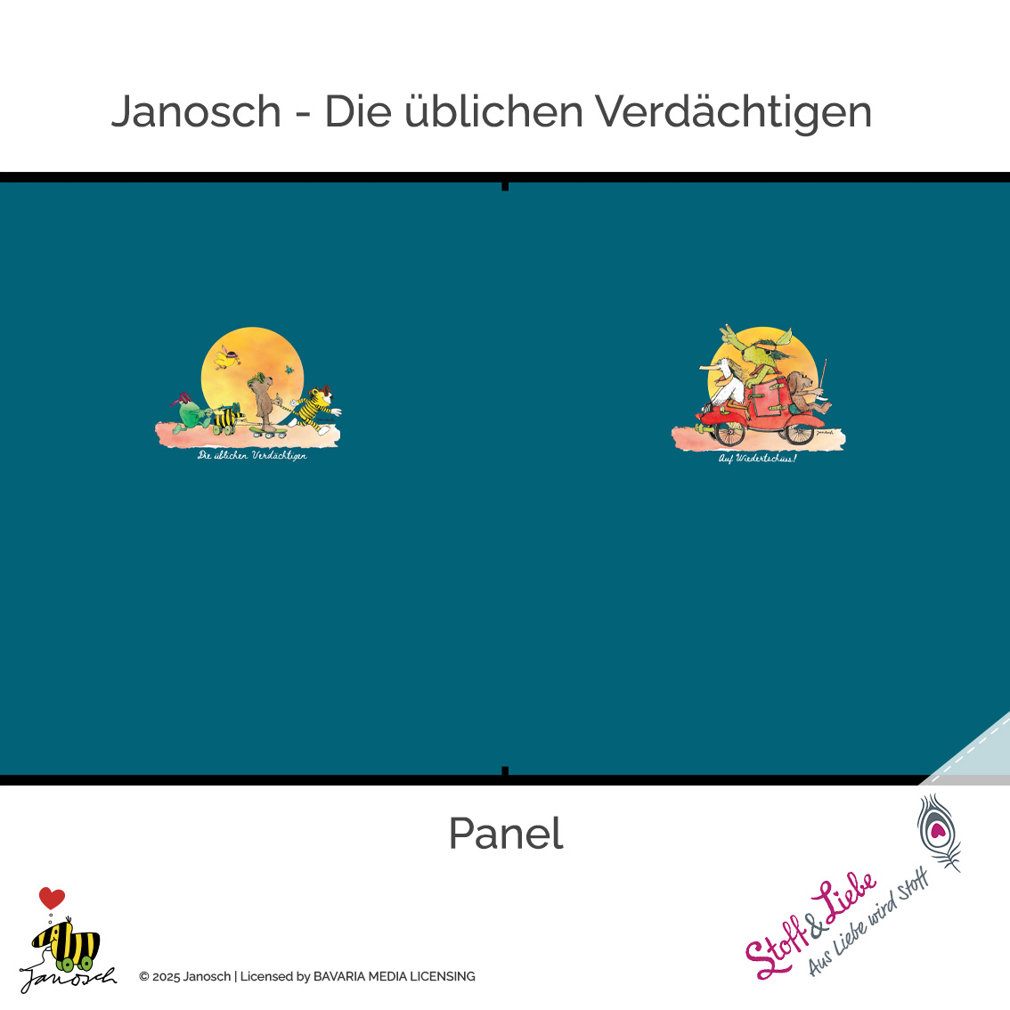 Farblich passend zum Panel gibt es den Allover in Petrolblau und Mint für Euch. Viele Motive gibt es hier zu entdecken. Habt Ihr schon jede Kleinigkeit entdeckt? Die Motive haben eine Höhe von ca. 3 cm (Tigerente mit Brille) und 6 cm (Bär auf Skateboard).