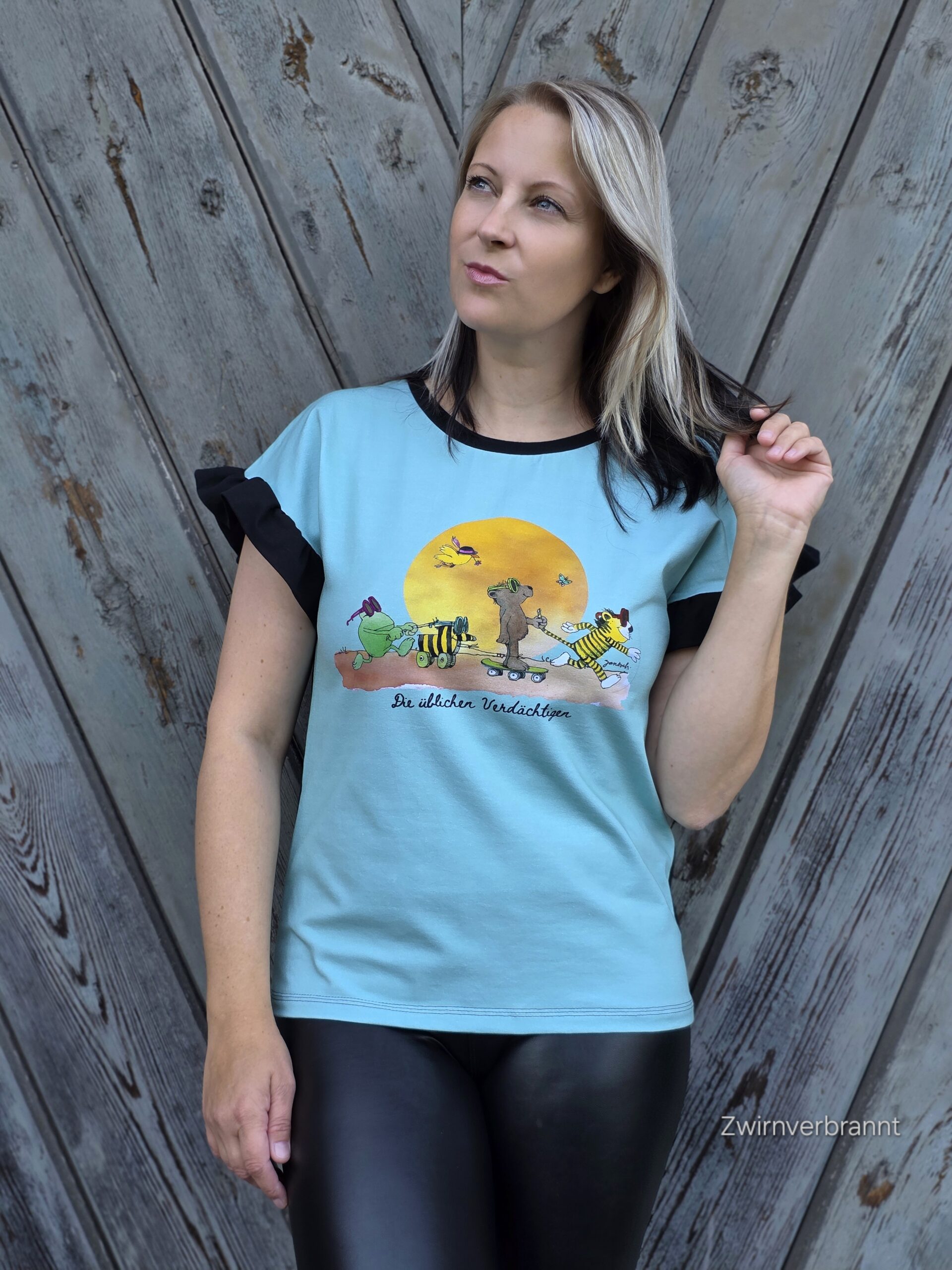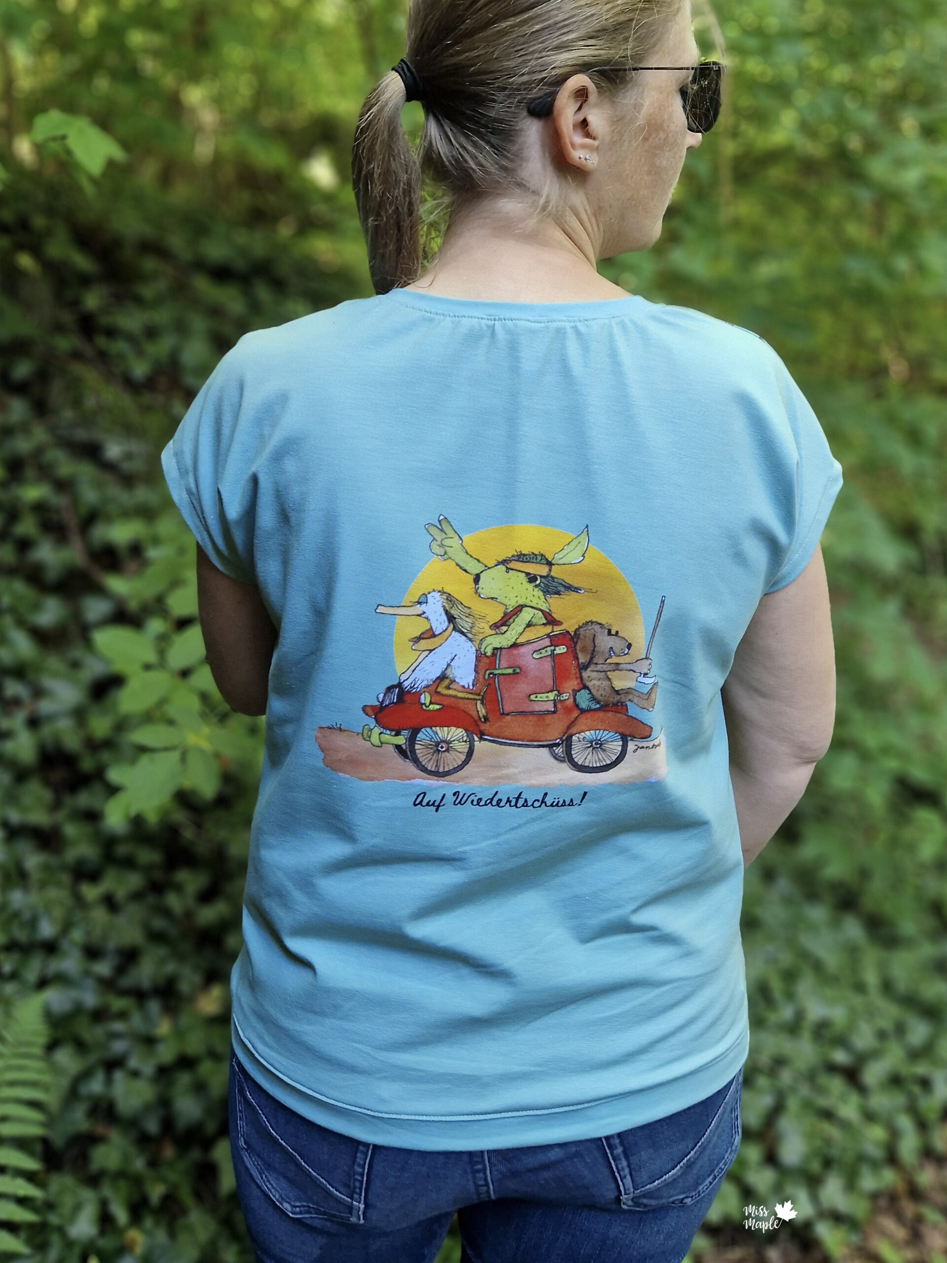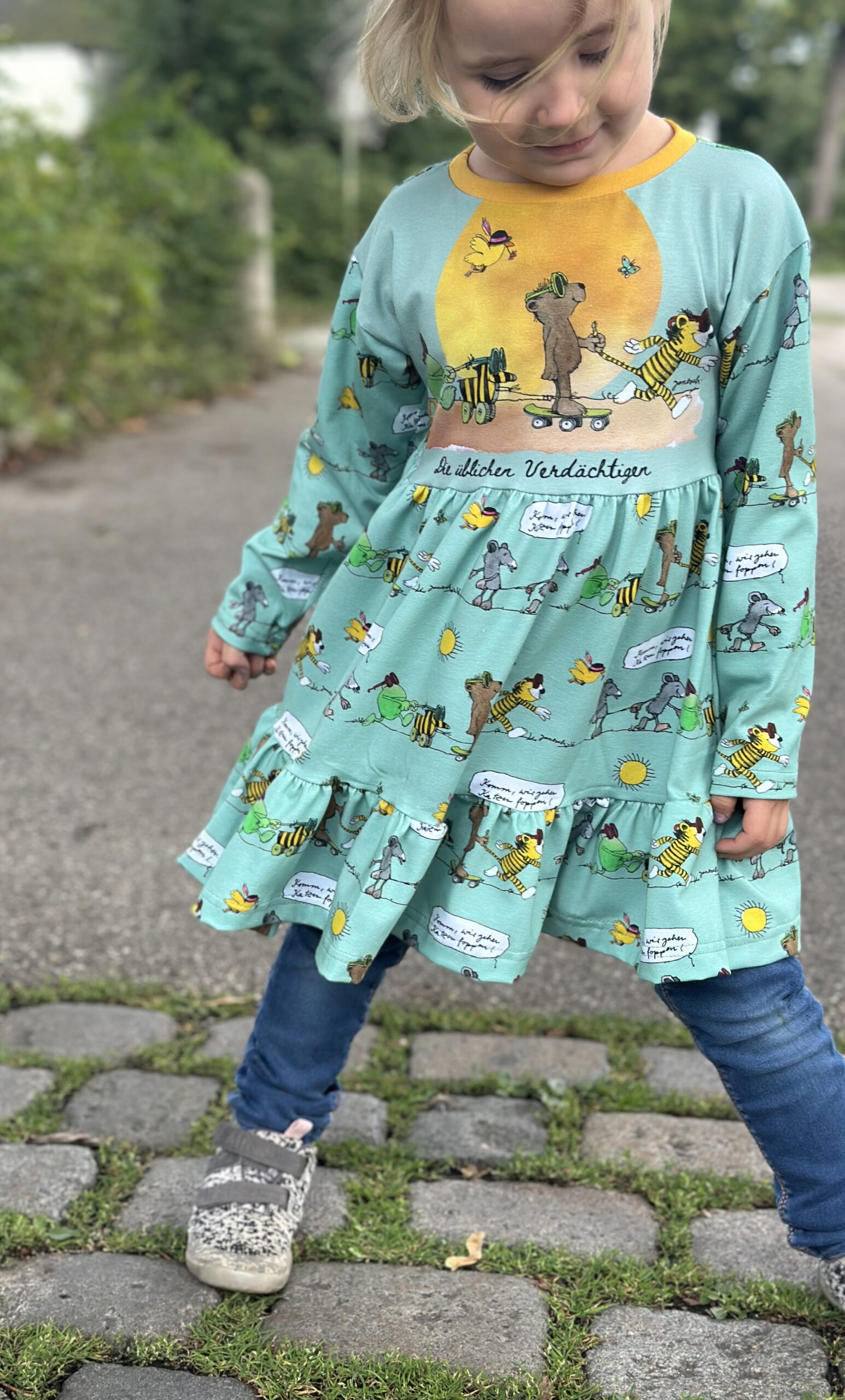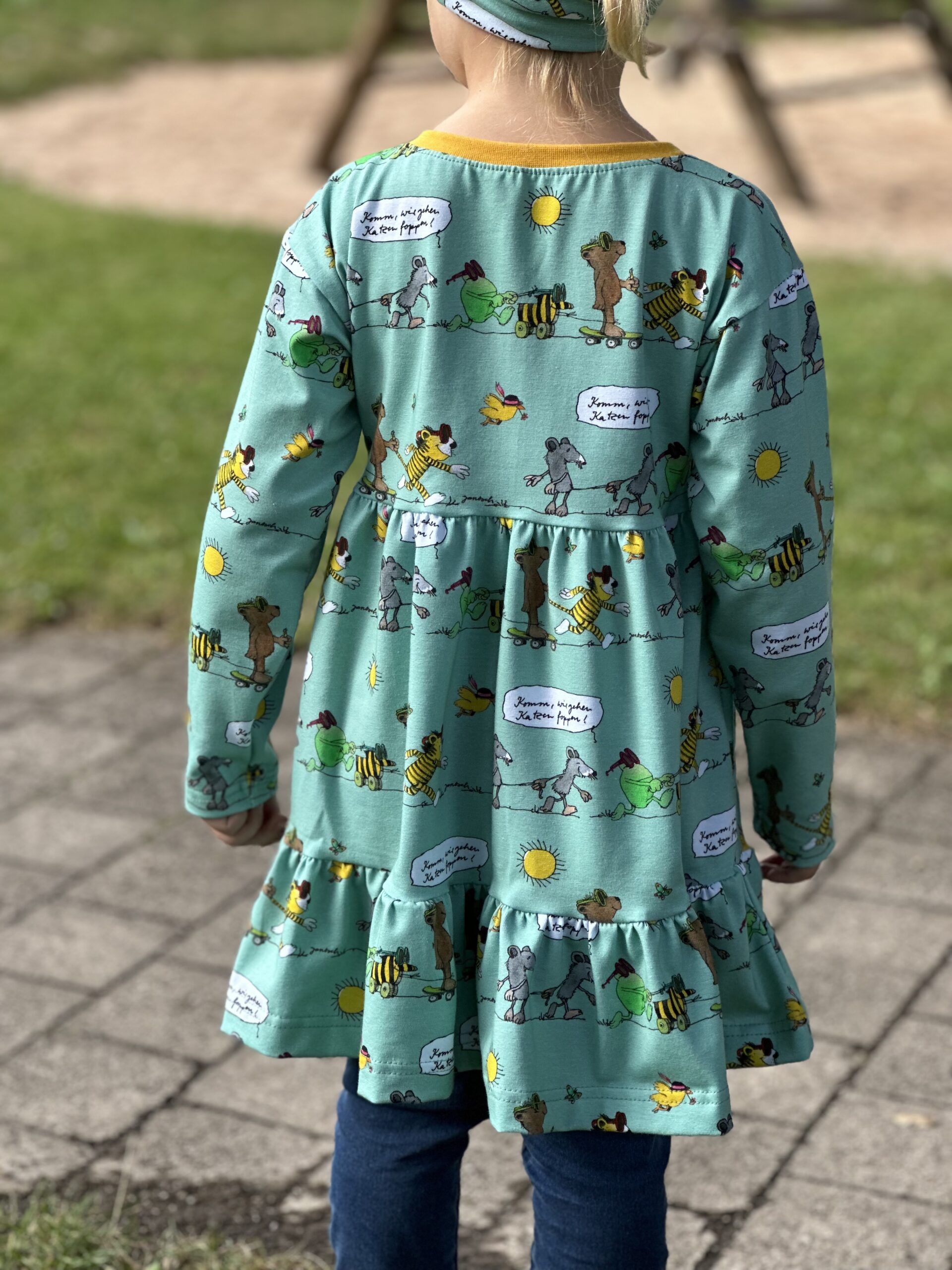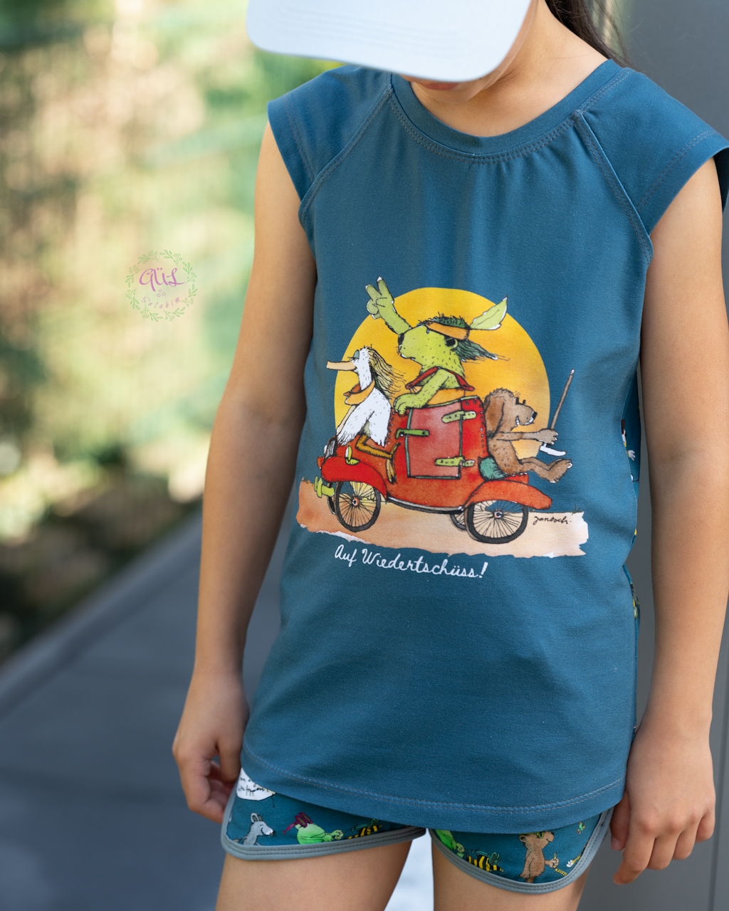 Farblich passend zum Panel gibt es den Allover in Petrolblau und Mint für Euch. Viele Motive gibt es hier zu entdecken. Habt Ihr schon jede Kleinigkeit entdeckt? Die Motive haben eine Höhe von ca. 3 cm (Tigerente mit Brille) und 6 cm (Bär auf Skateboard).