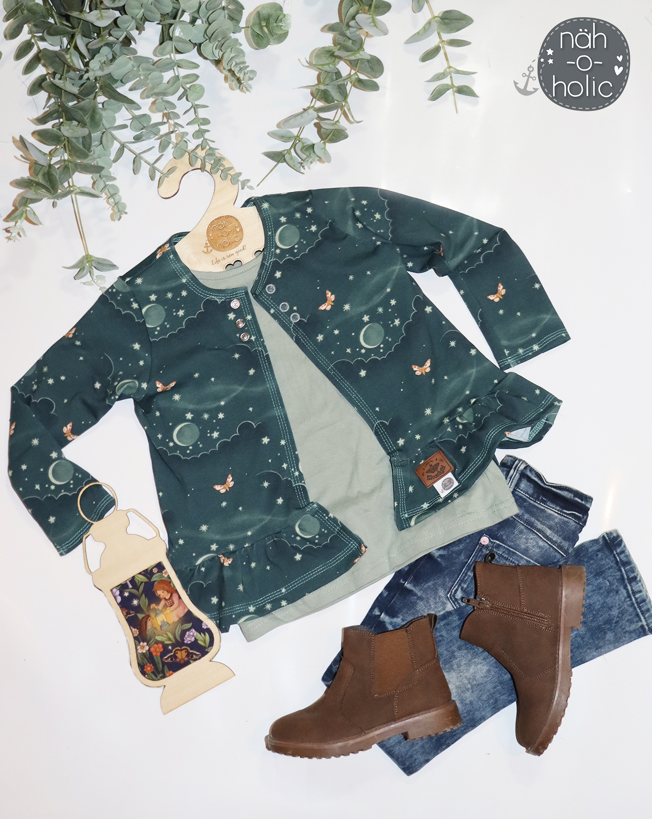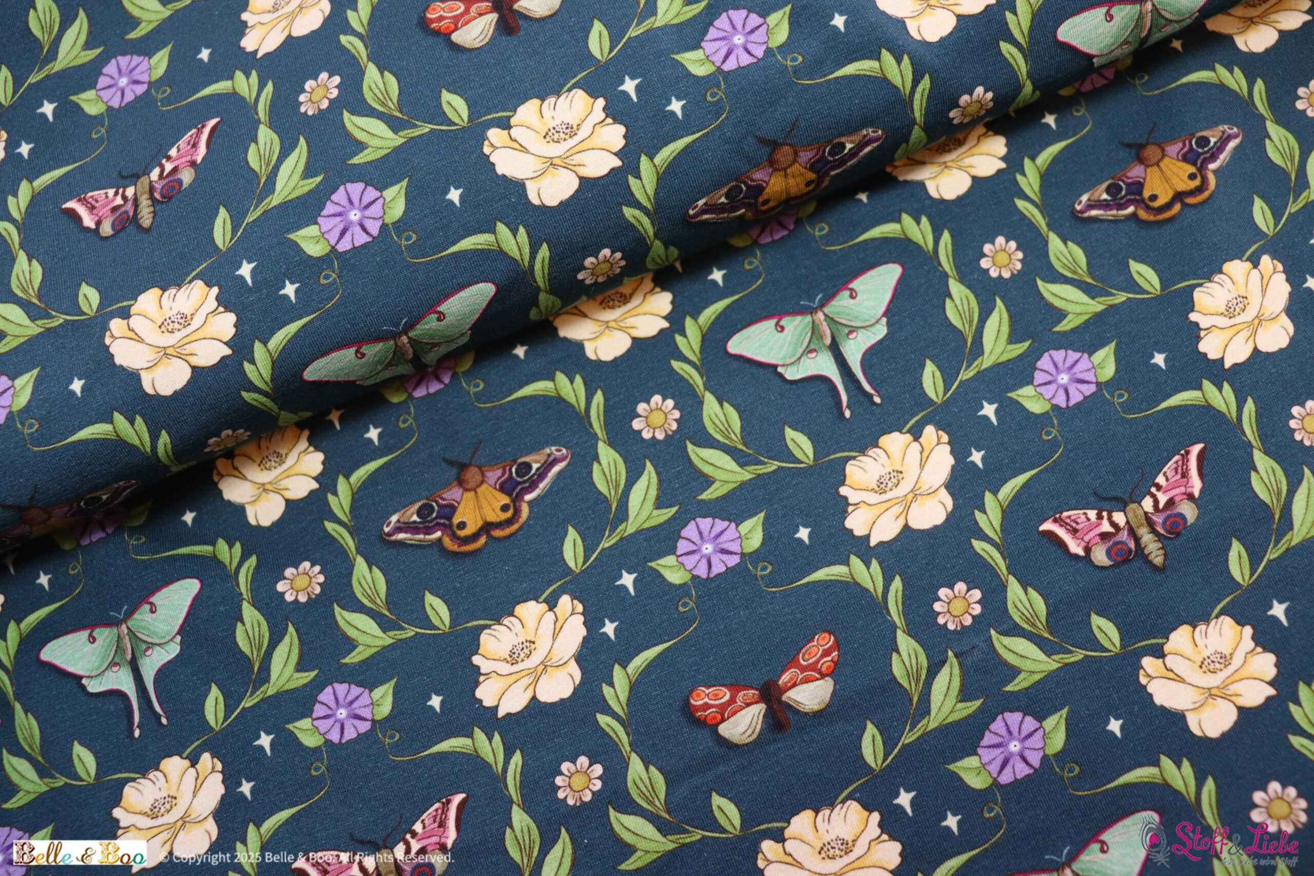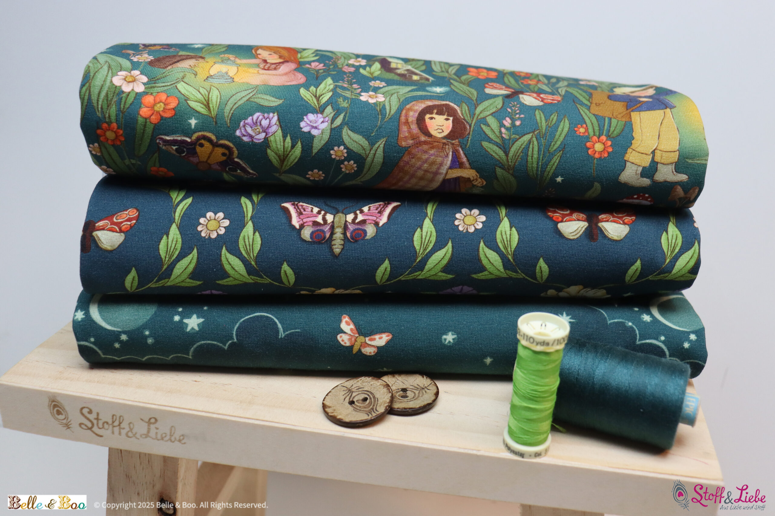 Die Kollektion besteht aus: drei verschiedenen Allovern, diesmal in der Farbvariante Dark Teal. Alle Stoffe sind perfekt aufeinander abgestimmt und können sowohl einzeln als auch in Kombination vernäht werden. Ihr werdet begeistert sein. Das Design Nachtwanderung kennt Ihr schon, Nachtblüte und Nachthimmel sind gänzlich neu dazu gekommen.