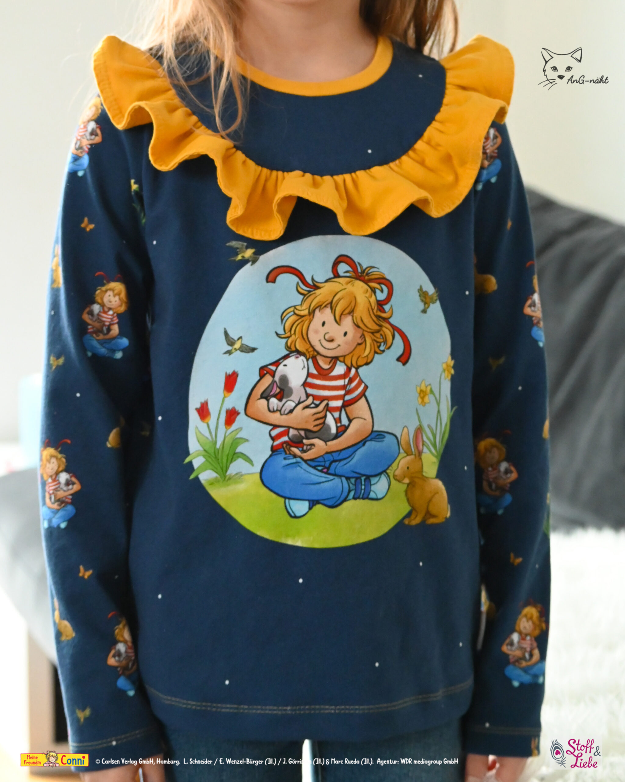 Der Allover ist ebenso detailreich gestaltet wie das Panel und wahnsinnig vielfältig vernähbar. Die Motive haben hier eine Höhe von ca. 3 cm (Hase) und Conni ca. 6 cm.