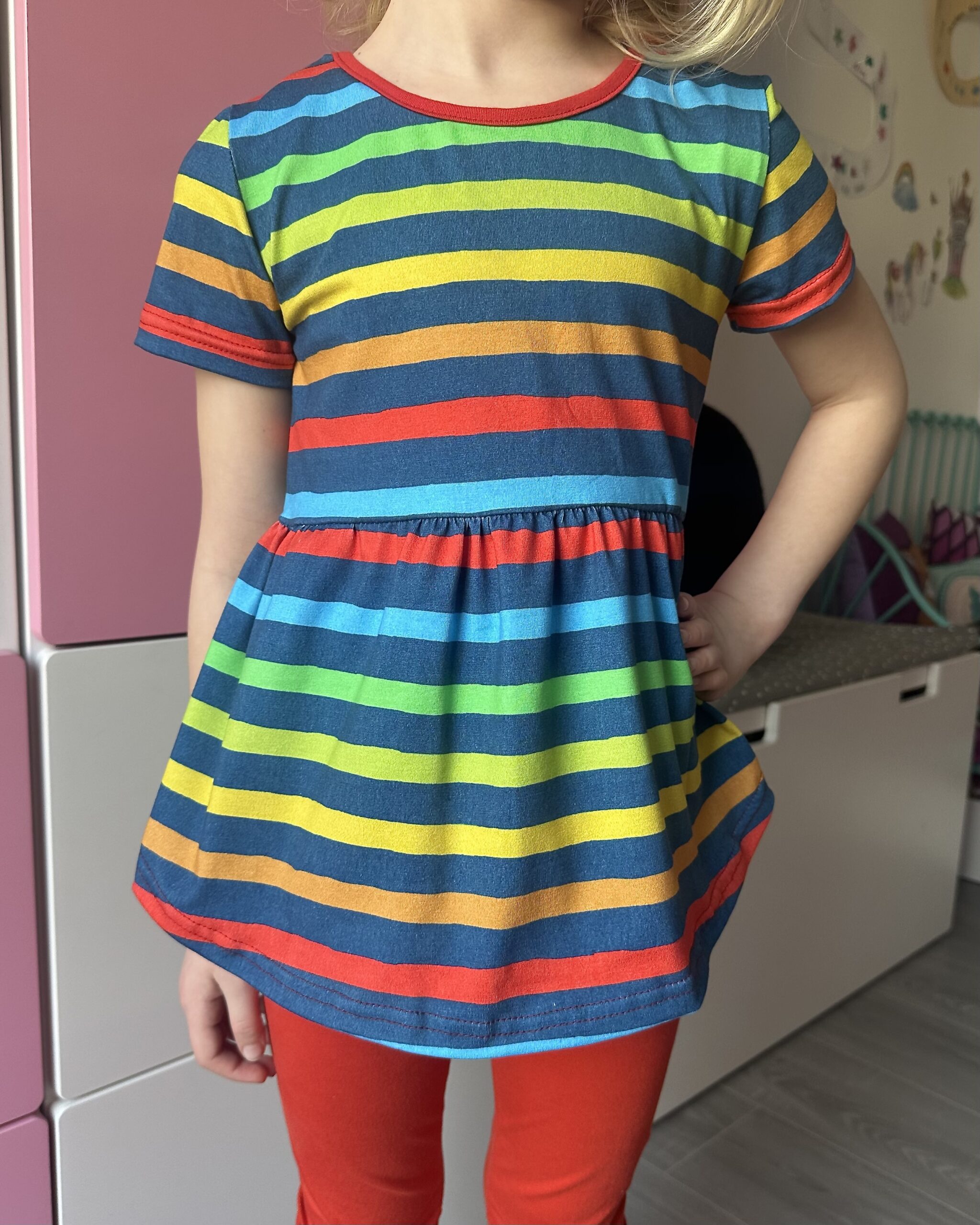 Auch auf die Gefahr hin, dass wir uns wiederholen! Ohne Streifen ohne uns! Wie wunderschön ist bitte das Design „Bunt gestreift“? Ebenfalls in Jeansoptik gehalten und kombiniert mit den Farben des Regenbogens. Perfekt zu den Stoffen dieser Kollektion, aber wie immer auch Solo vernäht, einfach traumhaft.